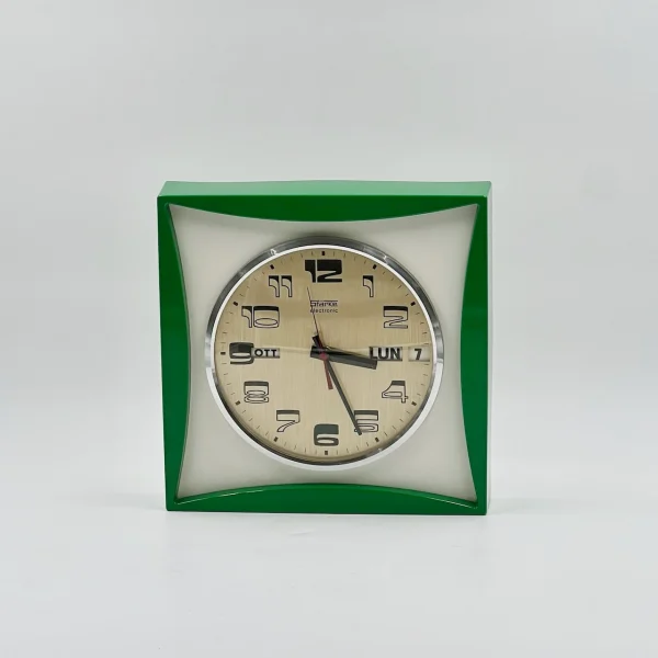 item. wall clock.maker. Starkeperiod. 1960/70scountry. Italy / Francematerial. metal, plasticcolor. green, off white, golddimensions (cm). 27.5 x 27.5 x 6condition. excellent vintage conditions. small superficial scratches and slight yellowing of the calendar display reflect its age, only enhancing its charm. Traces of the original adhesive on the back and edges of the dial are barely noticeable when the clock is hung.art. no. 1562