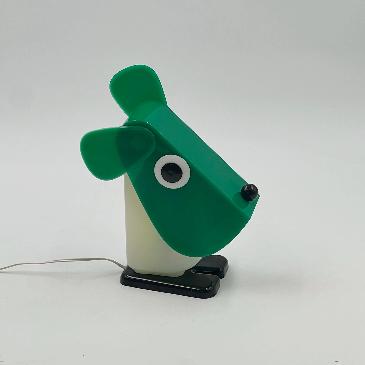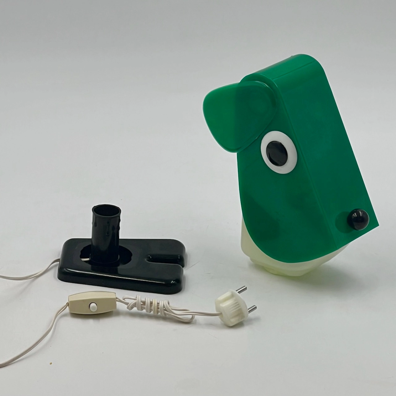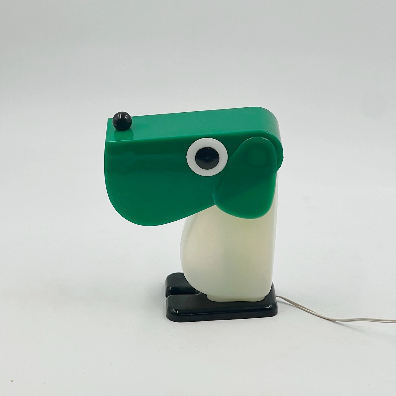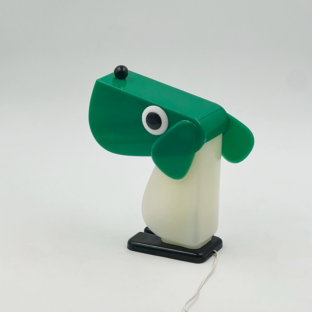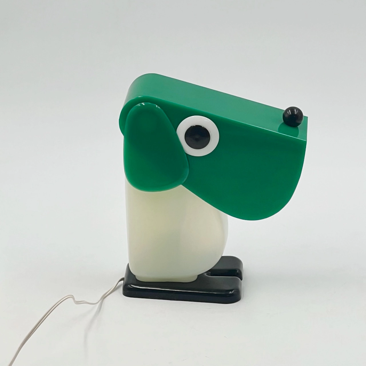 Rufus the Dog 70s plastic lamp by Fernando Cassetta for Tacman Manara. A rare vintage design icon in green, white, and black, perfect for collectors.