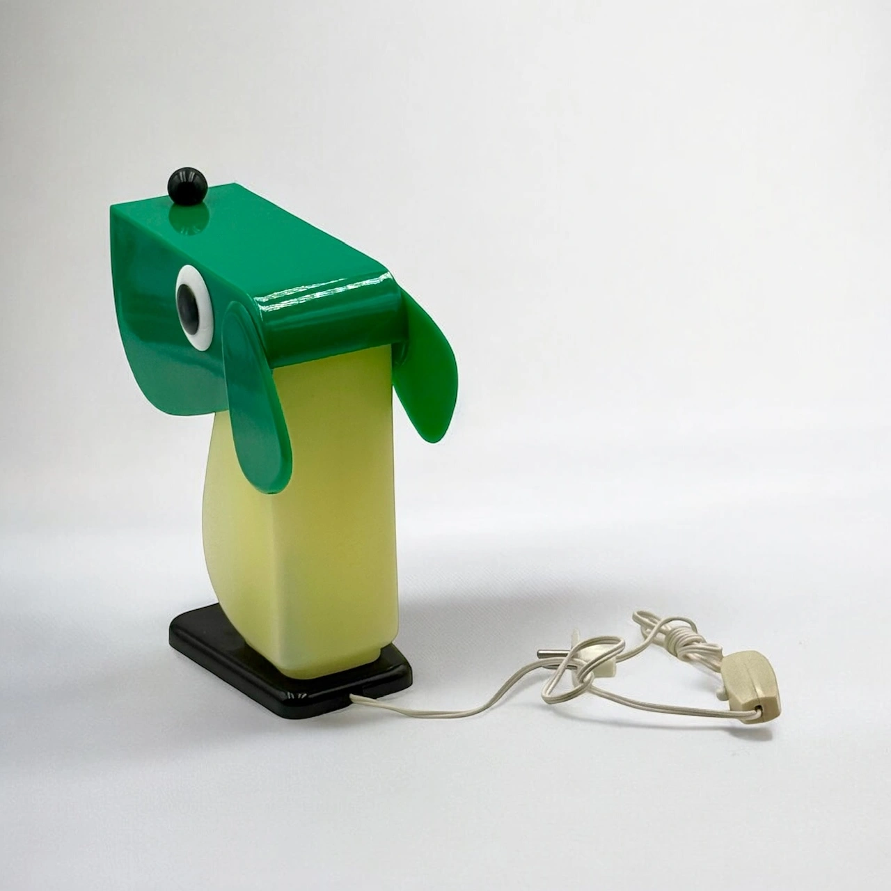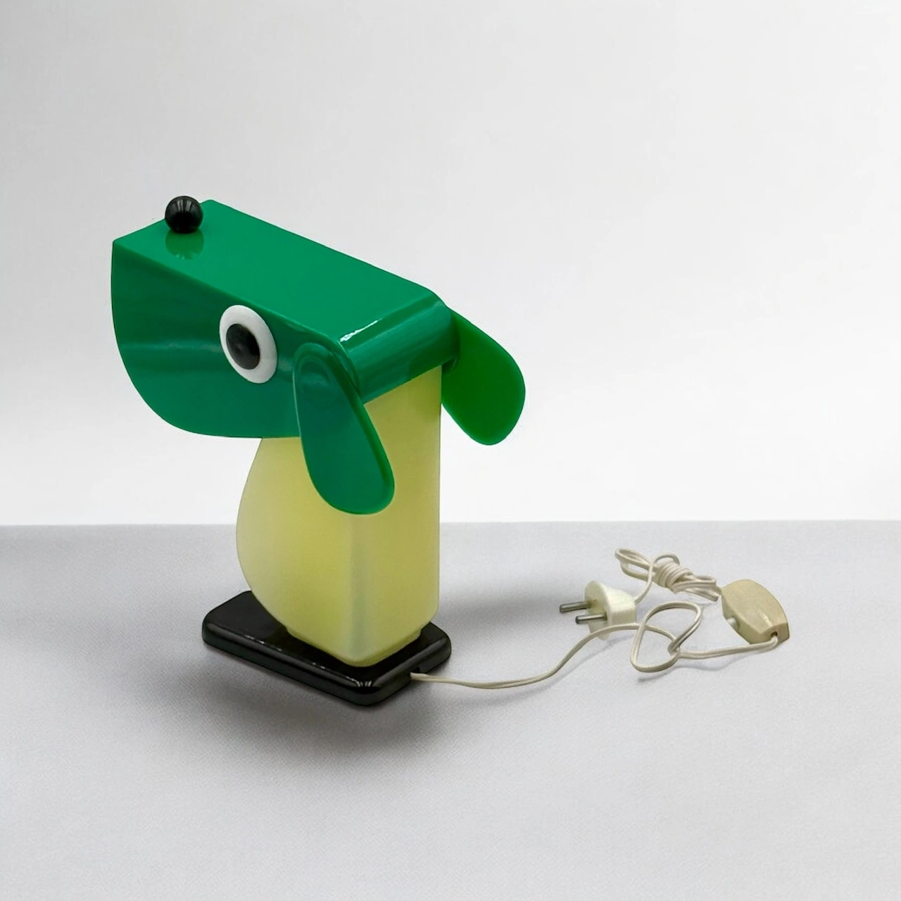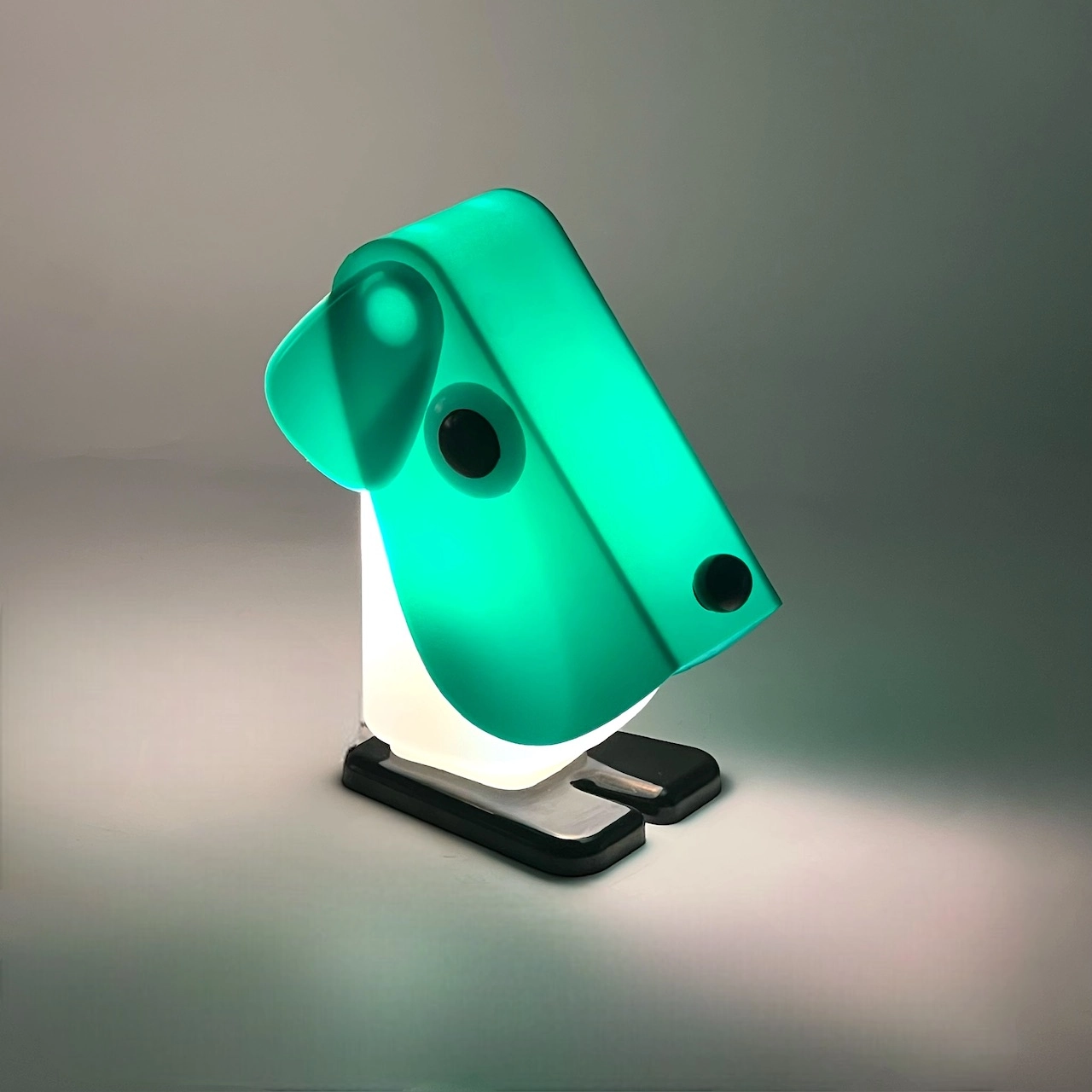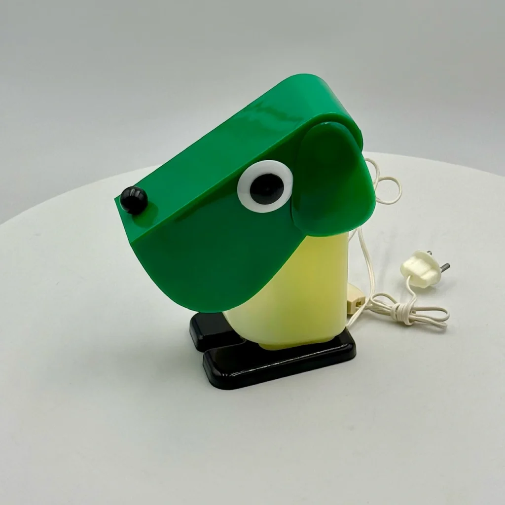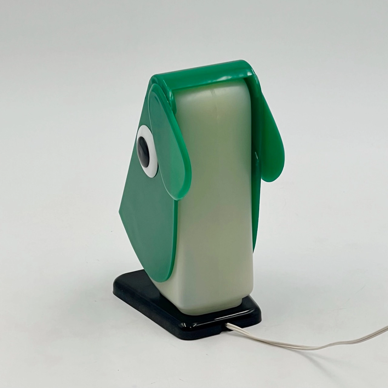 Rufus the Dog 70s plastic lamp by Fernando Cassetta for Tacman Manara. A rare vintage design icon in green, white, and black, perfect for collectors.