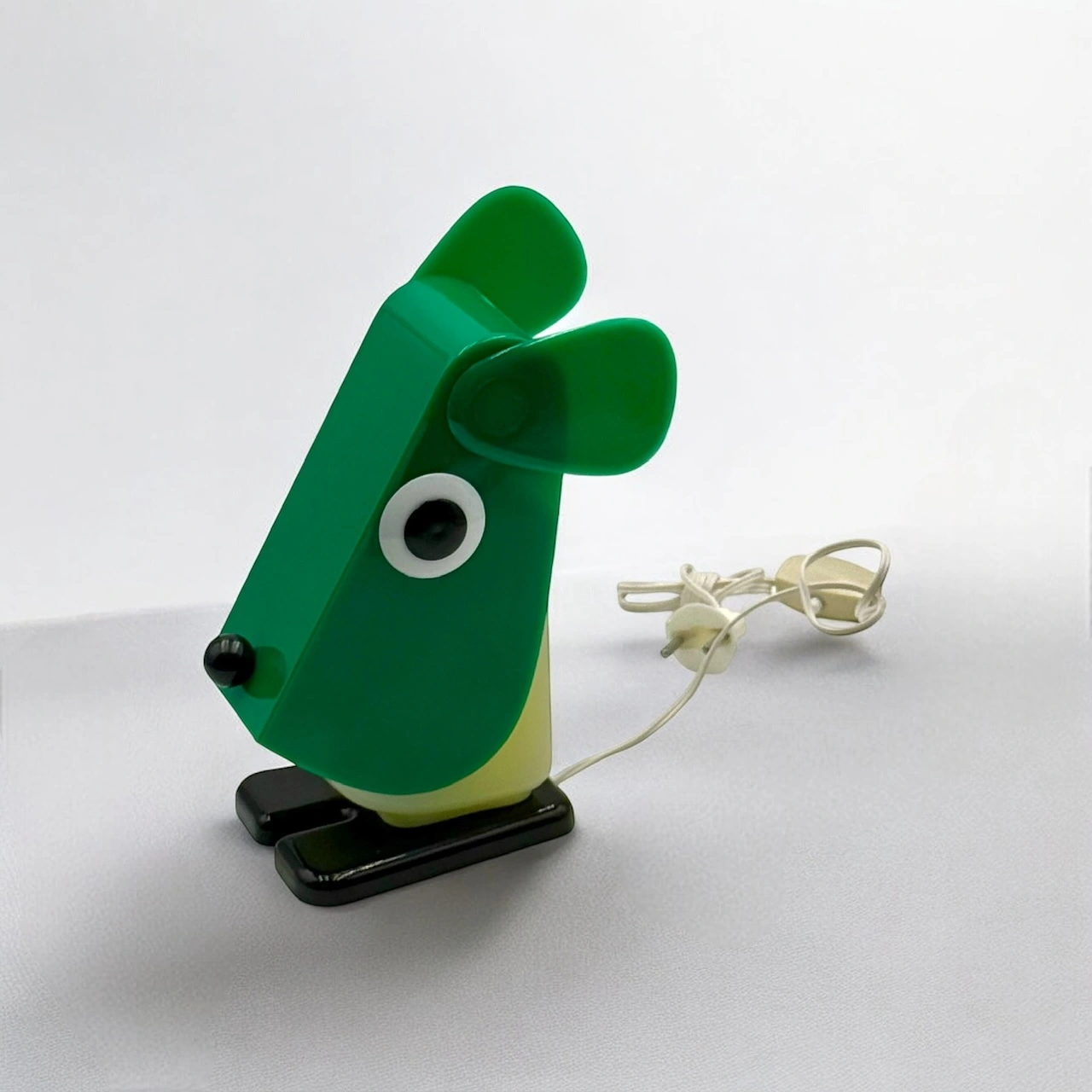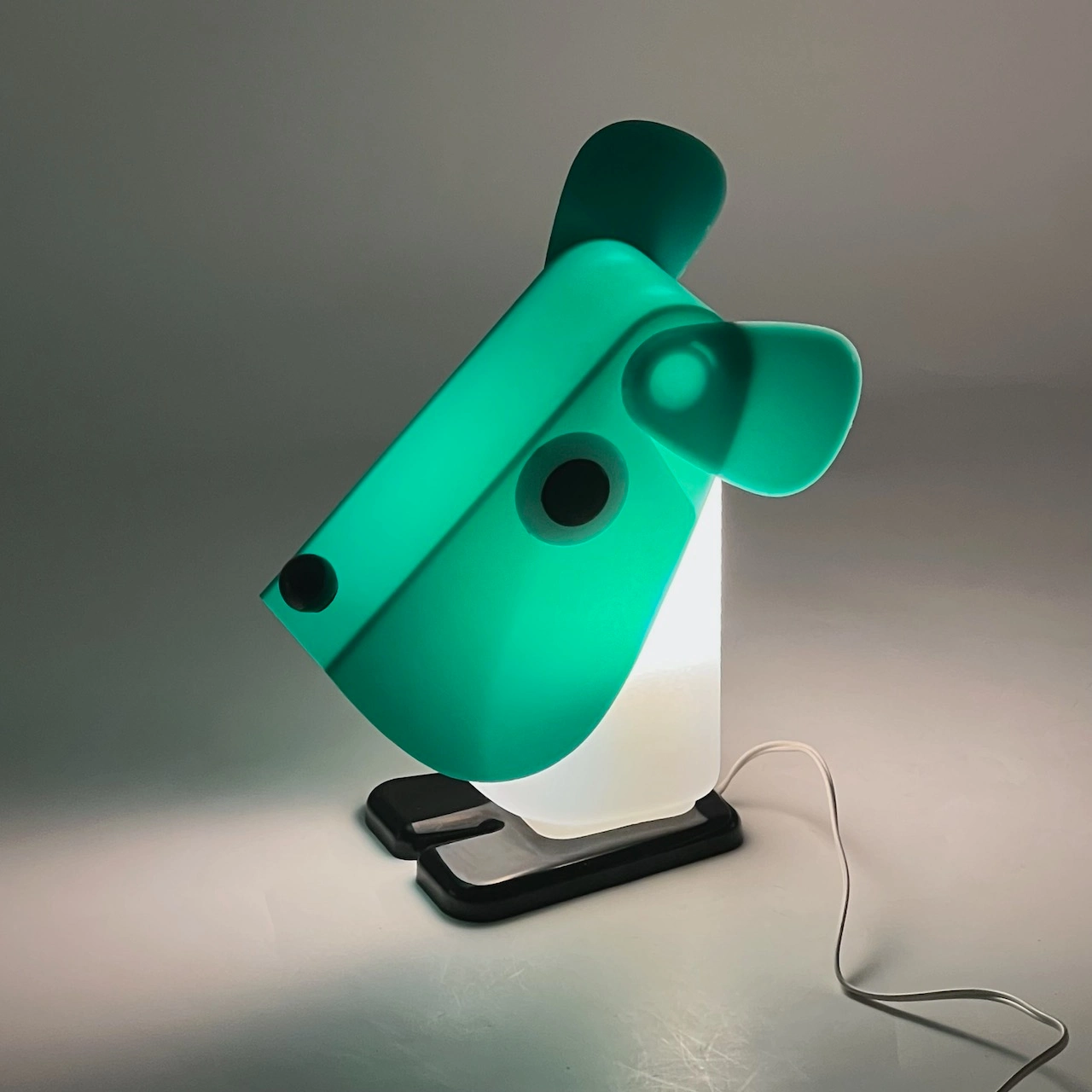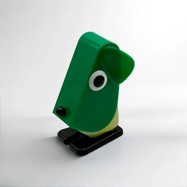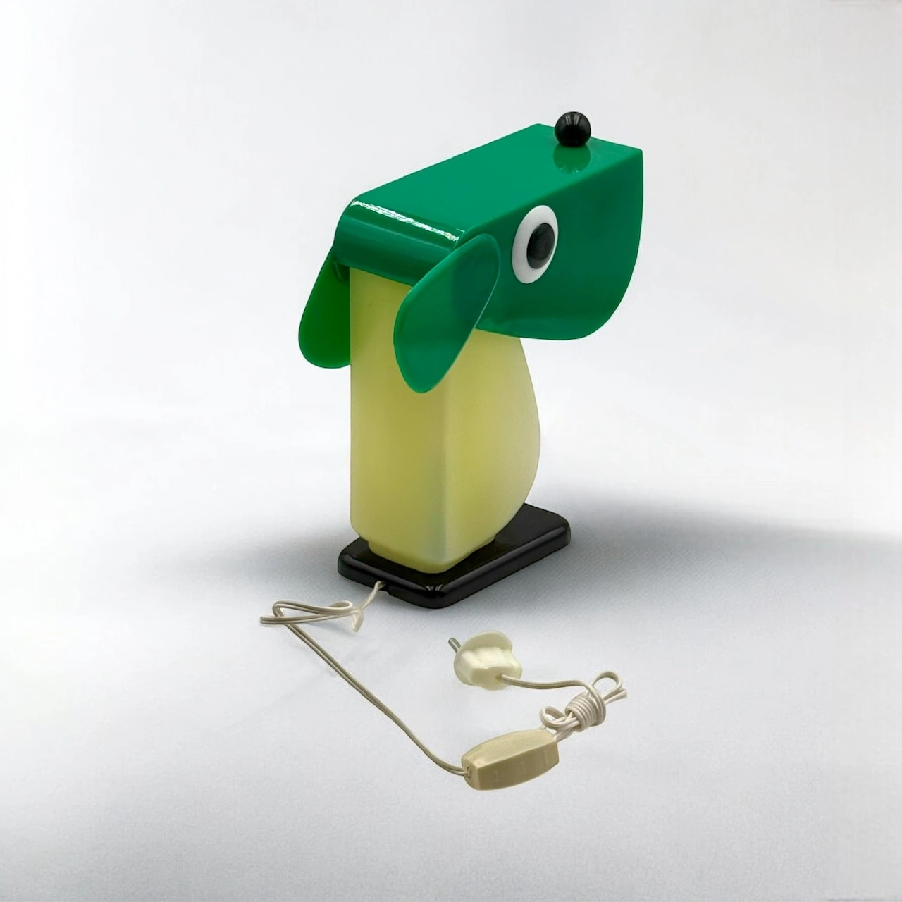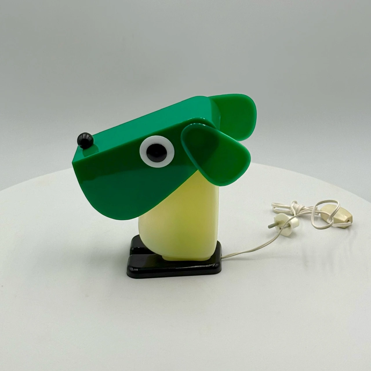 Rufus the Dog 70s plastic lamp by Fernando Cassetta for Tacman Manara. A rare vintage design icon in green, white, and black, perfect for collectors.