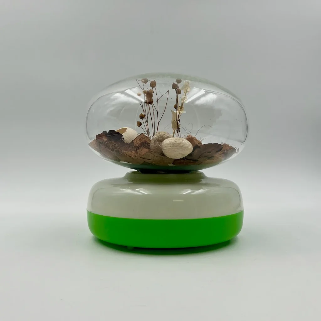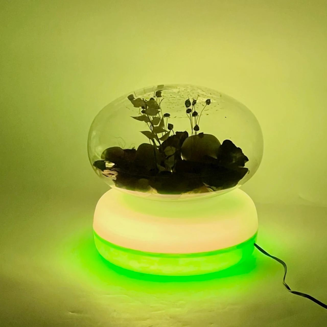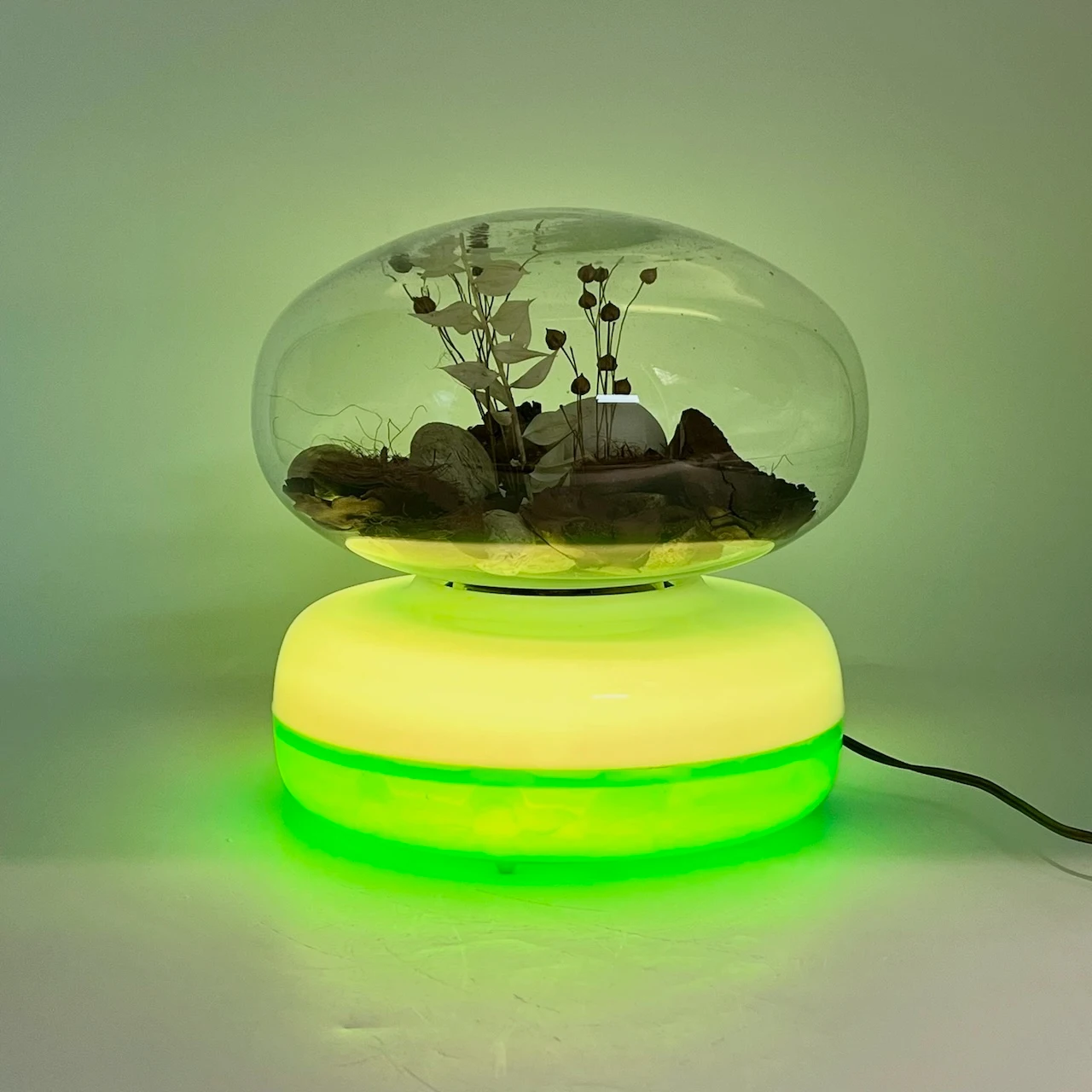The disc-shaped base, crafted from translucent plastic, houses a soft E14 bulb that casts a gentle, atmospheric glow. The glass globe sits perfectly atop the base, supported by a plastic fitting, making it ideal for holding dried or plastic flowers. Customize the interior decor with your choice of hues and shapes to create a personalized and captivating visual effect.