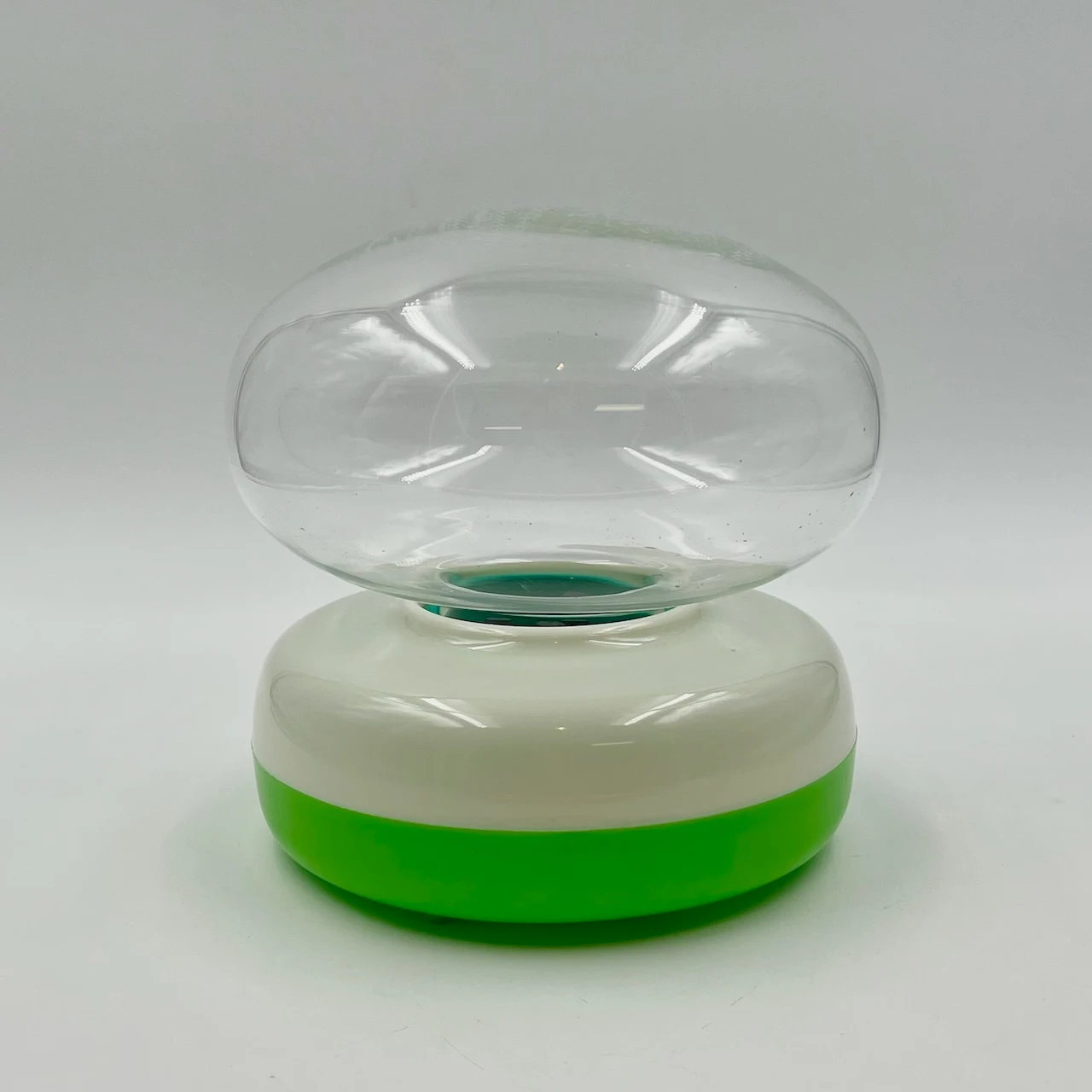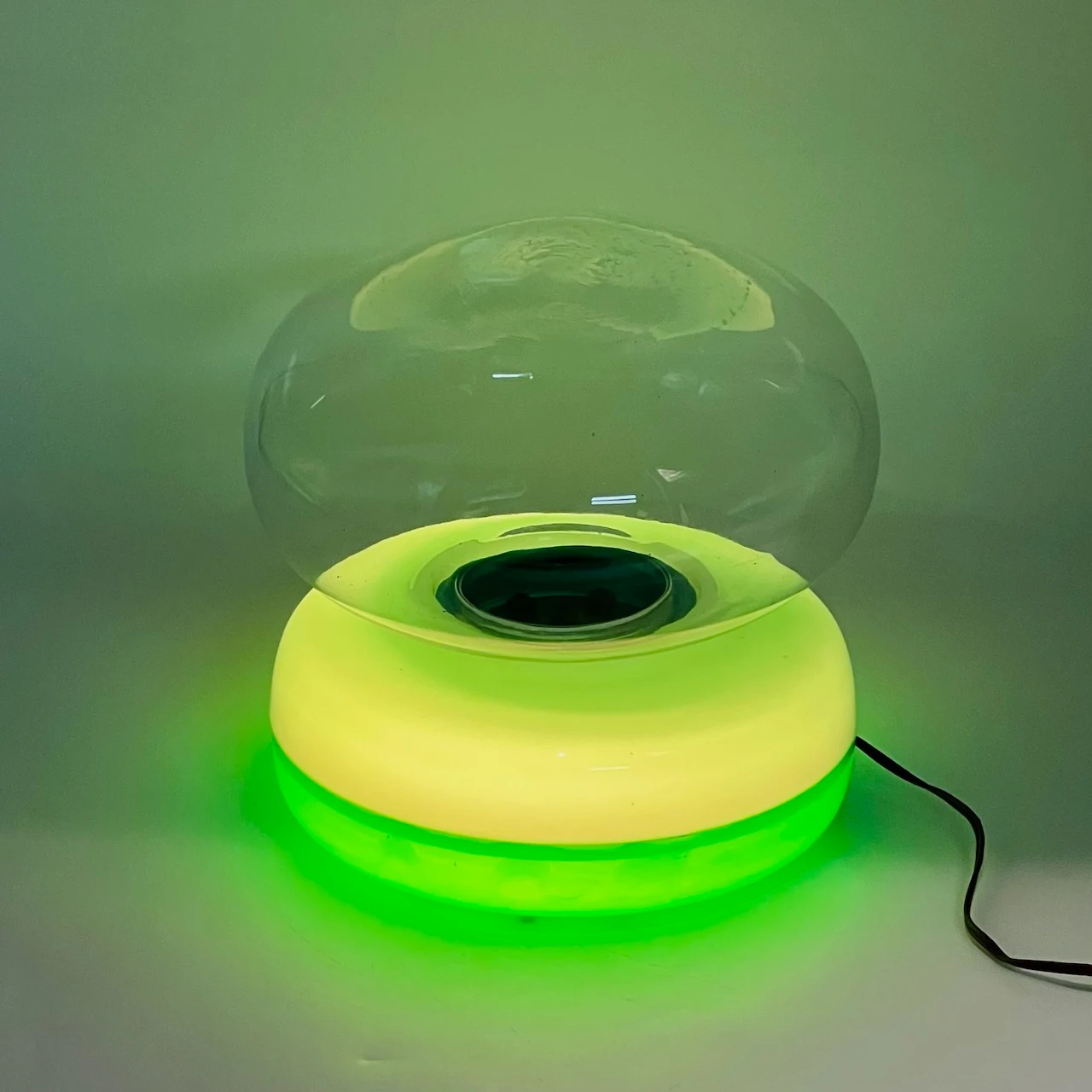 Discover the epitome of Space Age design with this gorgeous and unfindable space age lamp, featuring a unique white and green plastic base holder topped by a flying saucer-shaped clear glass bowl. This extraordinary lamp brings a touch of retro-futuristic charm to any space, combining ambient lighting with artistic flair.