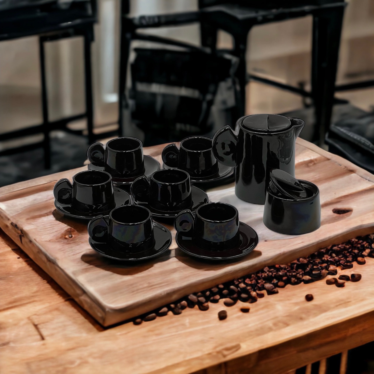 Rare and distinctive vintage set of 6 coffee cup set with matching plates, carafe and sugar bowl made by the famous Italian maker Gabbianelli in the 60s.