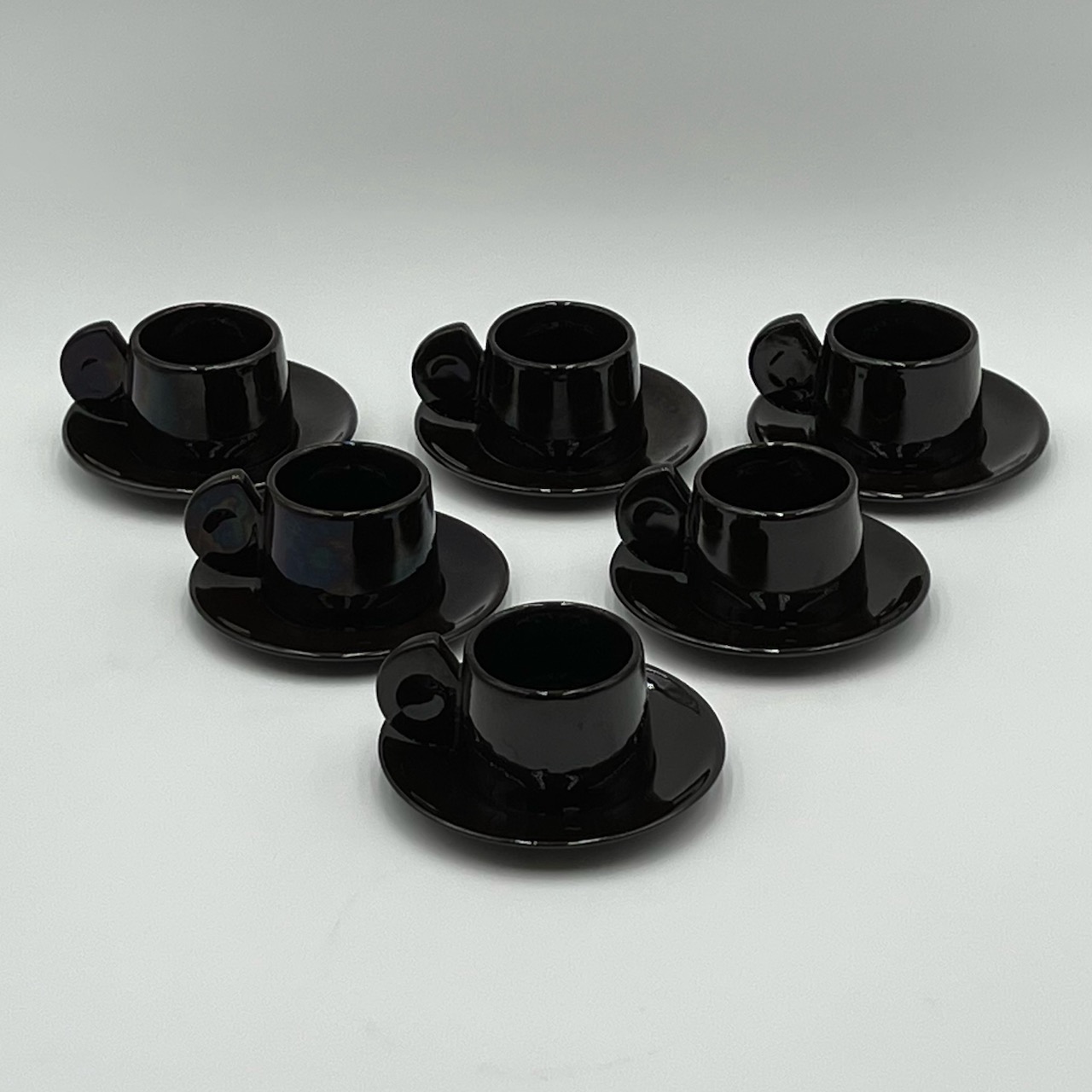 This is a rare and distinctive vintage set of 6 coffee cups with matching plates, carafe and sugar bowl manufactured by the famous Italian maker Gabbianelli in the 60s.