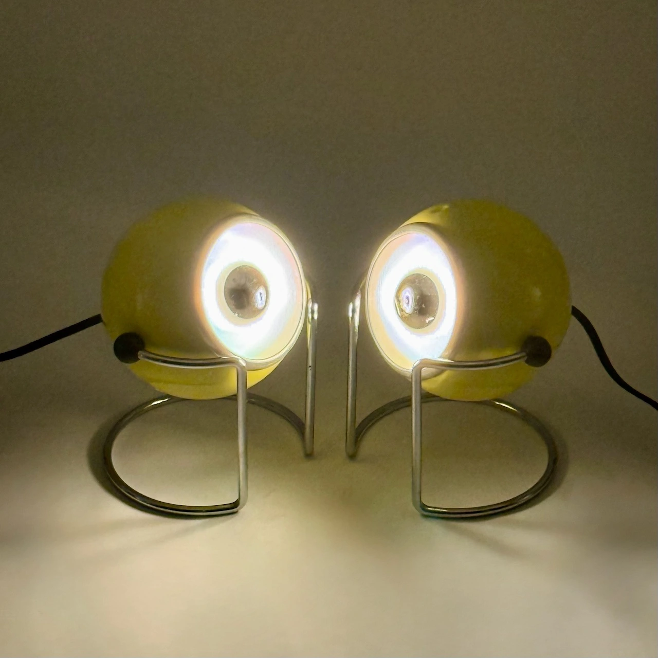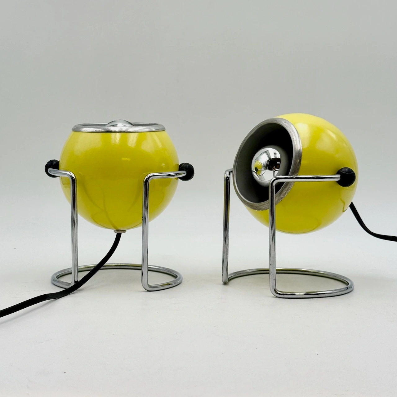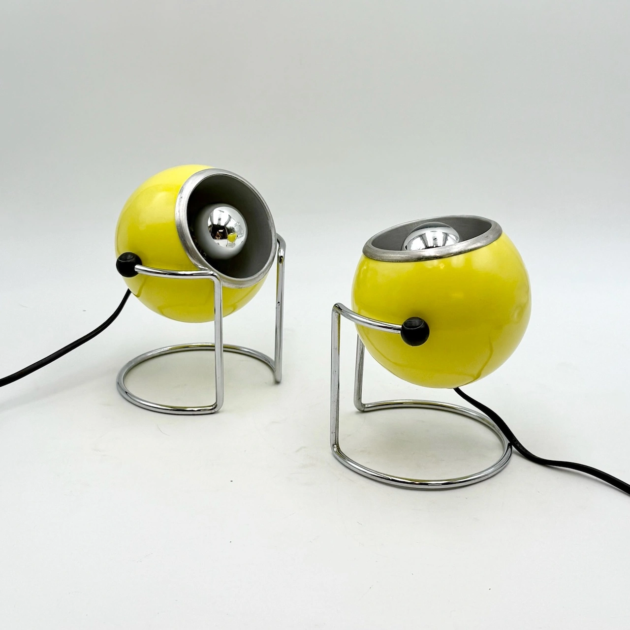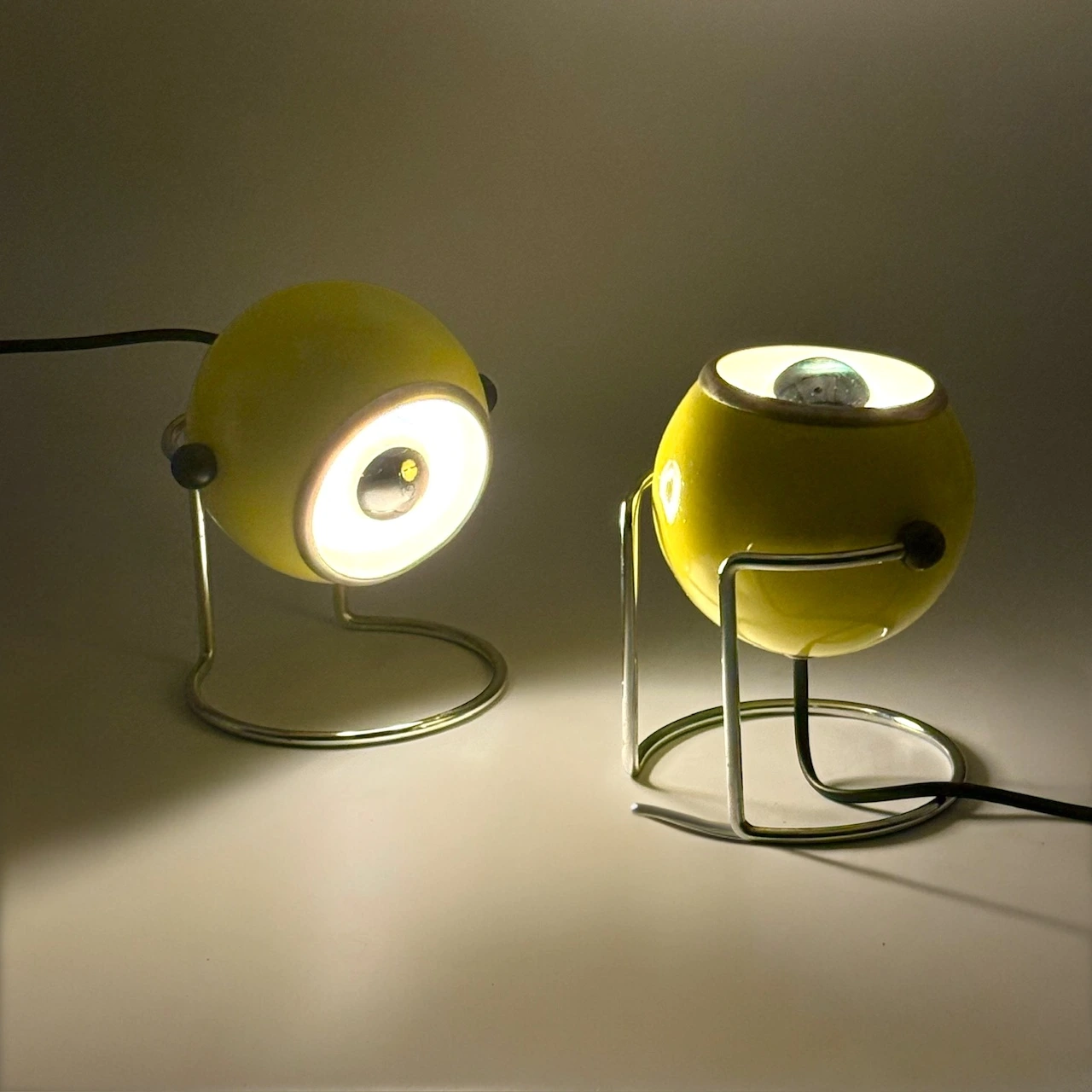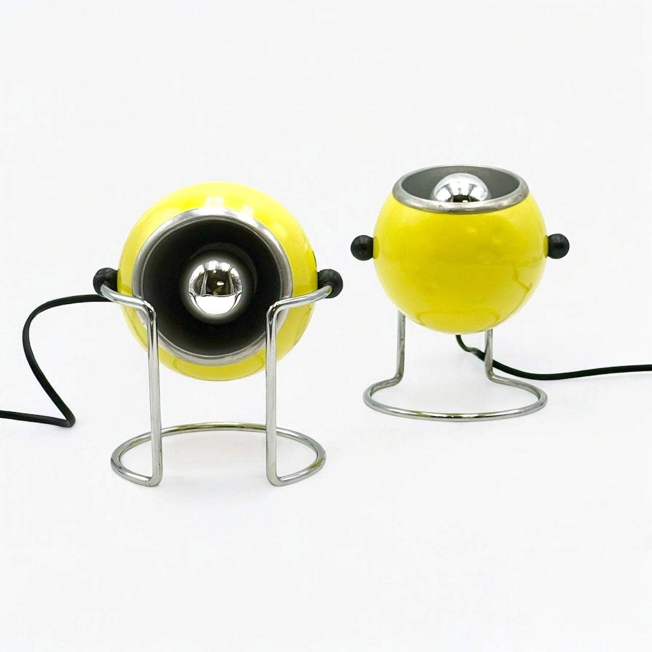 Add a burst of Space Age energy to your interior with this striking pair of eyeball table lamps by Targetti, crafted in Italy in the 1970s. Their glossy yellow enameled metal bodies and sleek chrome bases embody the futuristic aesthetics of the decade, while their iconic eyeball design allows for full directional control.