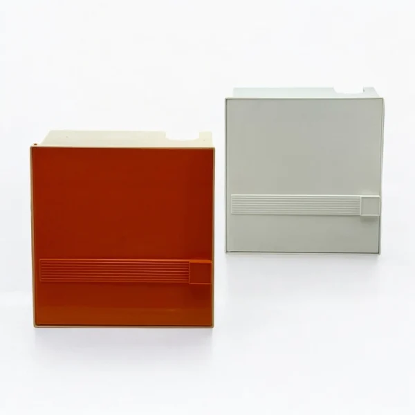 Bring bold energy and playful functionality into your space with these vibrant 1970s plastic wall cabinets made by Flair, Holland, in the 1970s. With their distinctive orange and white color scheme, sleek geometric form, and modular design, they capture the optimistic spirit of the pop-influenced interiors of the era.