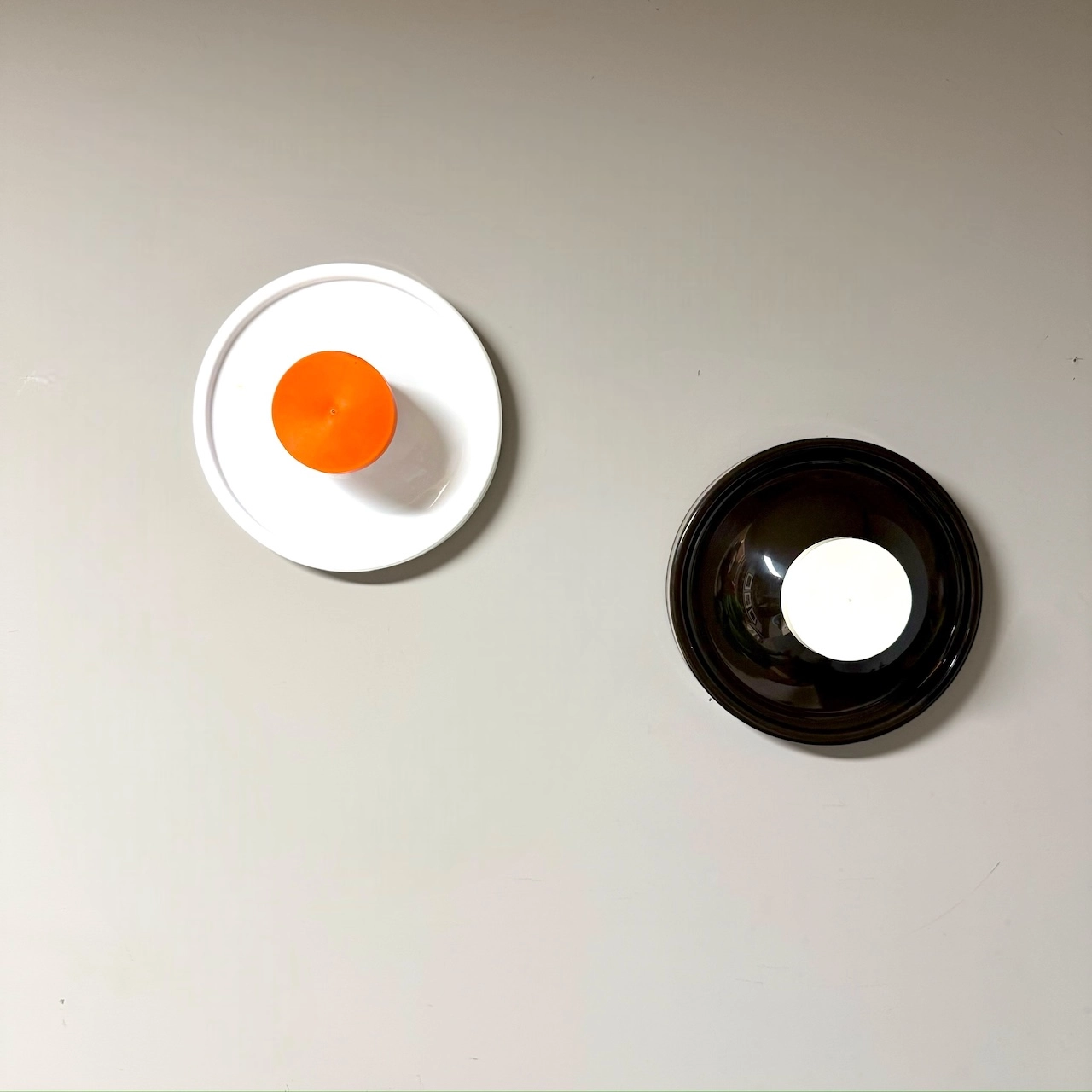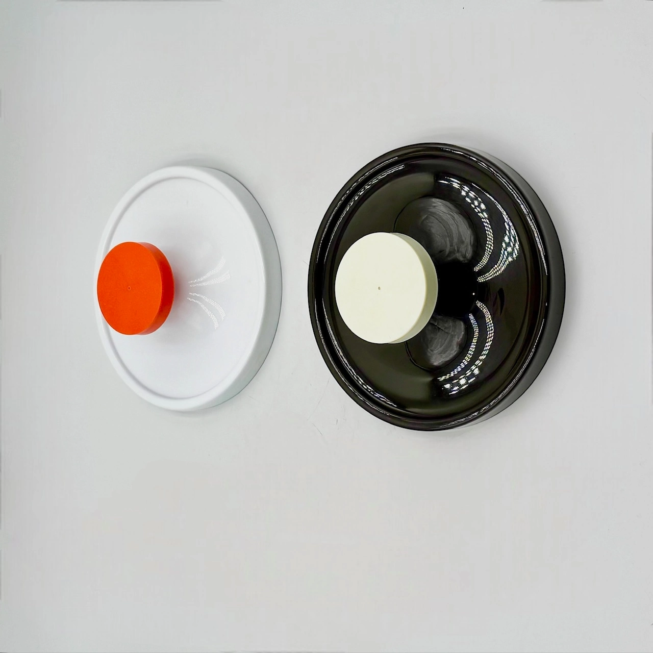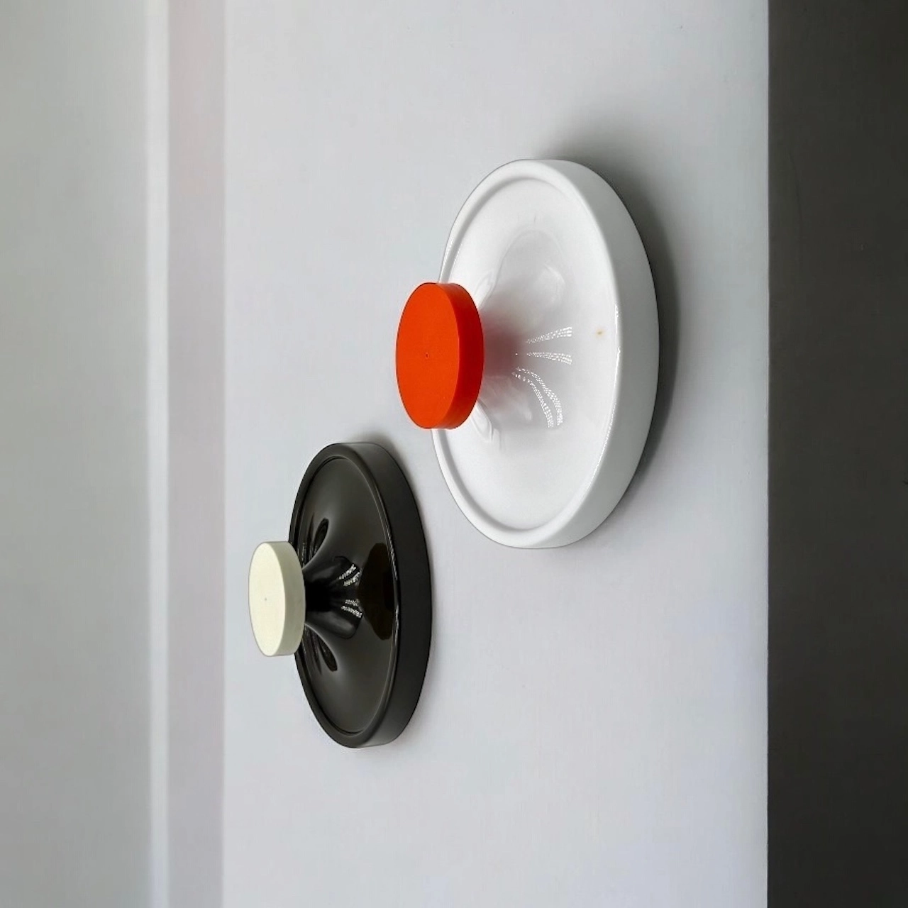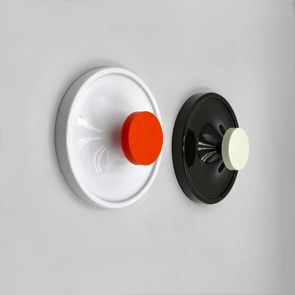Pair of rare 60s wall hooks by Salc Cantu in plastic and cork. Their sculptural round shape and bold colors capture the essence of Italian Space Age design. Decorative yet practical, they add a bright vintage accent to any modern interior.