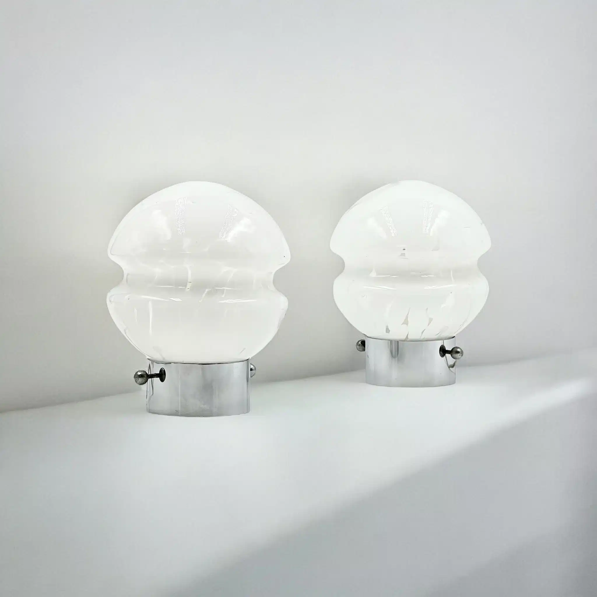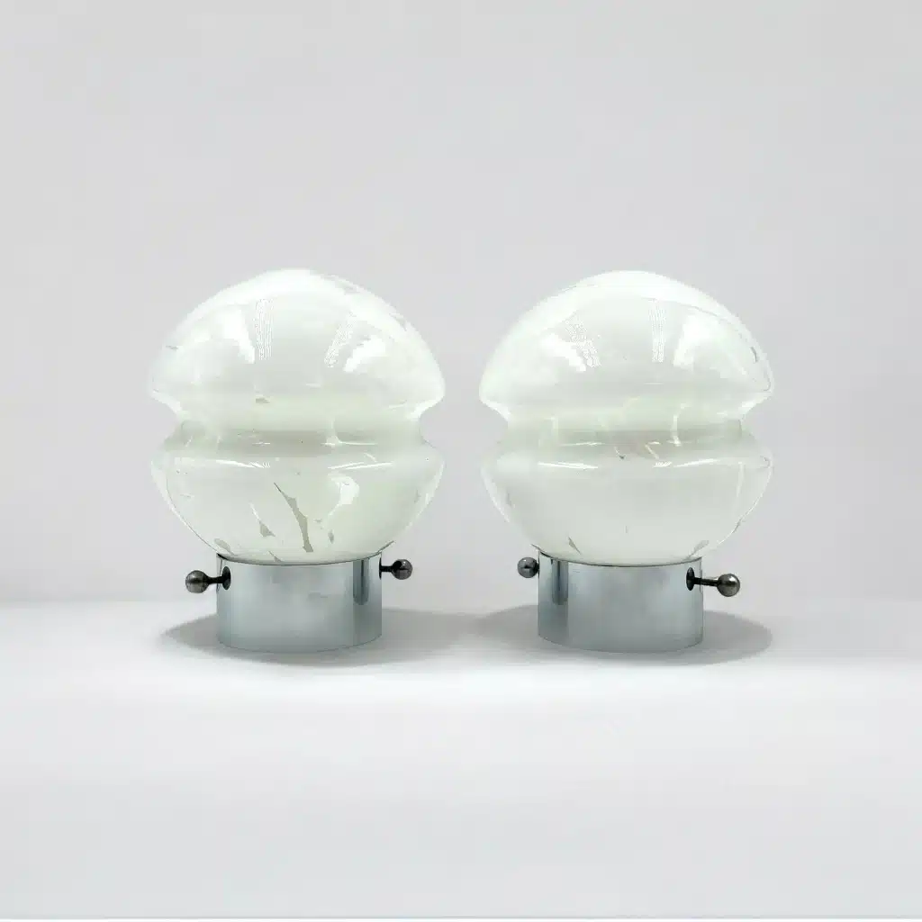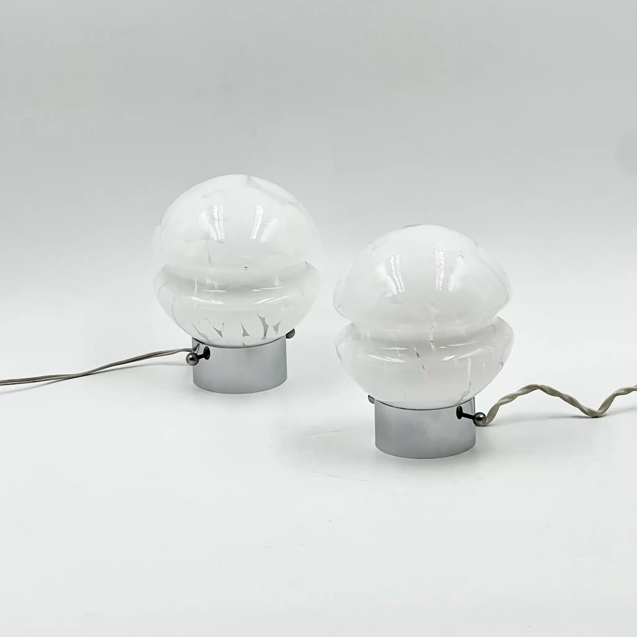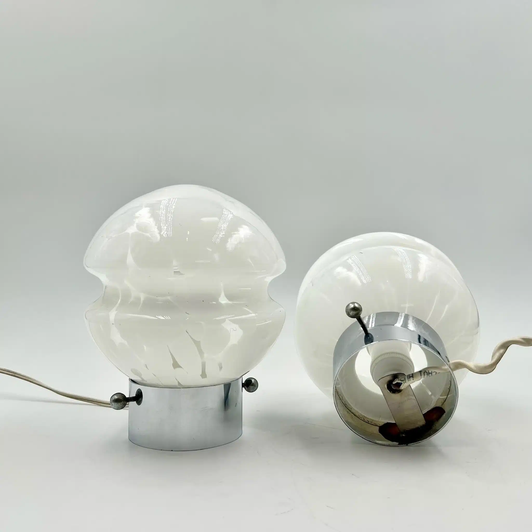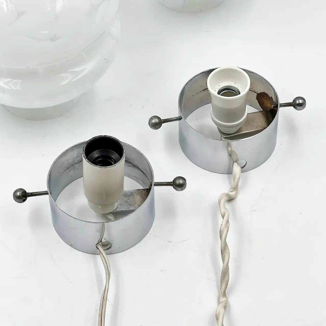 Elegant pair of 70s glass table lamps with white glass, metal base, and original screws. Perfect for adding vintage charm to your home decor. Excellent condition.