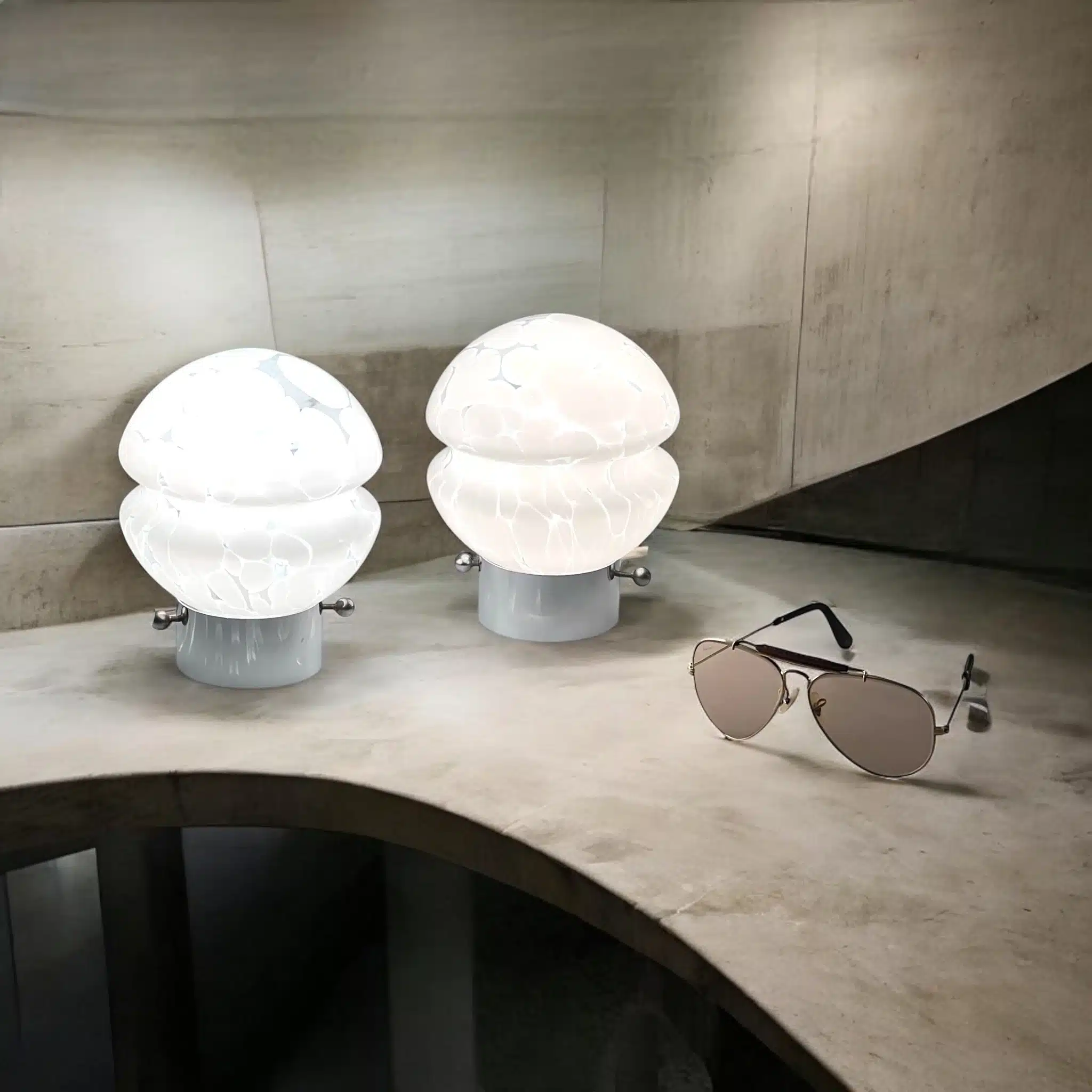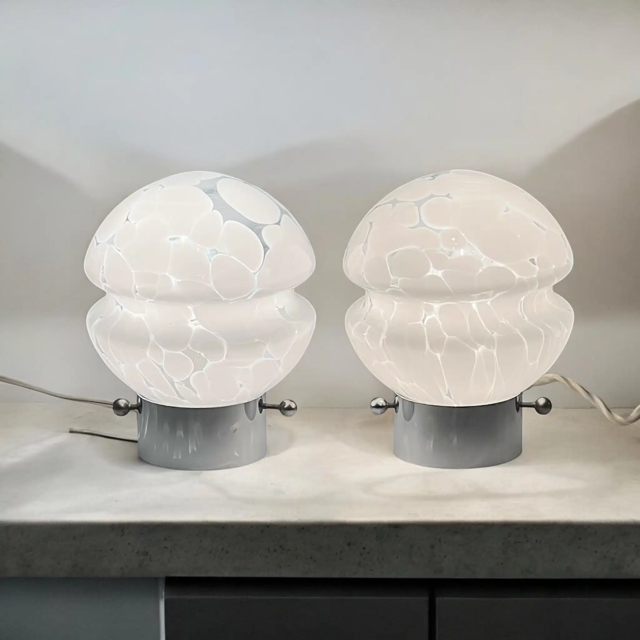 Step into the elegance of vintage Italian design with these rare 70s table lamps, featuring a distinctive blend of white glass with transparent veining and a sleek cylindrical metal base. These lamps offer both a functional lighting solution and a decorative touch that will enhance any room, bringing a unique vintage charm to your home.