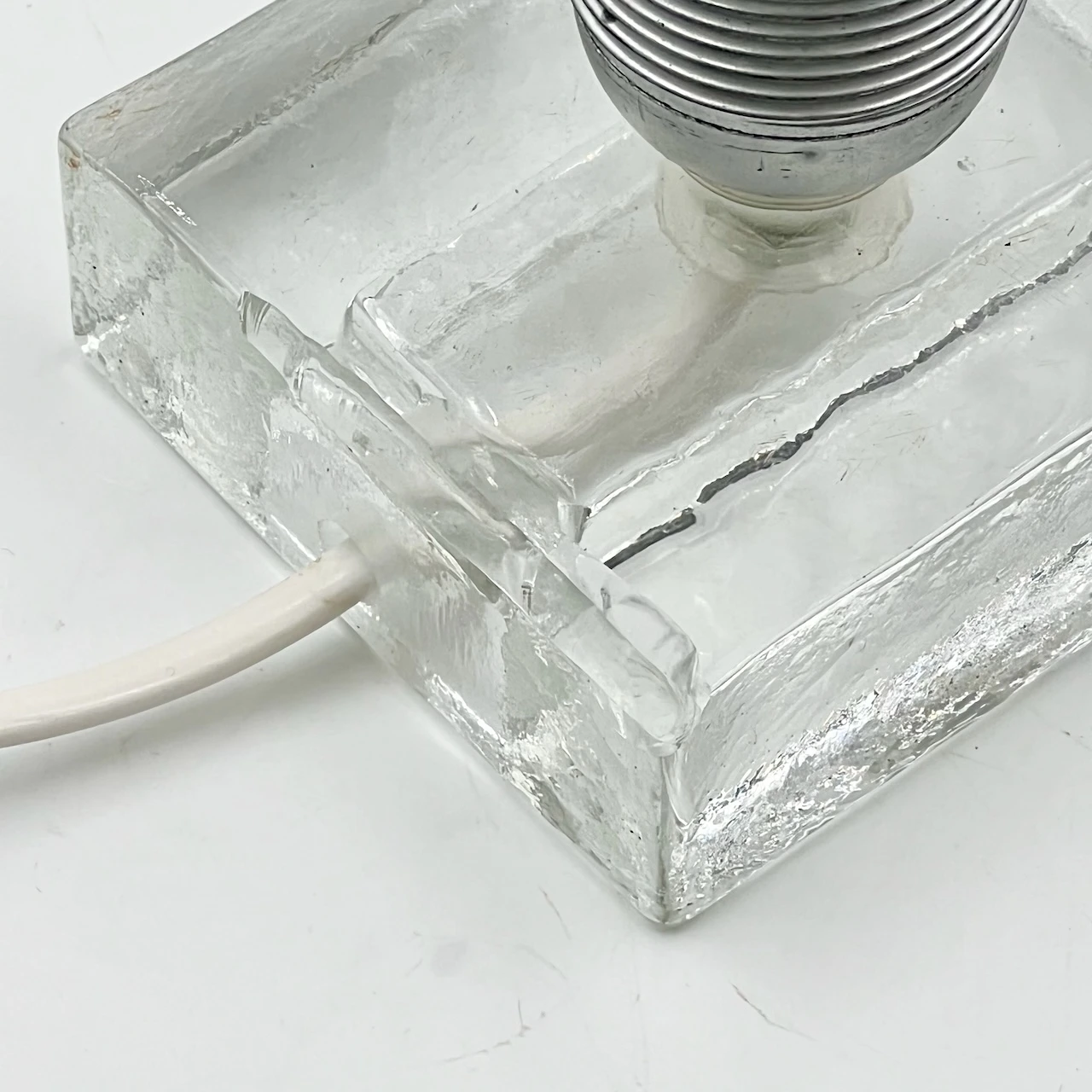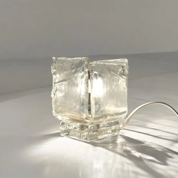 item. table lampmaker. tosoperiod. 1970scountry. Italymaterial. ice-like murano glass, plasticcolor. clear, chrome silverdimensions (cm). 13 x 13 x 16 Hcondition. new old stock, never used. excellent vintage conditions. micro chippings around the bulb holder slot, that are not visible in use (they are inside the bulb holder). slight scratch on a corner of the base near the cable exit (on the back) visible only upon careful inspection
