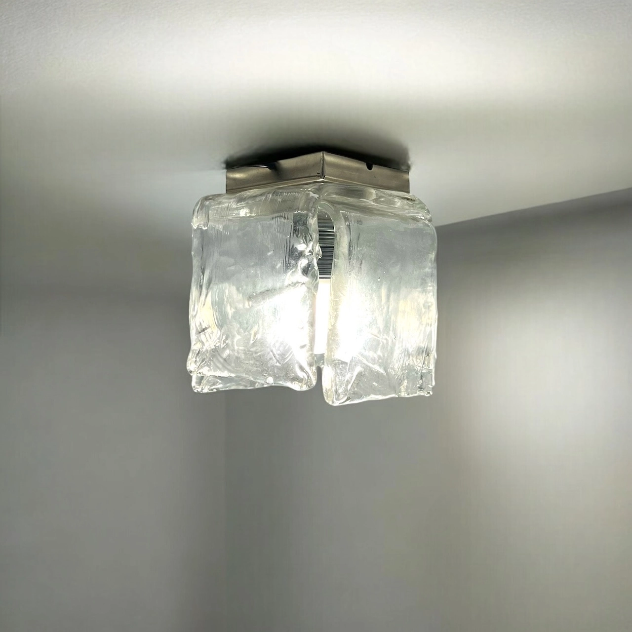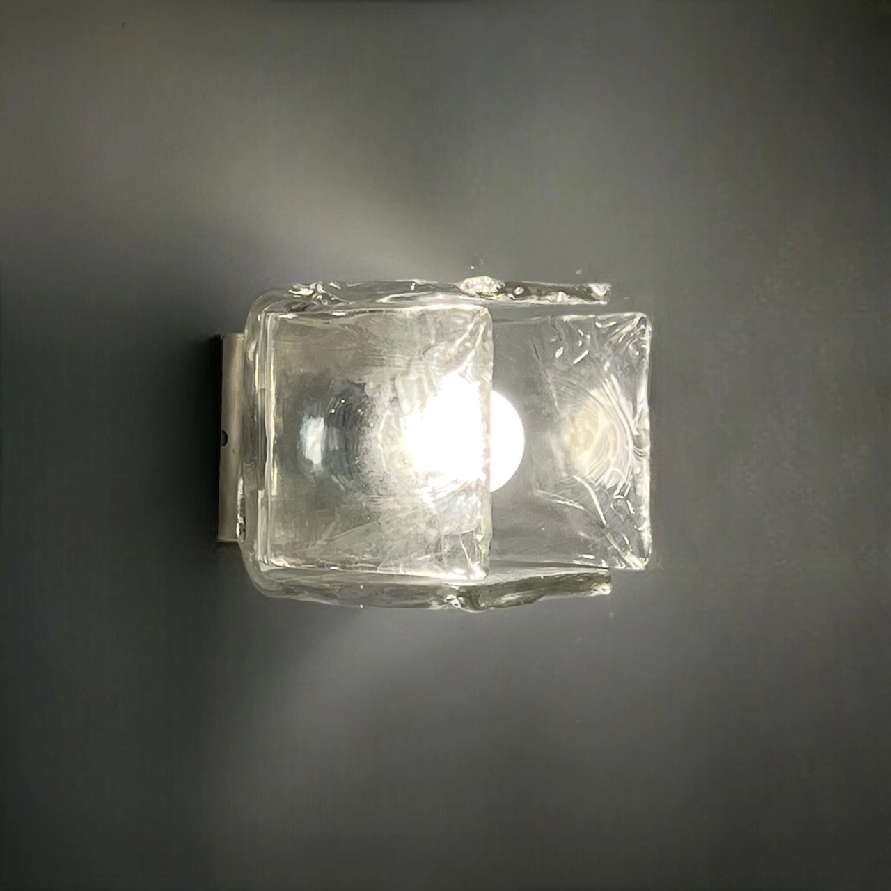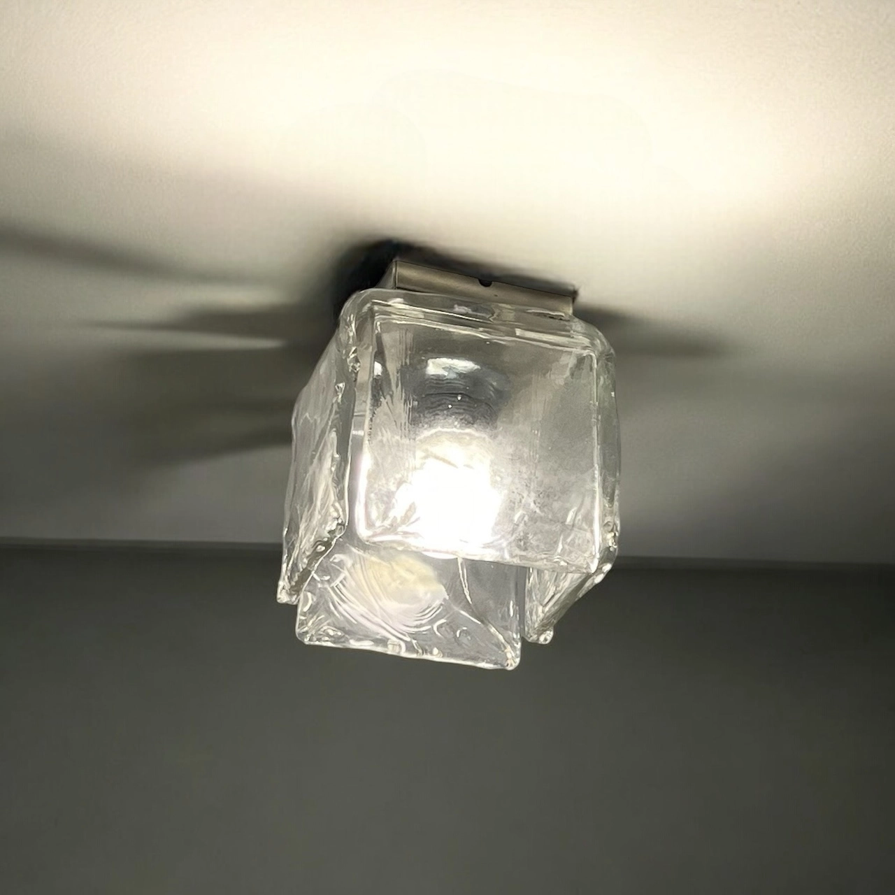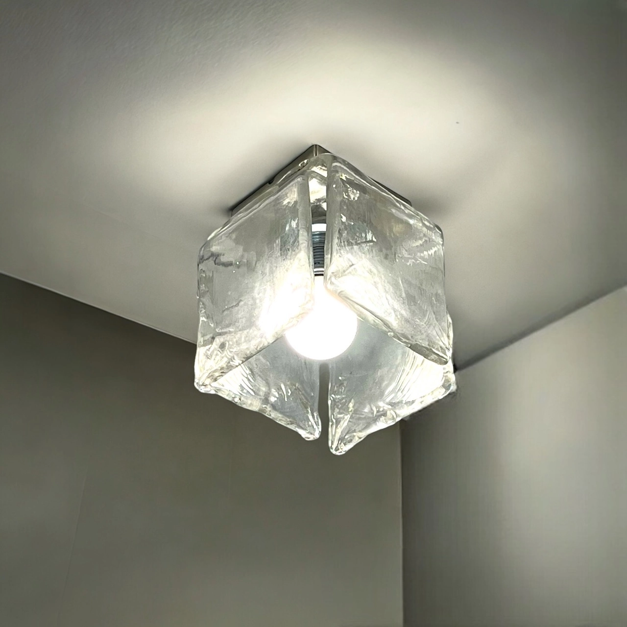 item. wall or ceiling lampmaker. tosoperiod. 1970scountry. Italymaterial. murano glass, metalcolor. clear, chrome silverdimensions (cm). 12 x 12,5 x 14 Hcondition. new old stock, never used. excellent vintage conditions. minimal traces of oxidation of the metal base. art.no. 1377