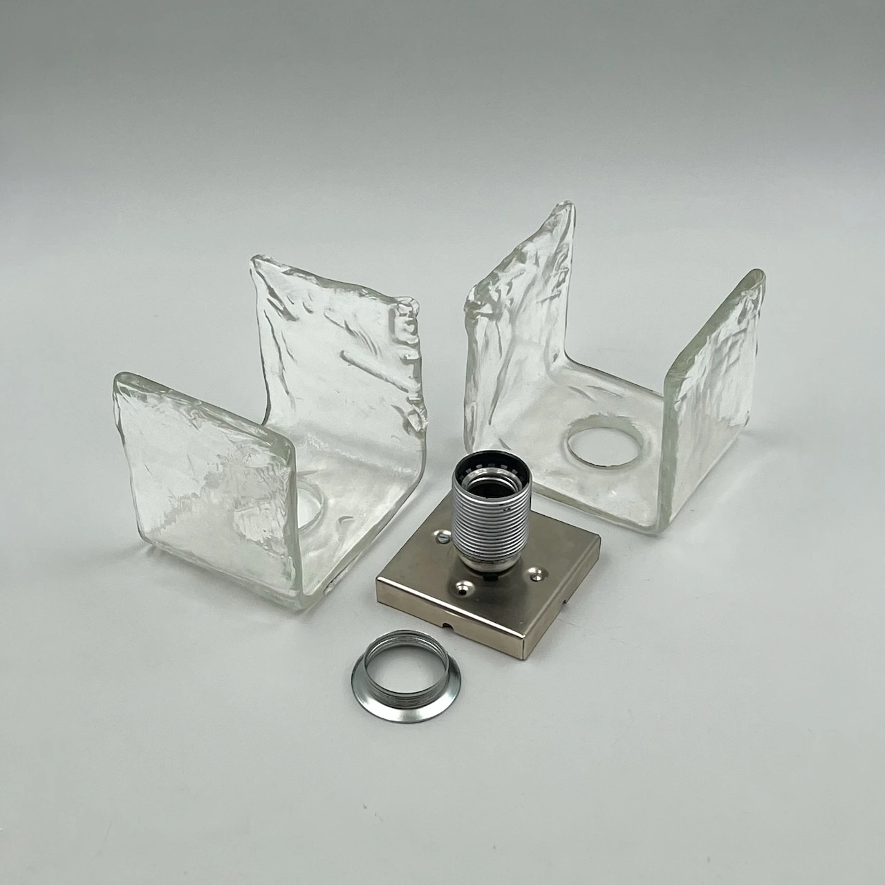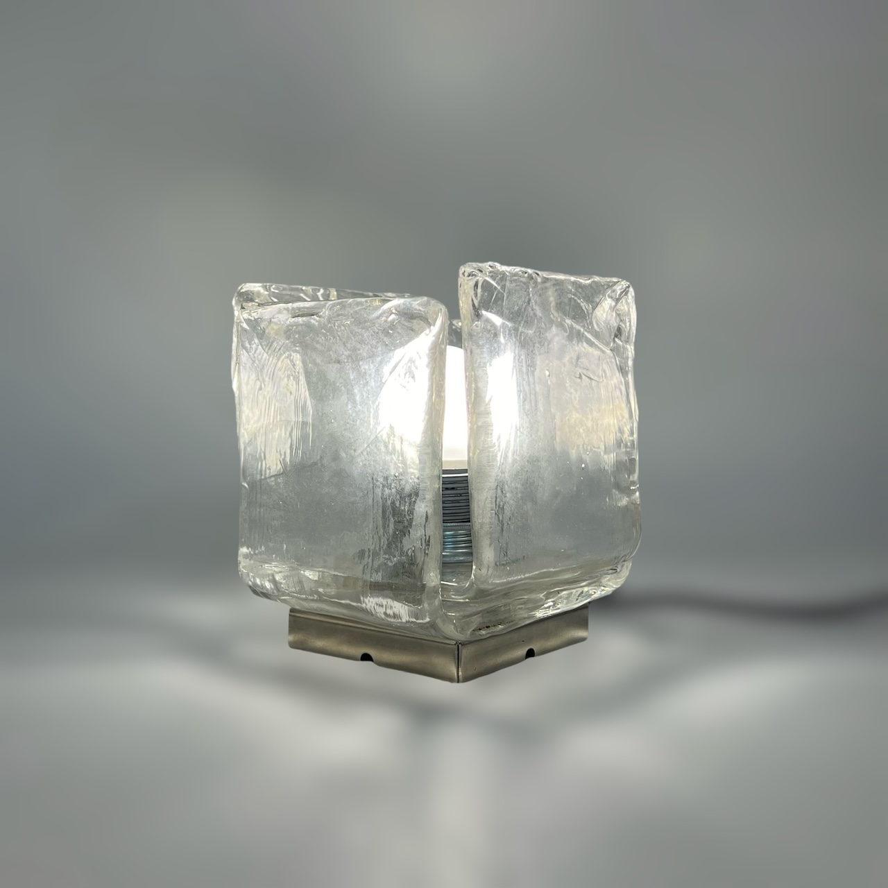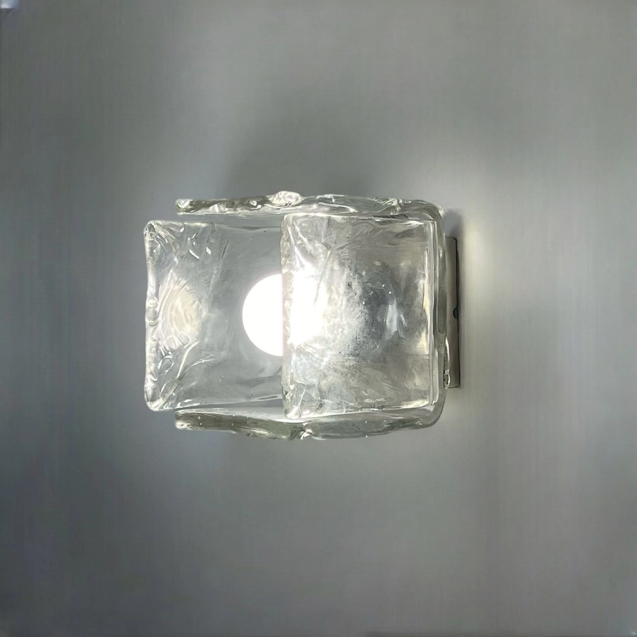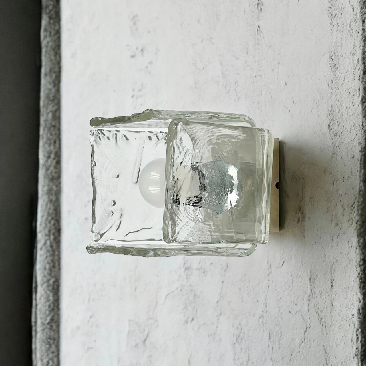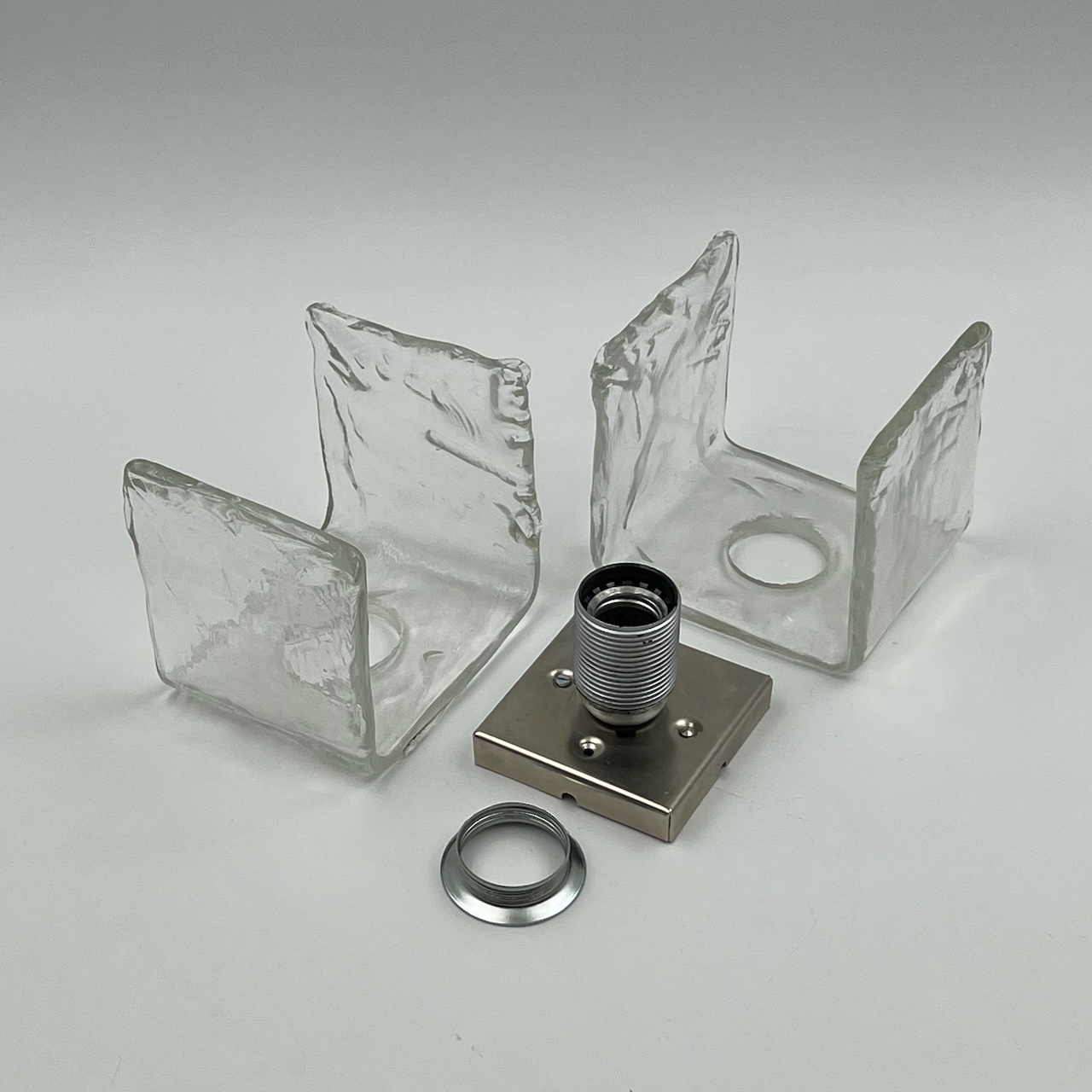 Crafted from two interlocking pieces of thick ice-like Murano glass, these rare artisanal sconce or ceiling lamp emanate a timeless elegance. The heavy metal base provides stability and durability.