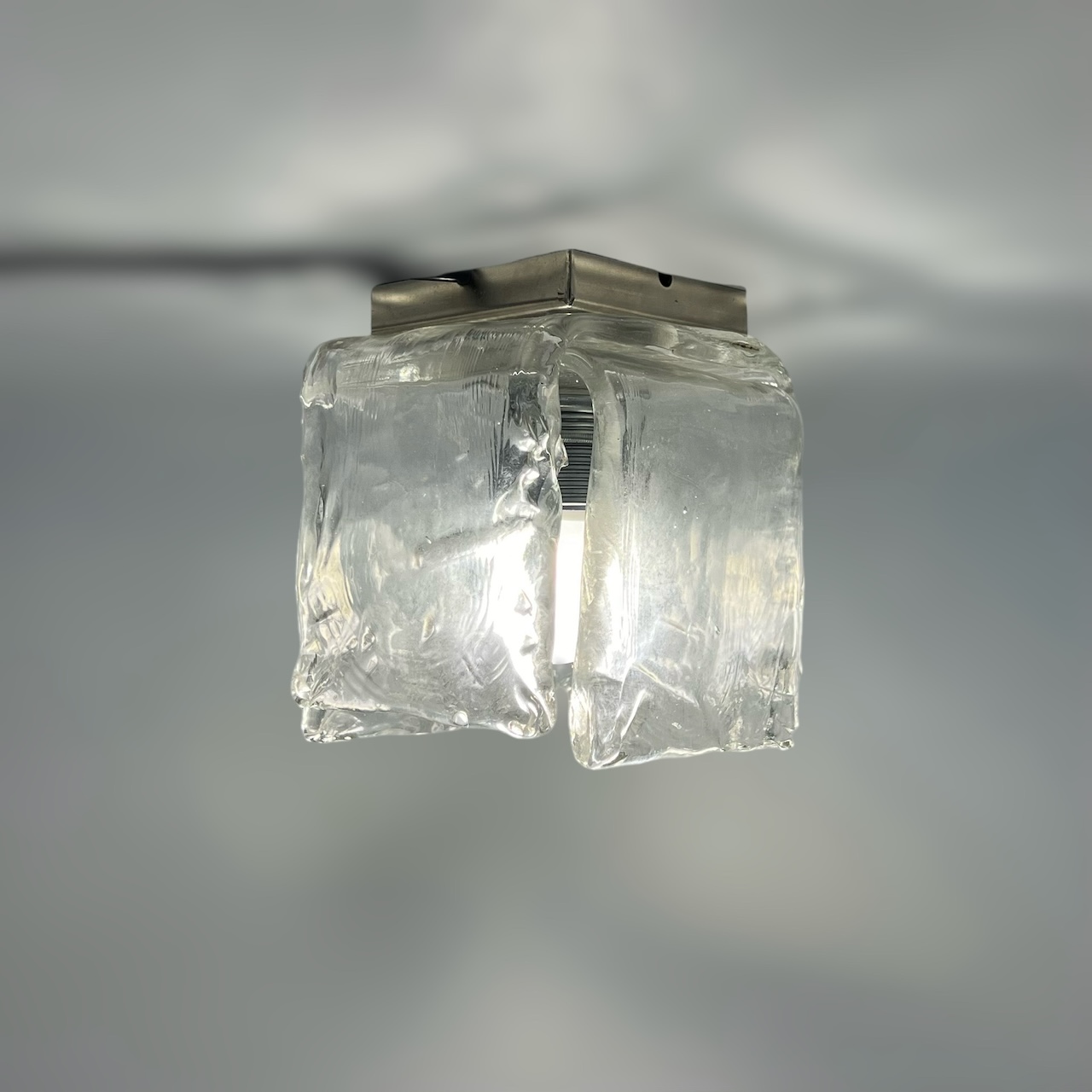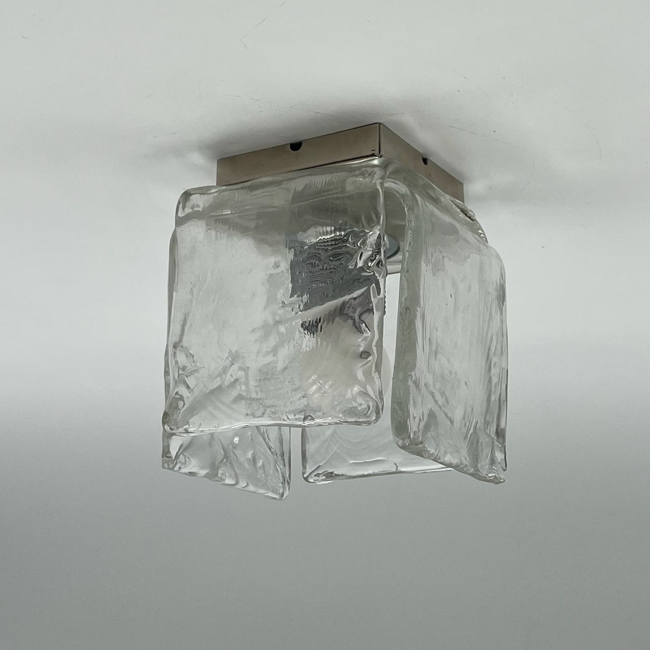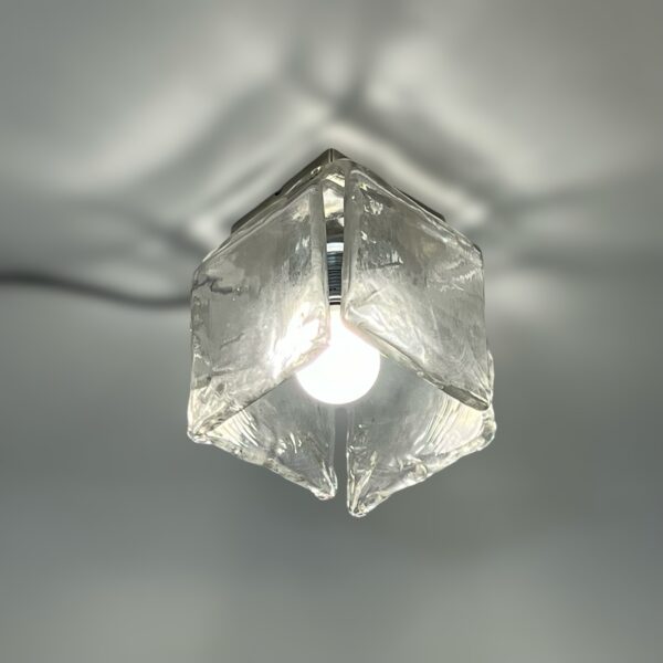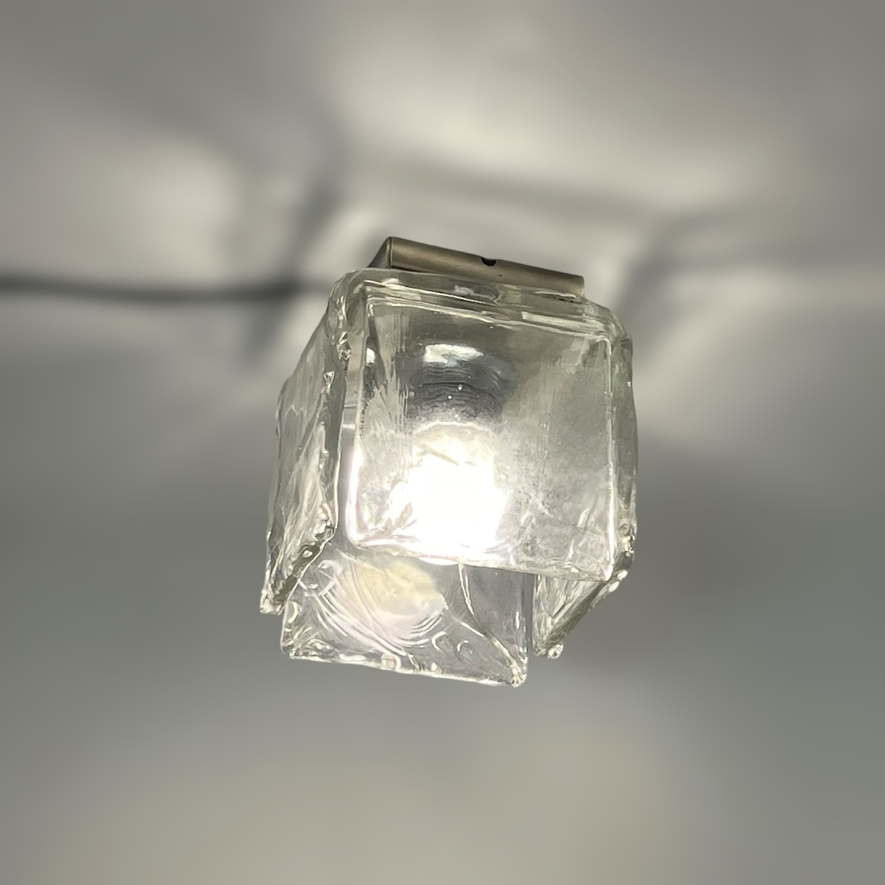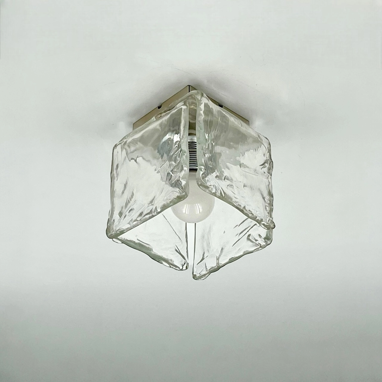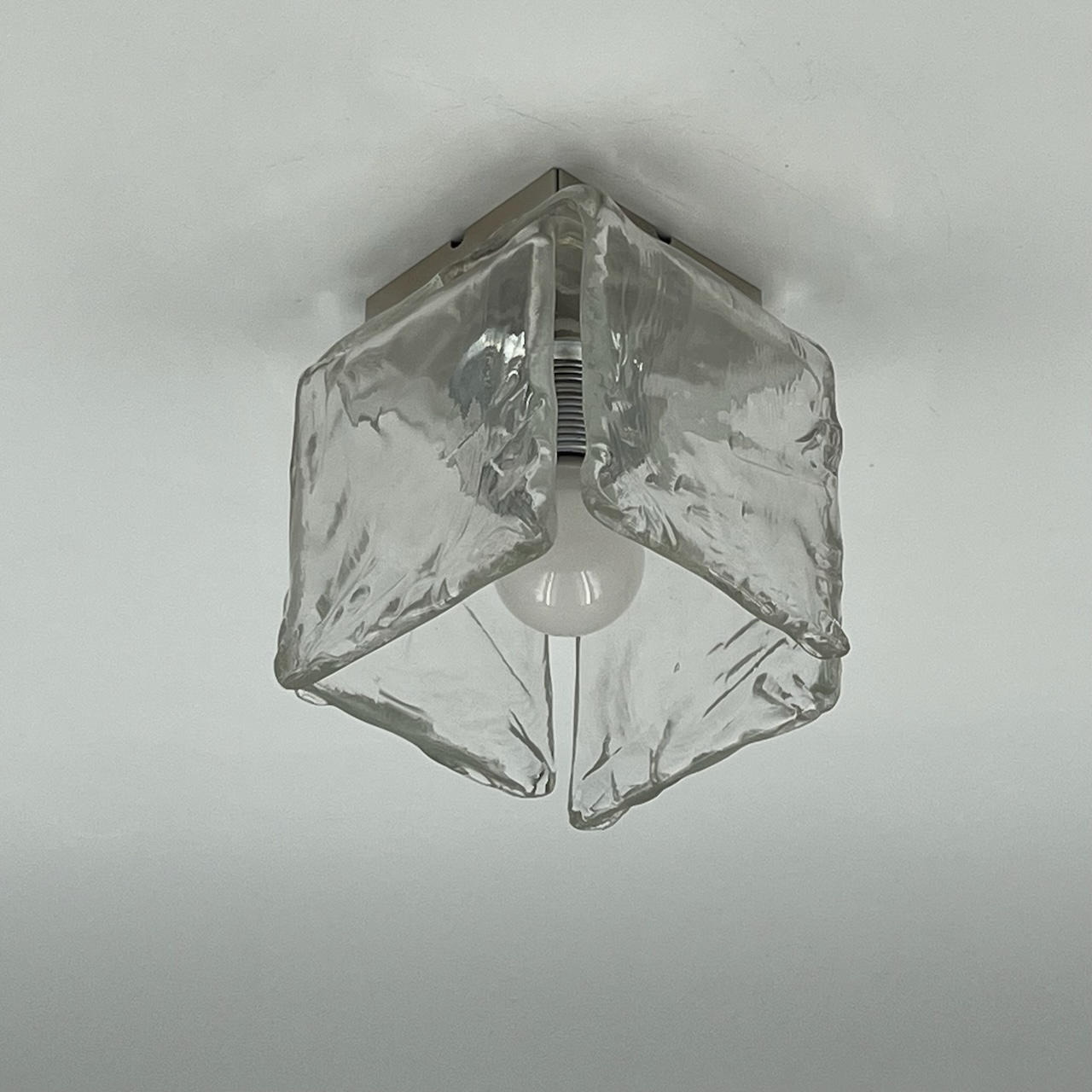 Beautiful and rare vintage 70s lamp in Murano ice-like glass by Toso – suitable as a wall or ceiling light. New old stock in excellent vintage conditions.