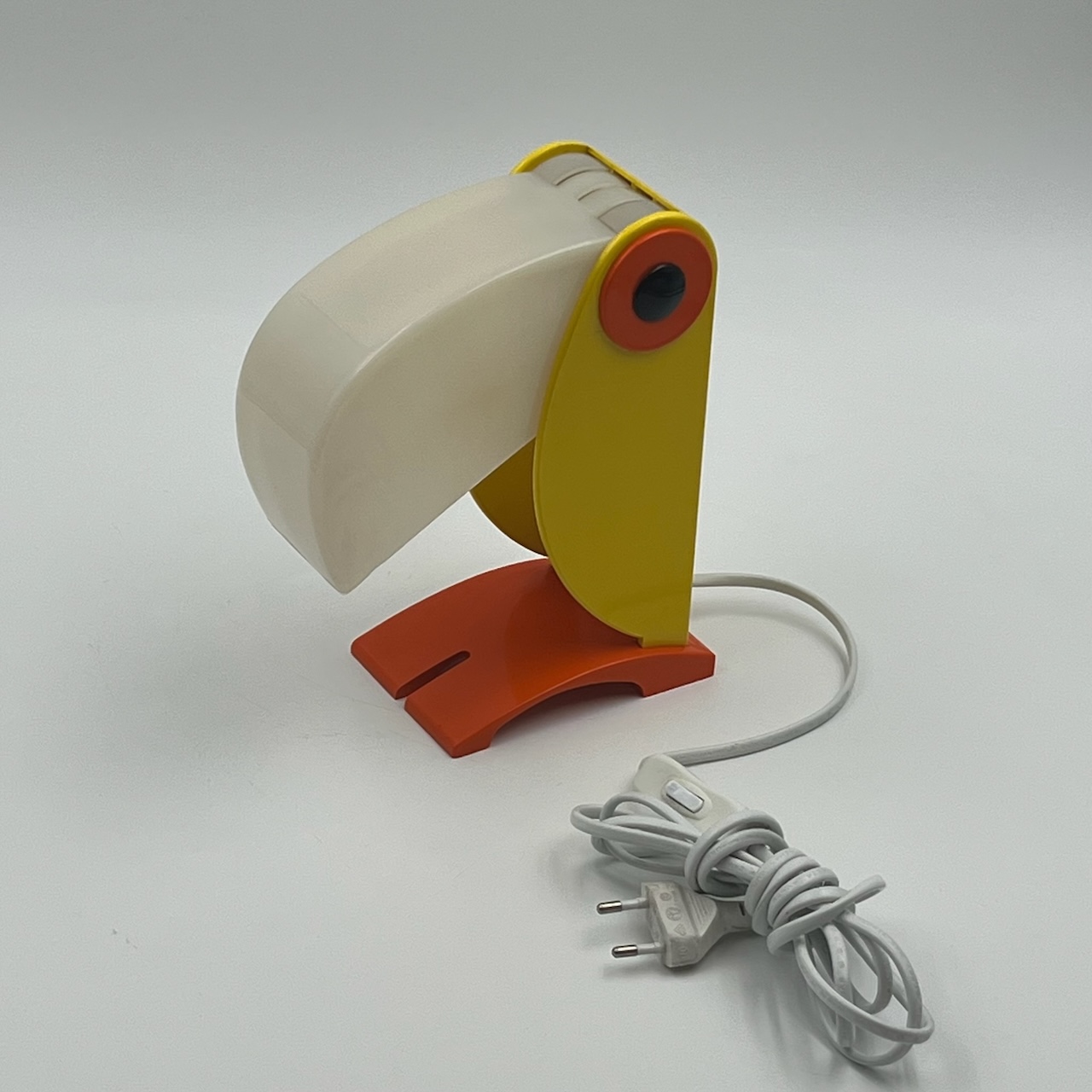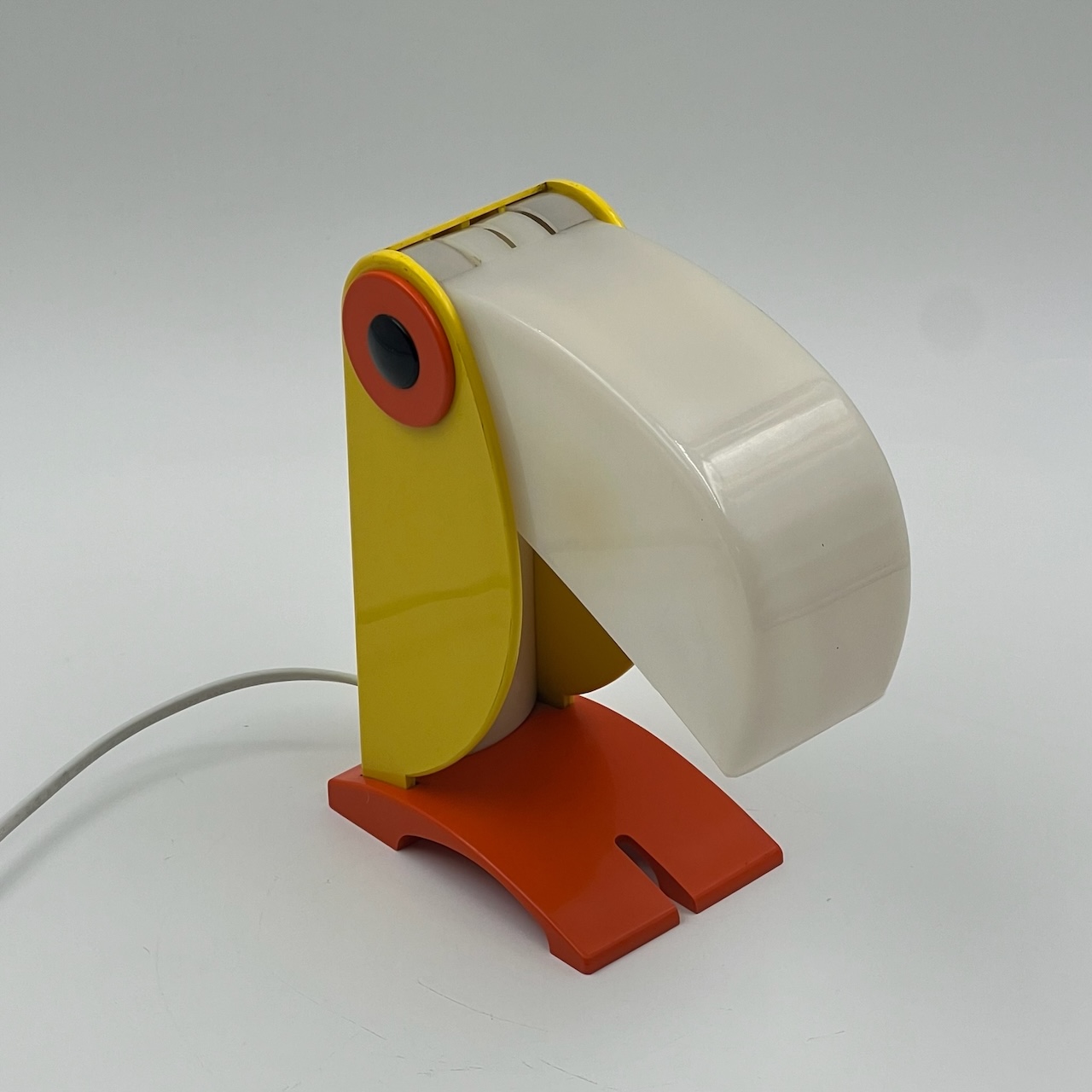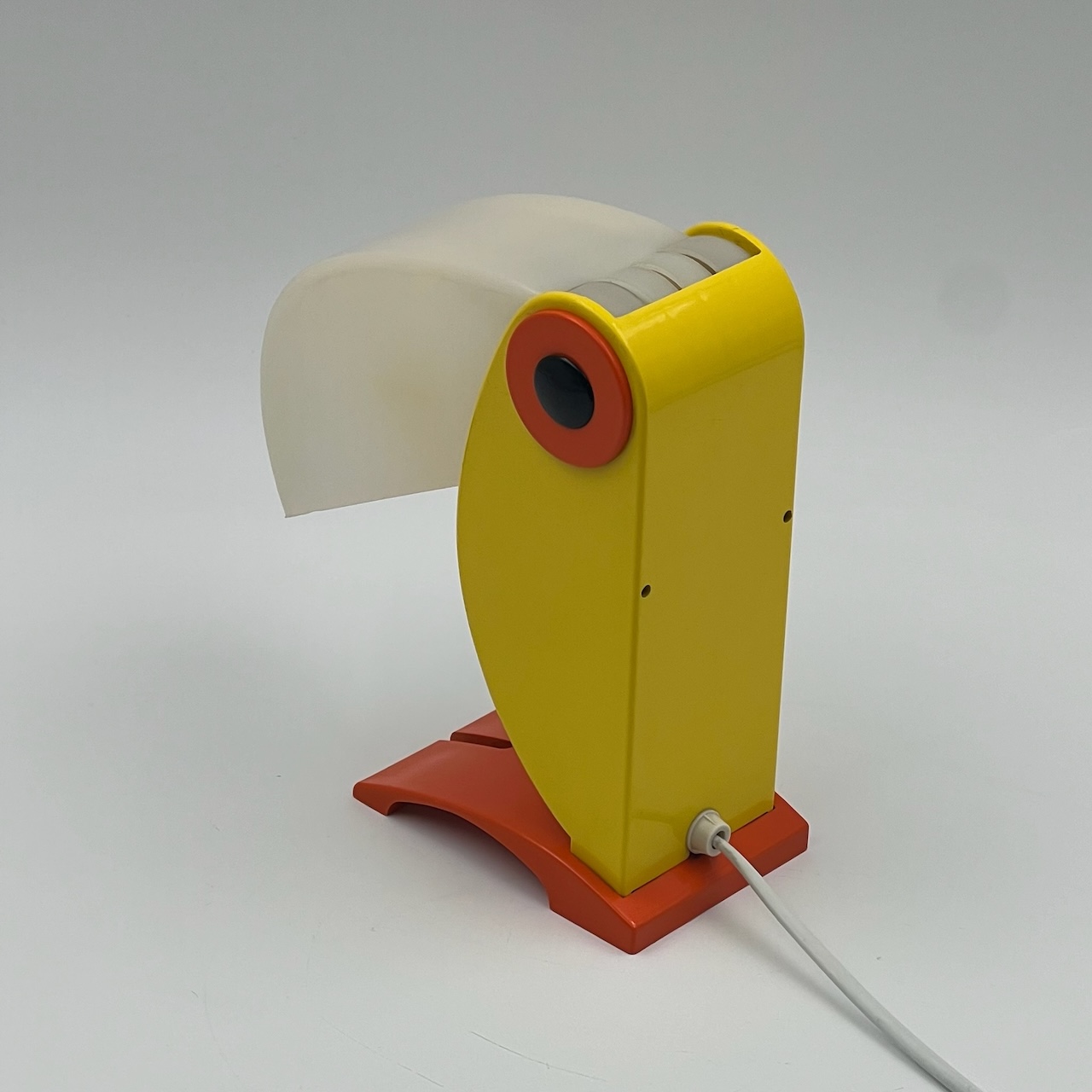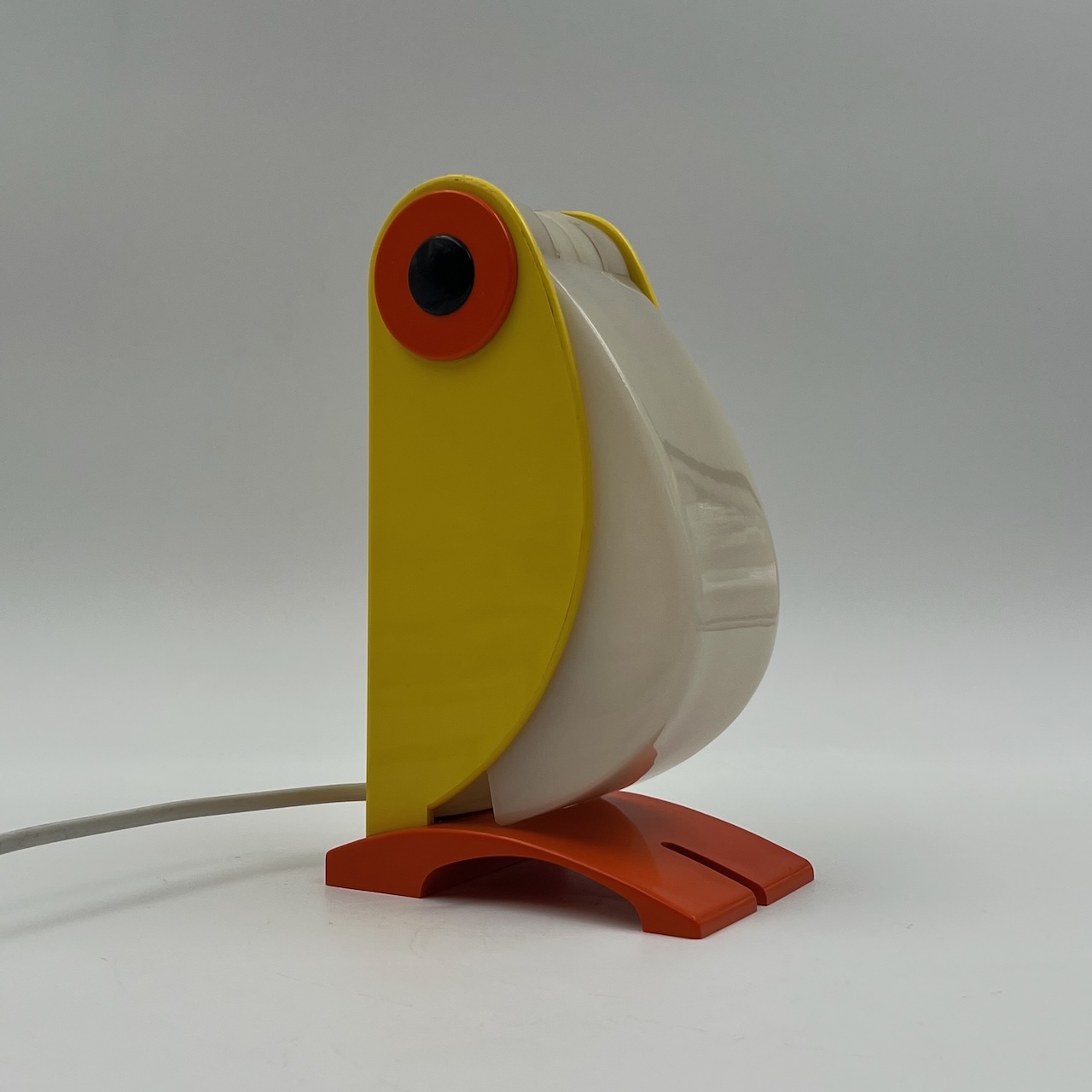 Iconic Toucan lamp designed by Enea Ferrari for Old Timer Ferrari in 1970. The world’s first children’s lamp made of plastic. Vibrant yellow and red hues.