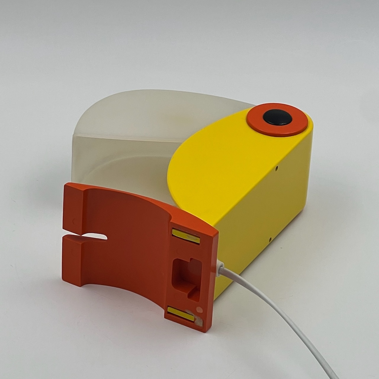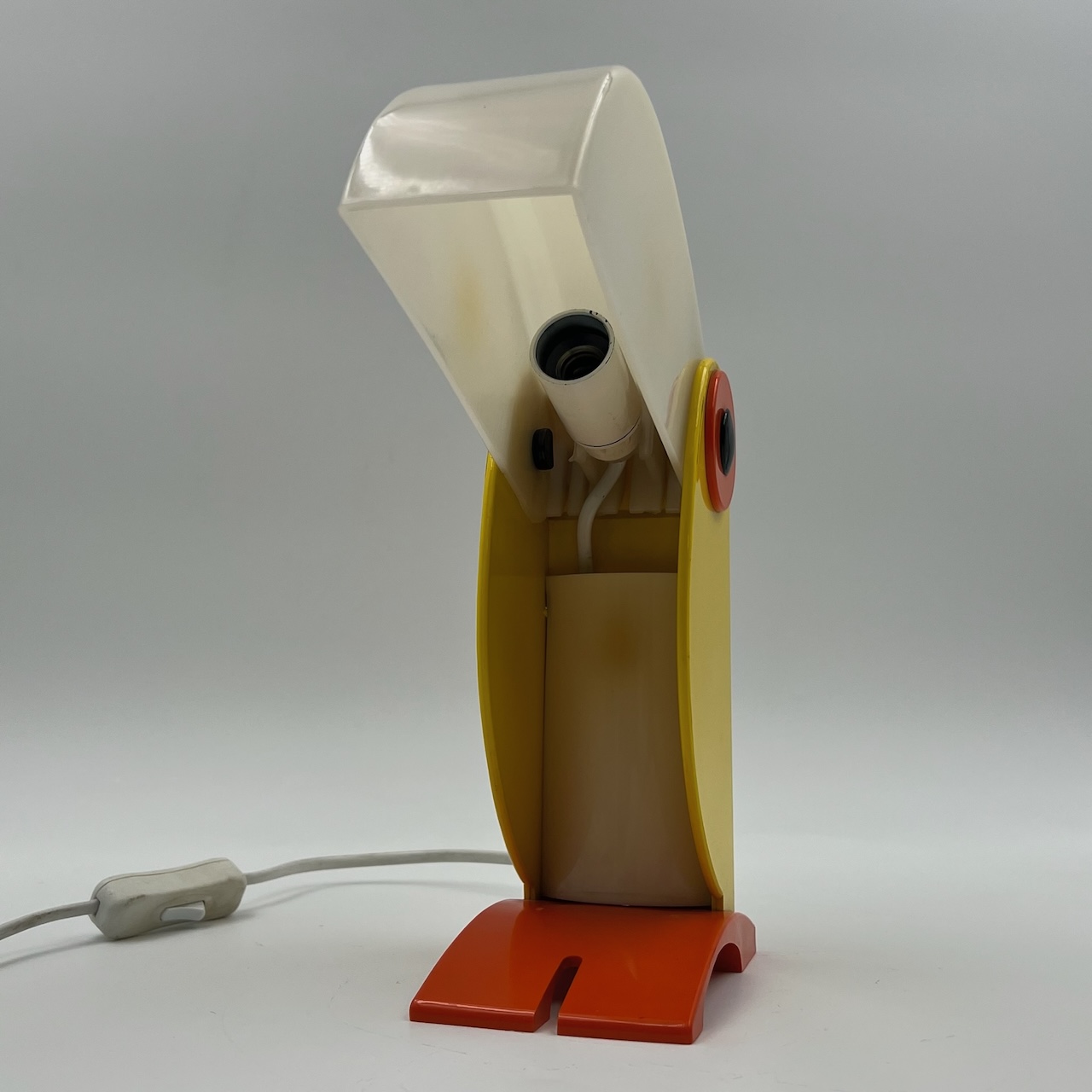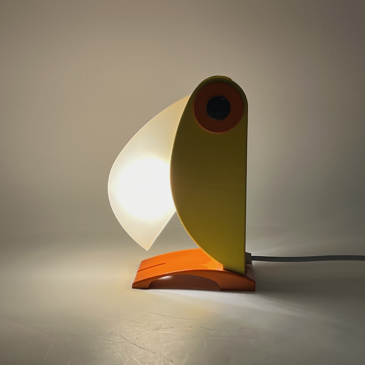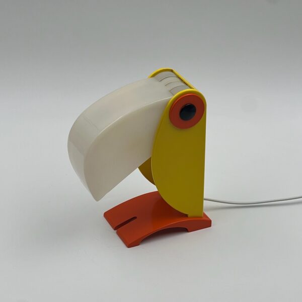 Iconic Toucan lamp designed by Enea Ferrari for Old Timer Ferrari in 1970. The world’s first children’s lamp made of plastic. Vibrant yellow and red hues.