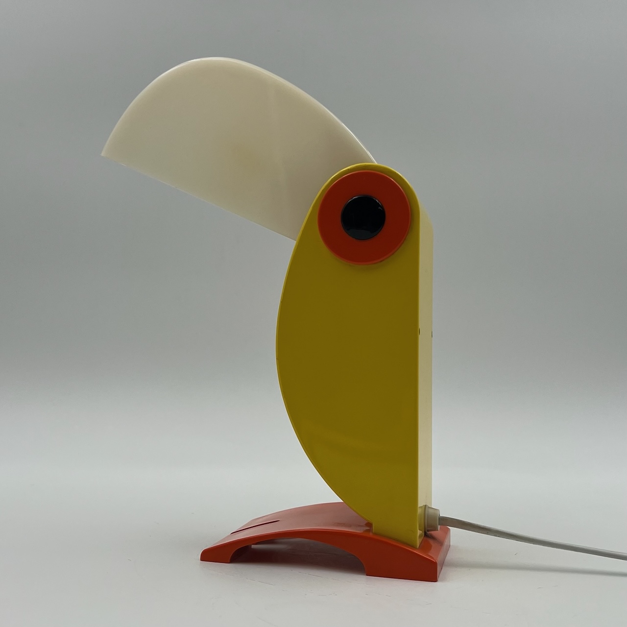 item. table lamp, desk lampdesigner. Enea Ferrarimaker. Old Timer Ferrarimodel. Toucanperiod. 1970scountry. Italymaterial. plasticcolor. red, yellow, ivory, blackdimensions (cm). 18 x 12 x 20condition. excellent conditions and perfectly working, with minimal signs of time like yellowing traces on the ivory-colored parts.art.no. 1375
