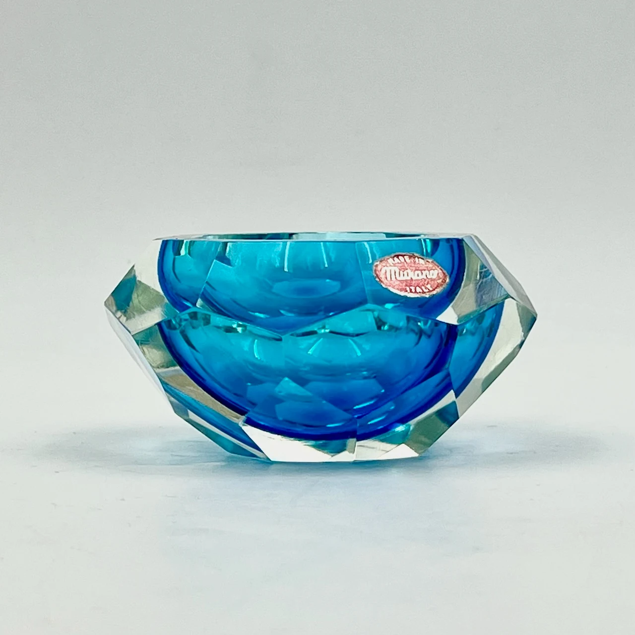 This vintage vase is a true masterpiece of Murano craftsmanship. The polygonal shape adds a geometric elegance, making it a standout piece in any room. The vases blue and transparent color layers are meticulously crafted using the Sommerso technique, a hallmark of Muranos artistry, giving it a mesmerizing depth and vibrancy. The blue core, encased in clear glass, creates a stunning visual effect that captures and refracts light beautifully.