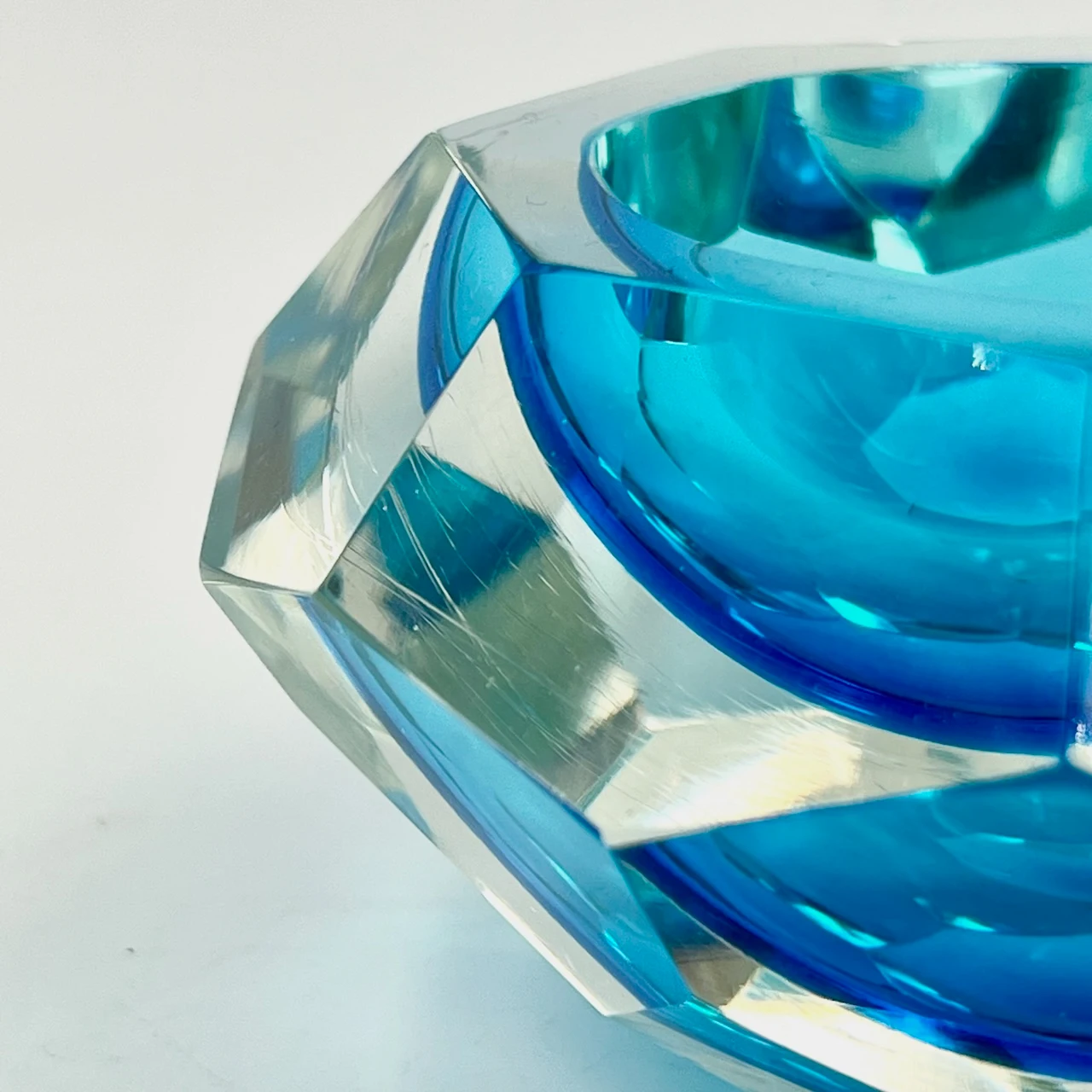 Exquisite 70s Murano Sommerso glass vase. Handcrafted with impeccable skill with a classic polygonal shape and captivating blend of blue and transparent hues.