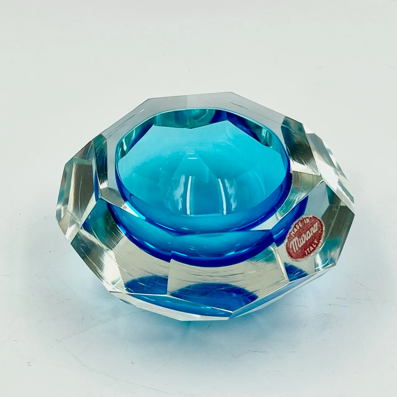 Immerse yourself in the elegance of this exquisite 1970s Murano Sommerso glass vase. Handcrafted with impeccable skill, this vase captures the essence of Italian glassmaking tradition. Featuring a classic polygonal shape, it showcases a captivating blend of blue and transparent hues, emblematic of the renowned Sommerso technique, where layers of glass are beautifully submerged within each other.