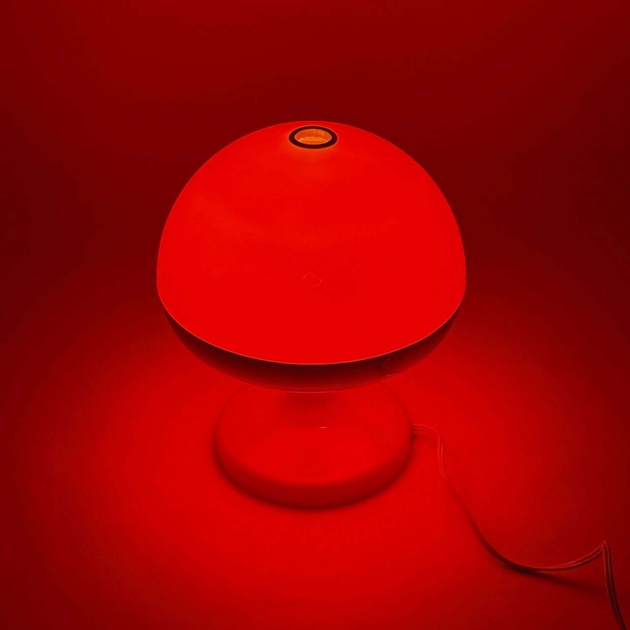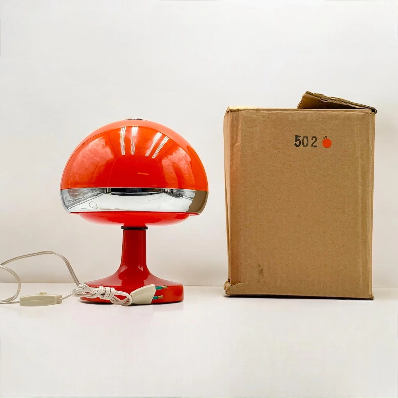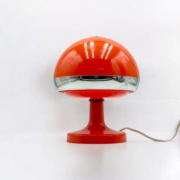 item. table lampperiod. 1970scountry. Italymaterial. plasticcolor. orange, chromedimensions. 19 x 19 x 22 H.condition. new old stock with original box. excellent vintage condition, marks on the base and support due to cable twisting, scattered surface scratches. works with a standard E14 bulb. european plug – works outside Europe with a simple adapter.art. no. 1674