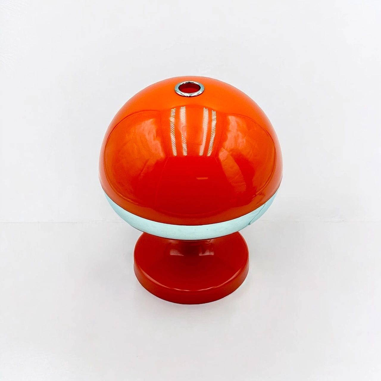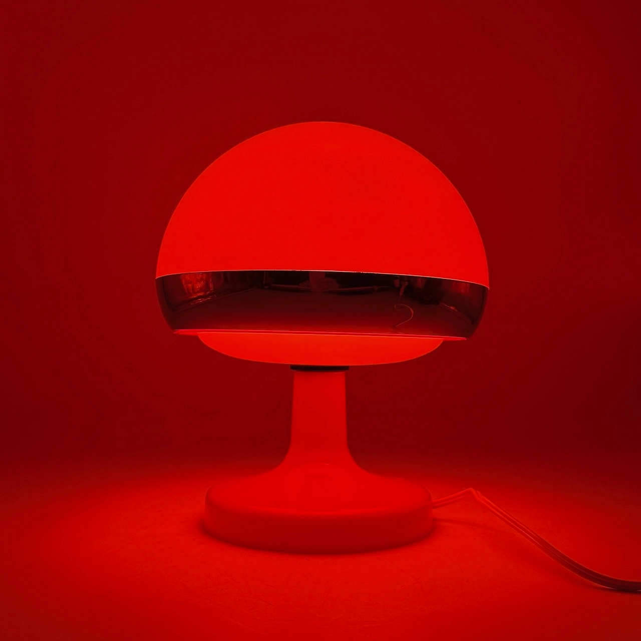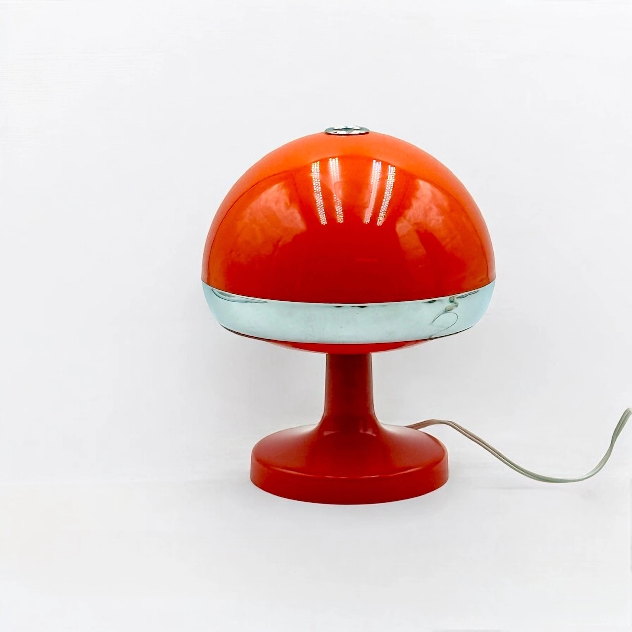 Bring a bold retro vibe to your space with this eye-catching vintage 70s Mushroom Lamp. Crafted entirely from plastic, it showcases a striking orange body enhanced by a polished chrome ring, capturing the essence of the space-age aesthetic.