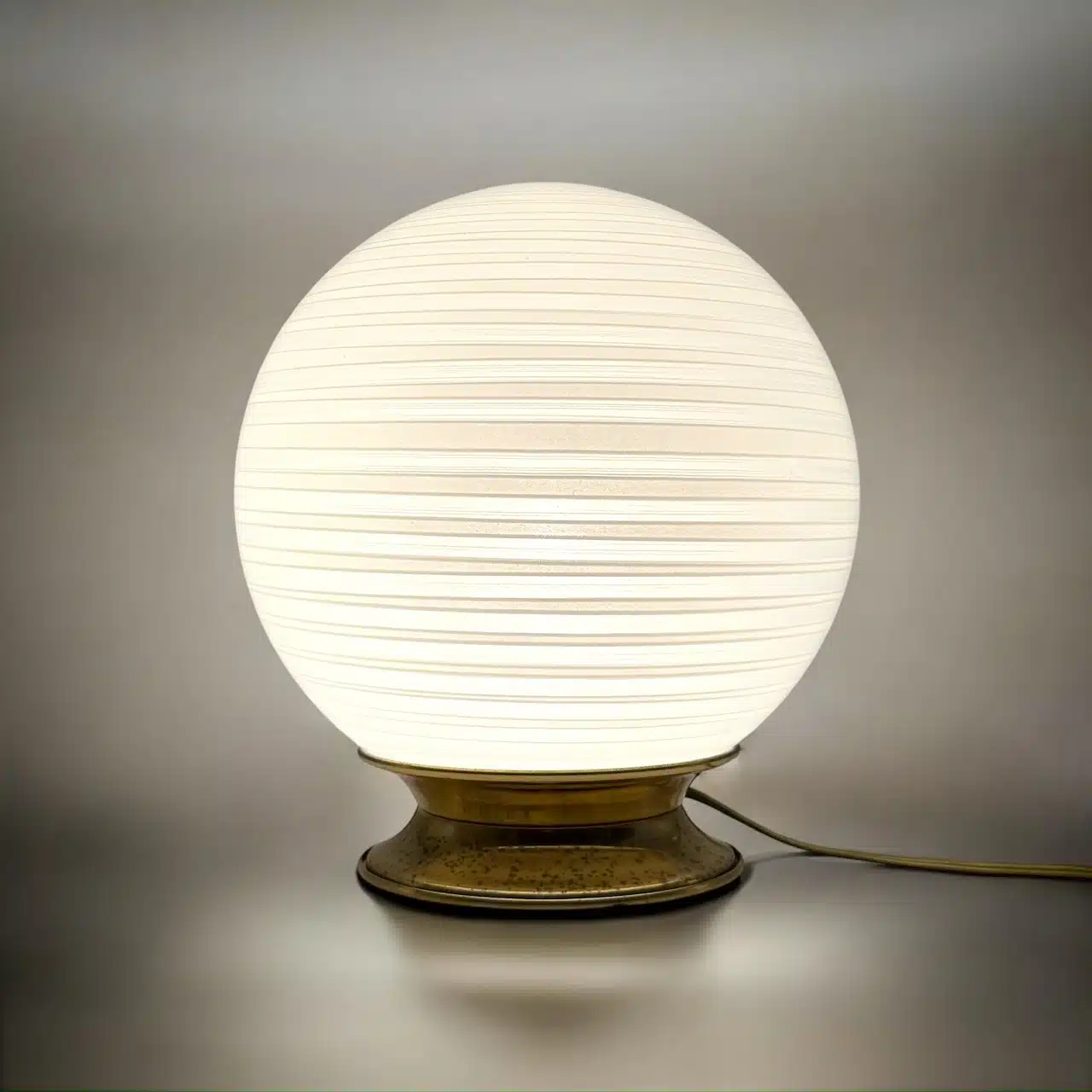 Illuminate your space with this stunning 1970s swirl glass table lamp, a charming piece of Italian design and manufacturing. The hand-blown white glass shade features a mesmerizing spiral relief pattern, diffusing a warm and inviting glow. Resting on a brass base with a rich patina, this lamp exudes vintage charm while maintaining its original electrical components.