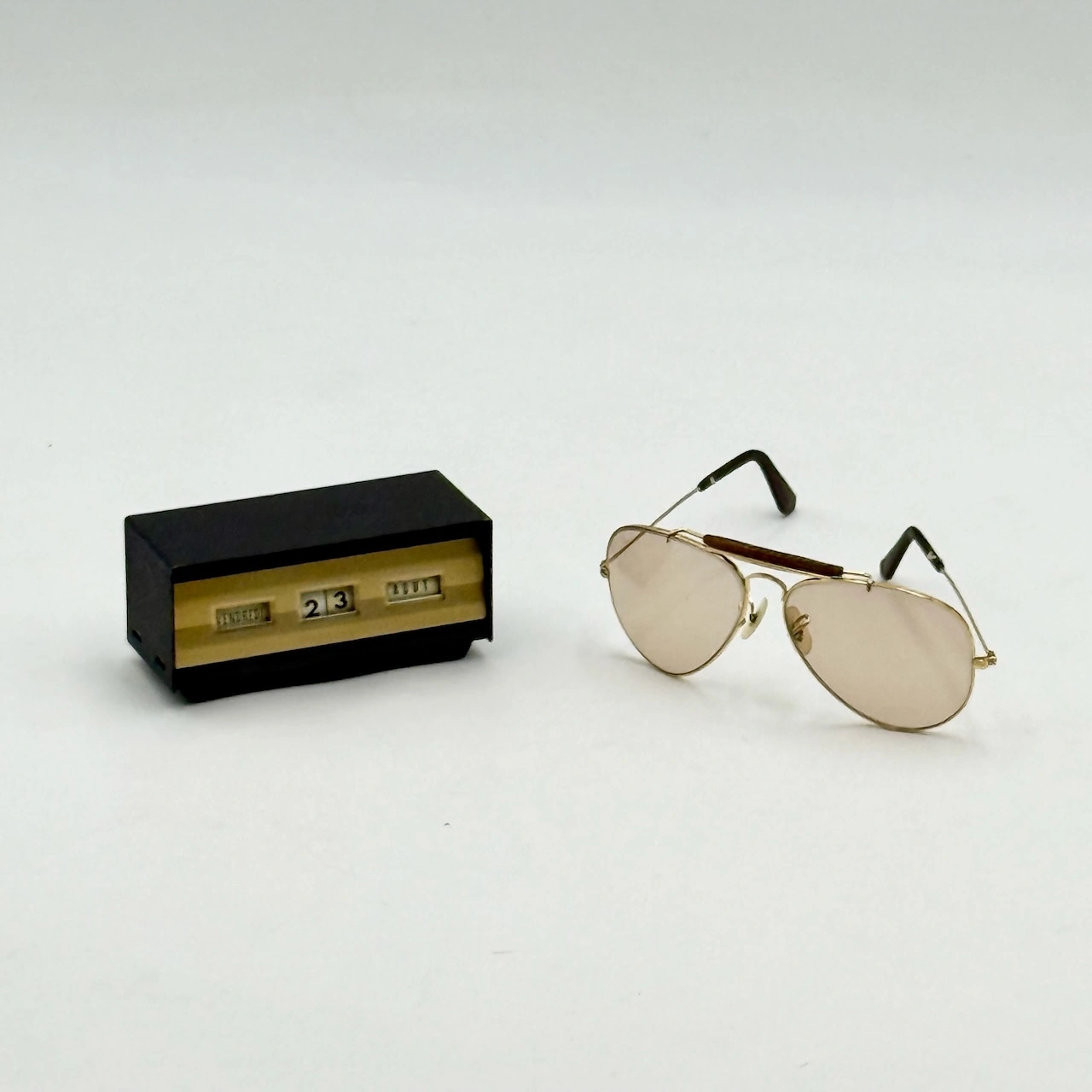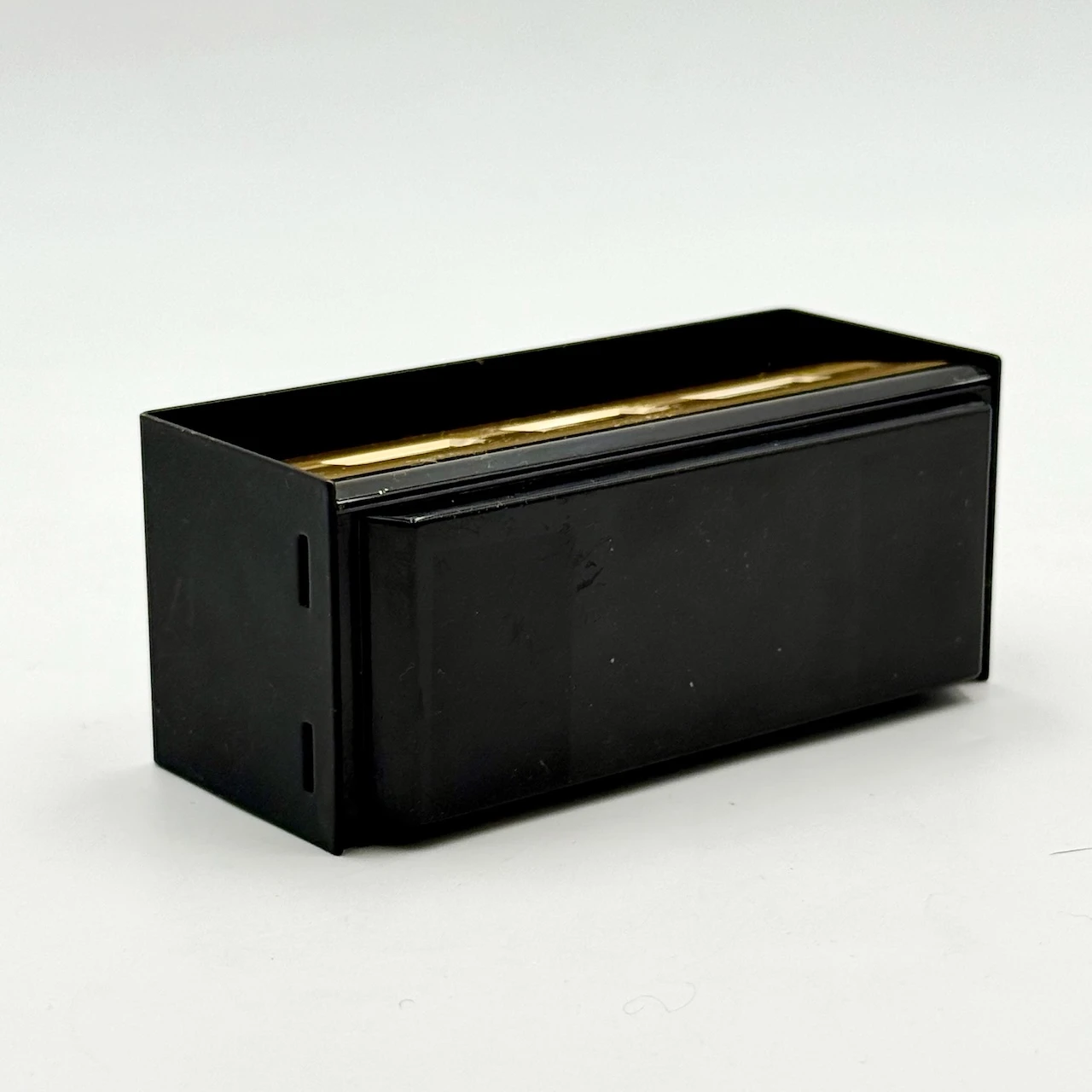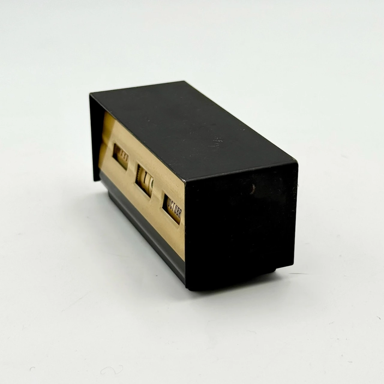 A refined vintage desk calendar by Maor, made in Spain in the 1970s. Compact, graphic, and fully functional, it combines black plastic with golden metal details for a timeless modernist desk object.