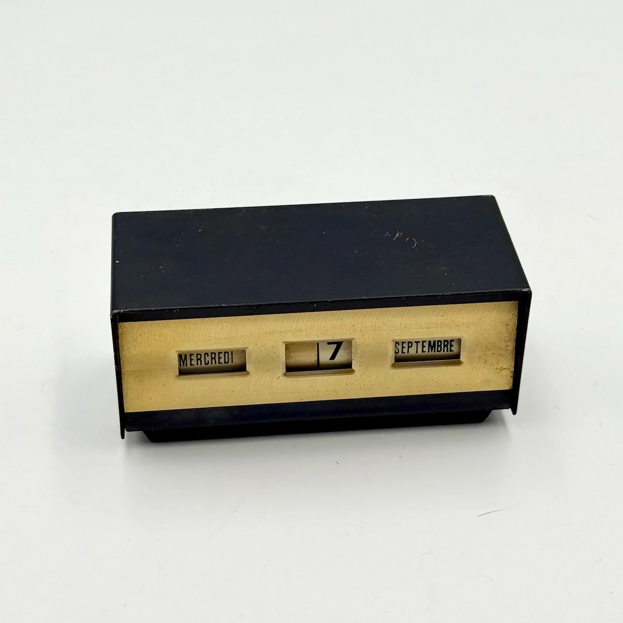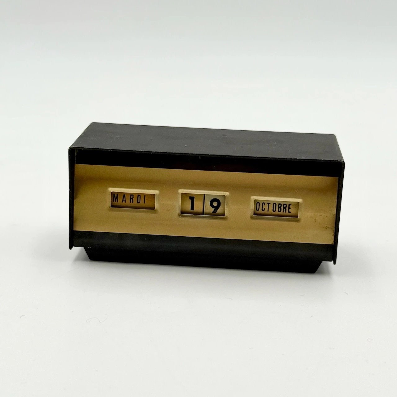The calendar features a black plastic body contrasted by refined golden metal details, creating a clean and graphic visual rhythm typical of European modern design of the era. Days and months are displayed in French, indicating that this vintage desk calendar was intended for the French market, while the date is adjusted manually using four rotating wheels located on the back. This perpetual mechanism allows continuous use without reference to a specific year.