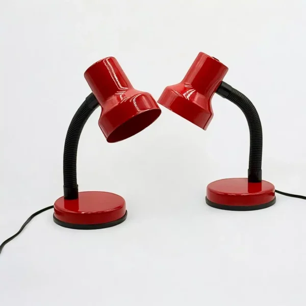 Each lamp features a glossy red metal lampshade that makes a bold visual impact while blending seamlessly with various decor styles. The flexible gooseneck stem ensures easy adjustment, allowing you to direct the light precisely where needed—whether you’re reading, working, or adding a warm, industrial ambiance to your room.