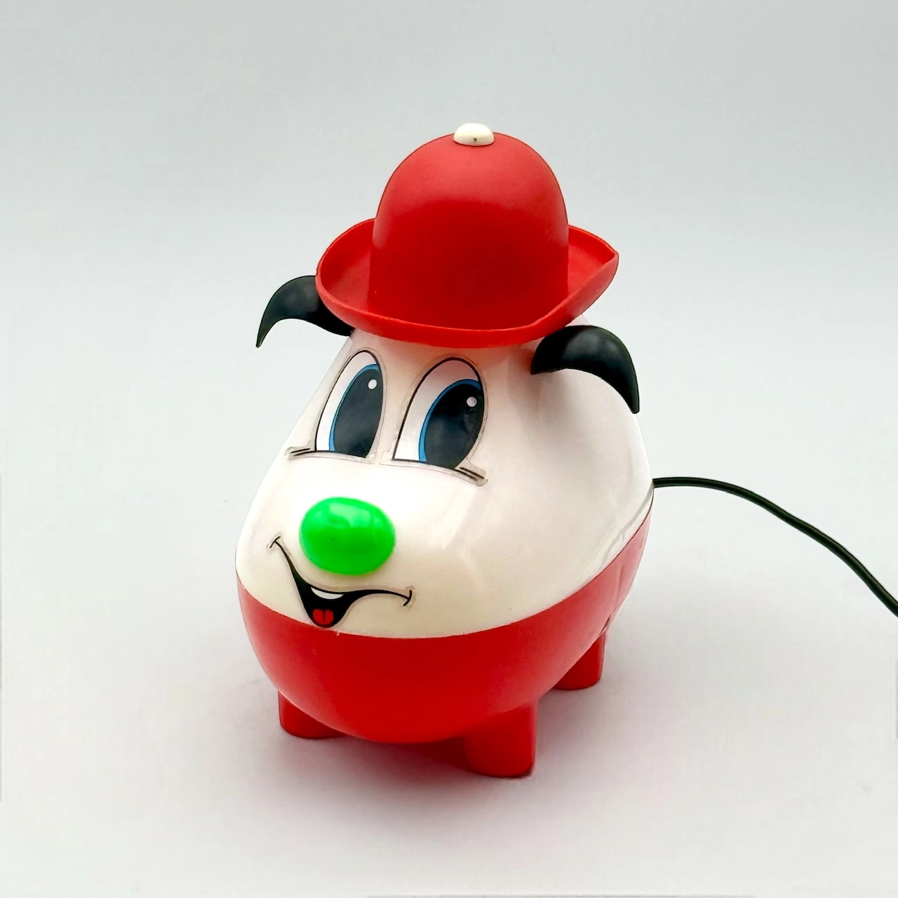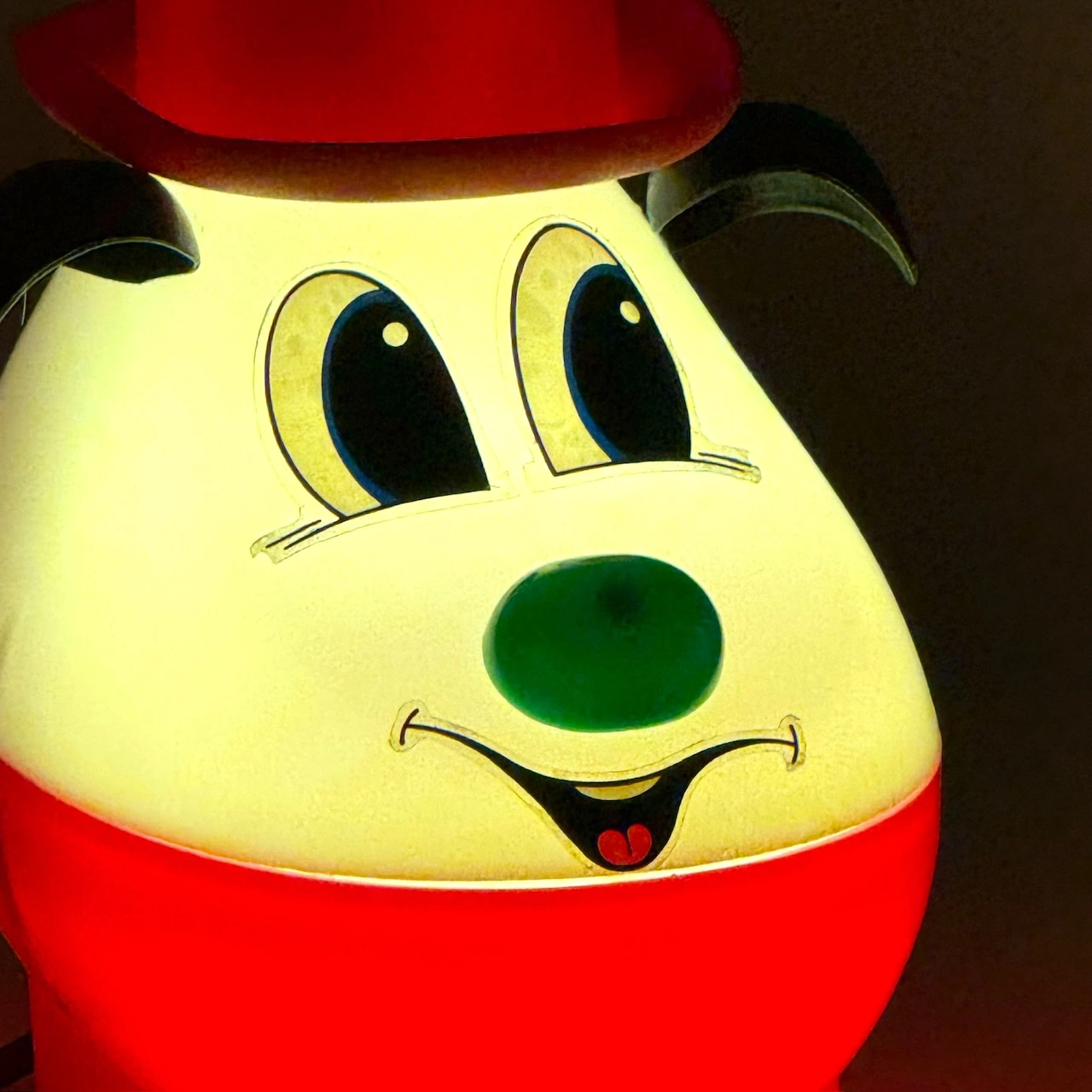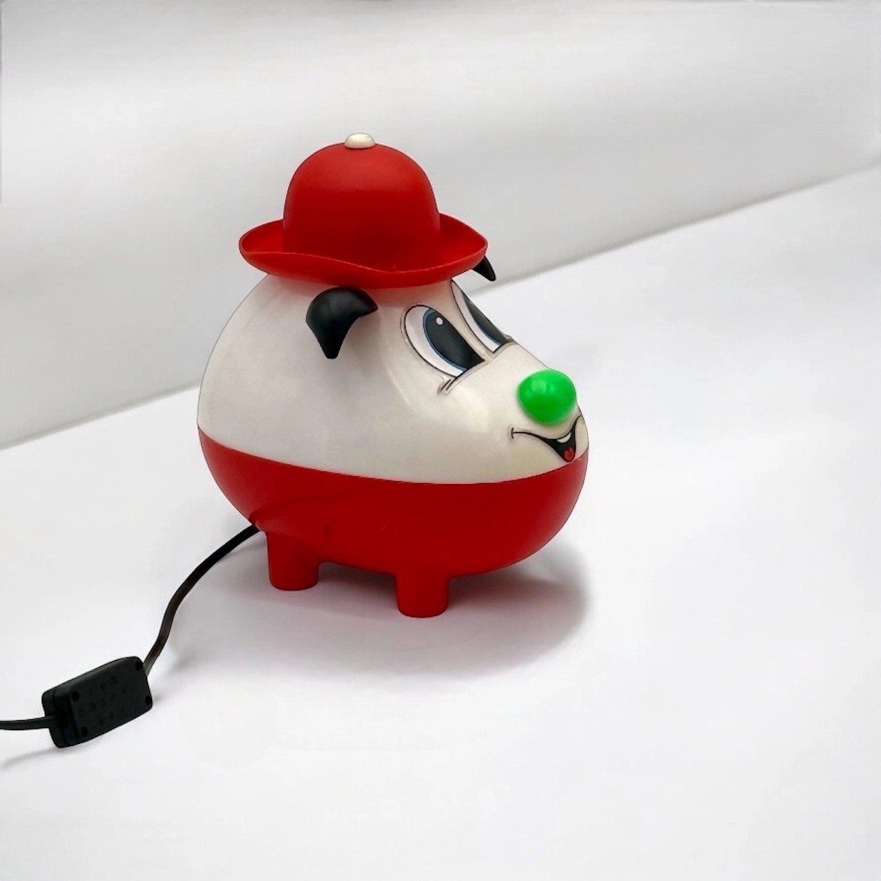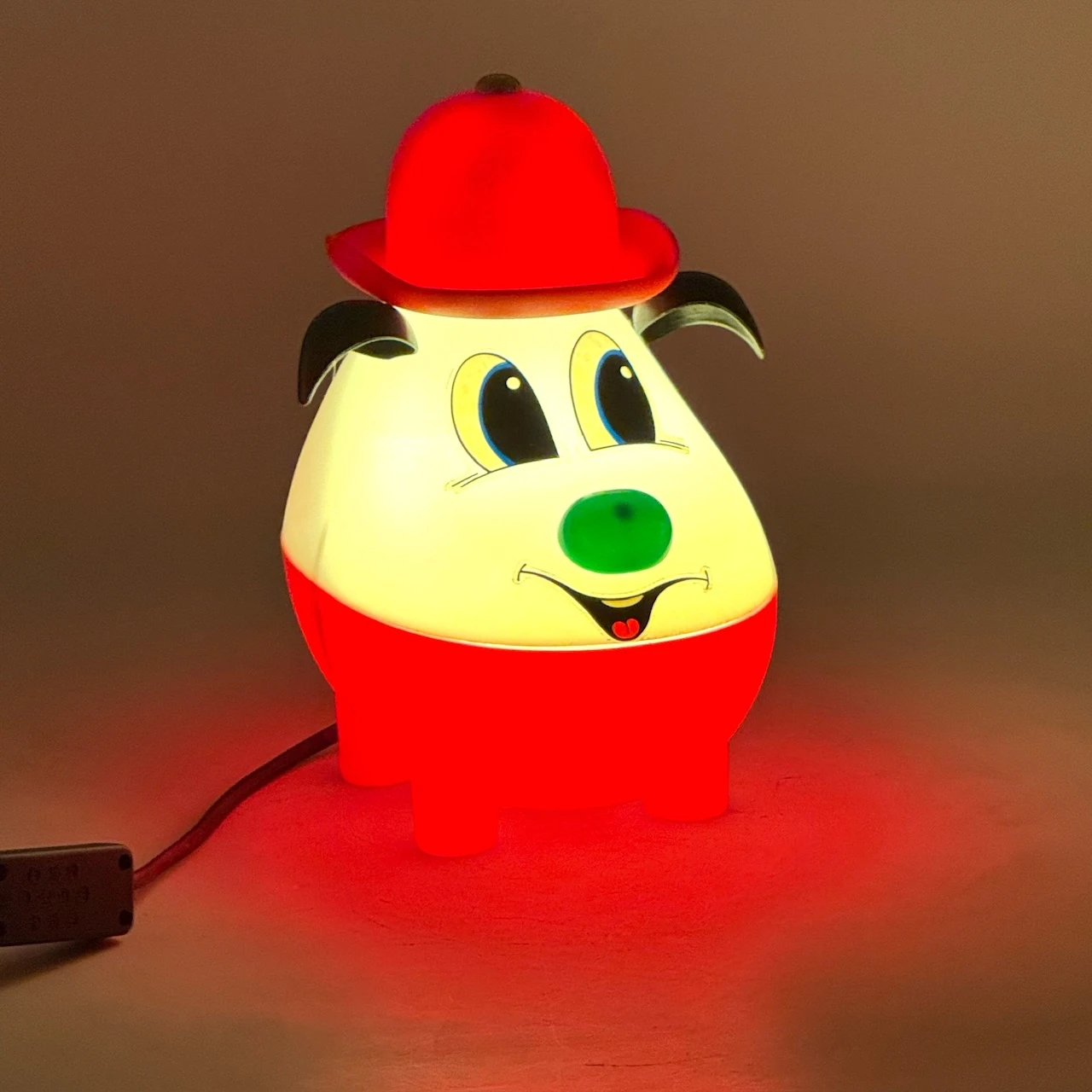 Add a nostalgic touch to a childs bedroom with this vintage kids lamp from the 1970s-80s, crafted by Stilfer, Italy. Designed in the shape of a cute puppy, this charming bedside lamp features a bright red base, a white face with green nose and black ears, and a unique hat-like shade, making it a delightful addition to any children’s room or nursery decor.