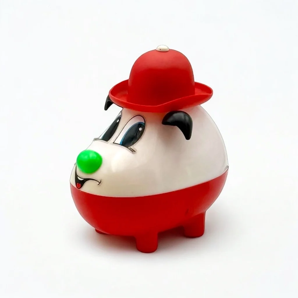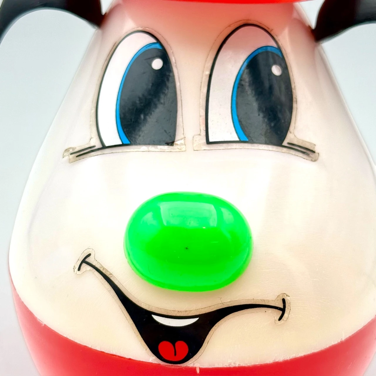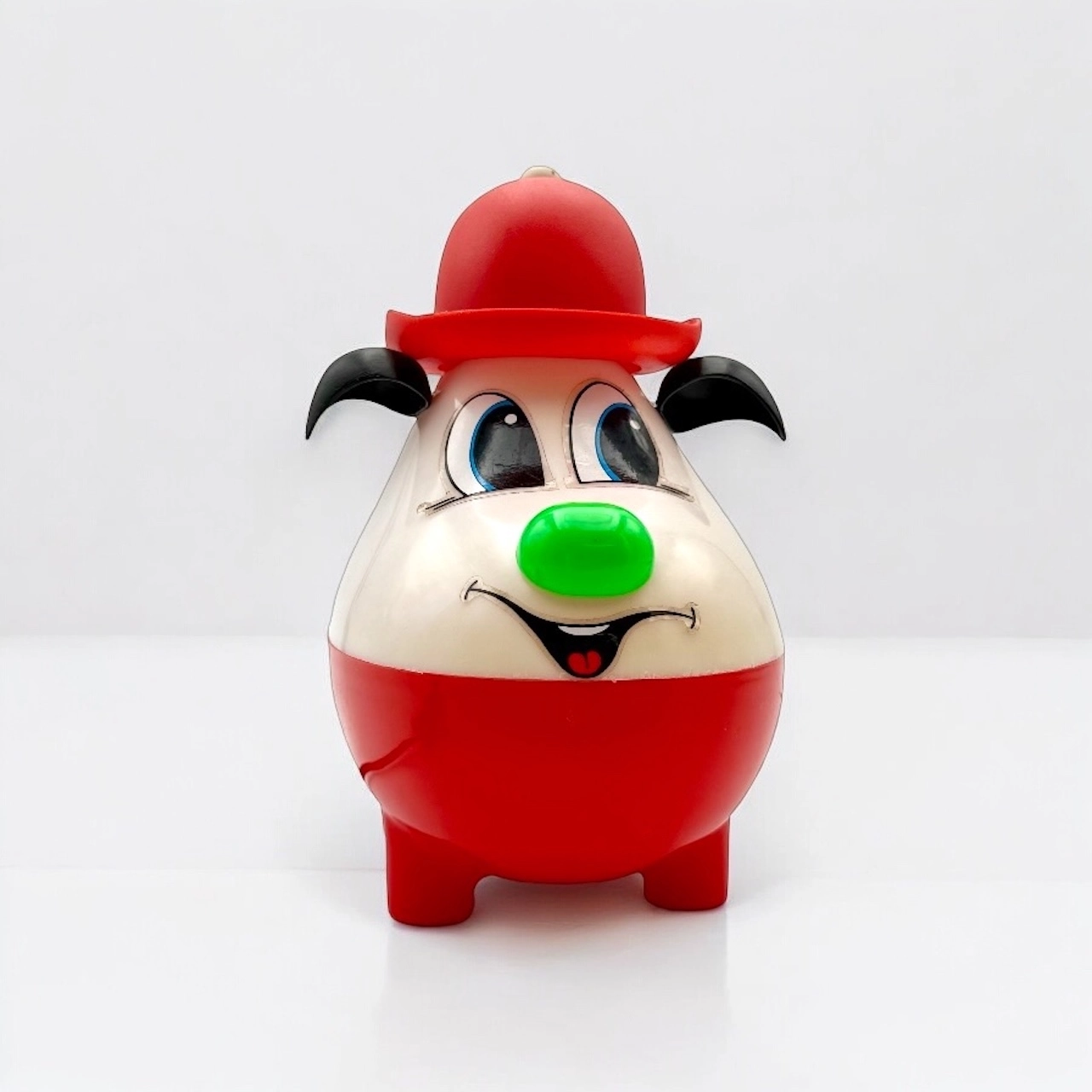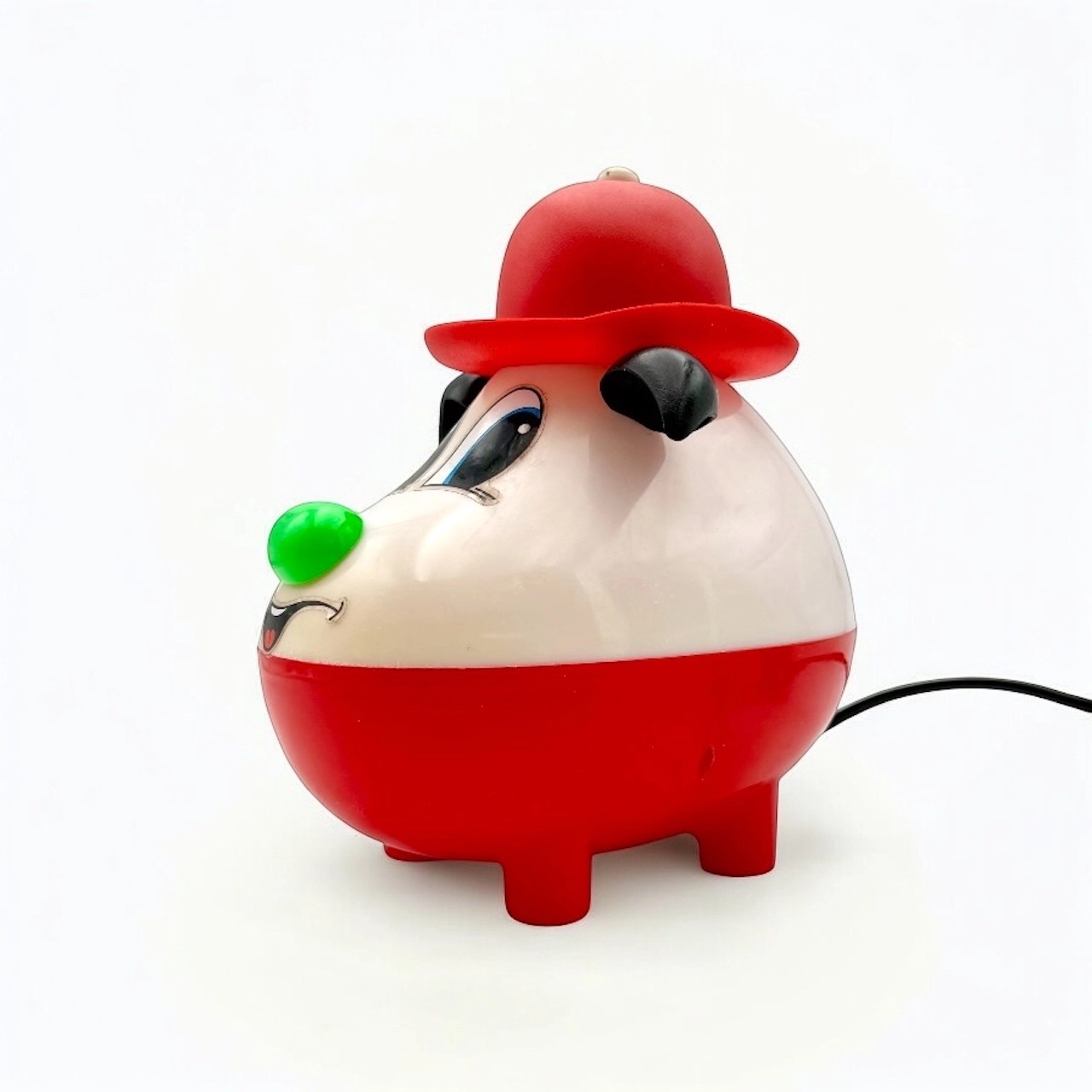 Add a nostalgic touch to a childs bedroom with this vintage kids lamp from the 1970s-80s, crafted by Stilfer, Italy. Designed in the shape of a cute puppy, this charming bedside lamp features a bright red base, a white face with green nose and black ears, and a unique hat-like shade, making it a delightful addition to any children’s room or nursery decor.