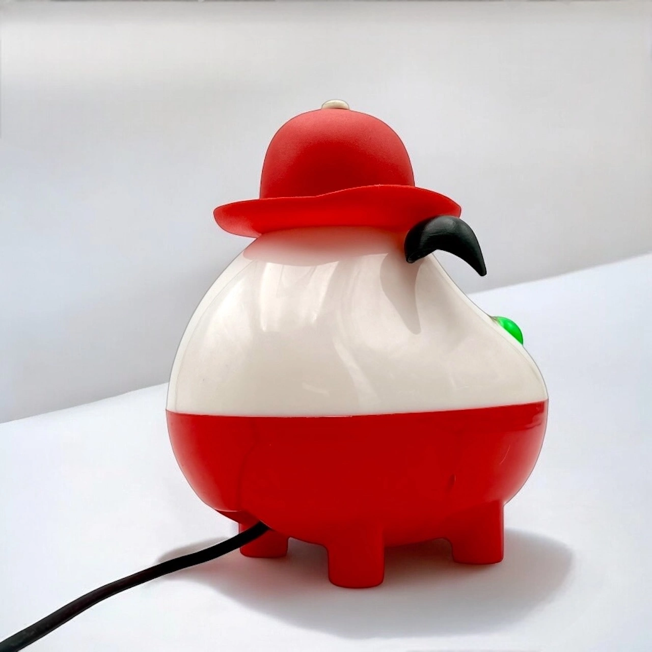 item. table, desk or bedside lampmaker. stilfer milanoperiod. 1970s/80scountry. Italymaterial. plasticcolor. white, red, black, greendimensions (cm). 19 x 14.5 x 22 Hcondition. excellent vintage condition, with all original components intact. The white plastic surface has some yellowing, and there is minor wear on the adhesive details (eyes and mouth)art. no. 1658
