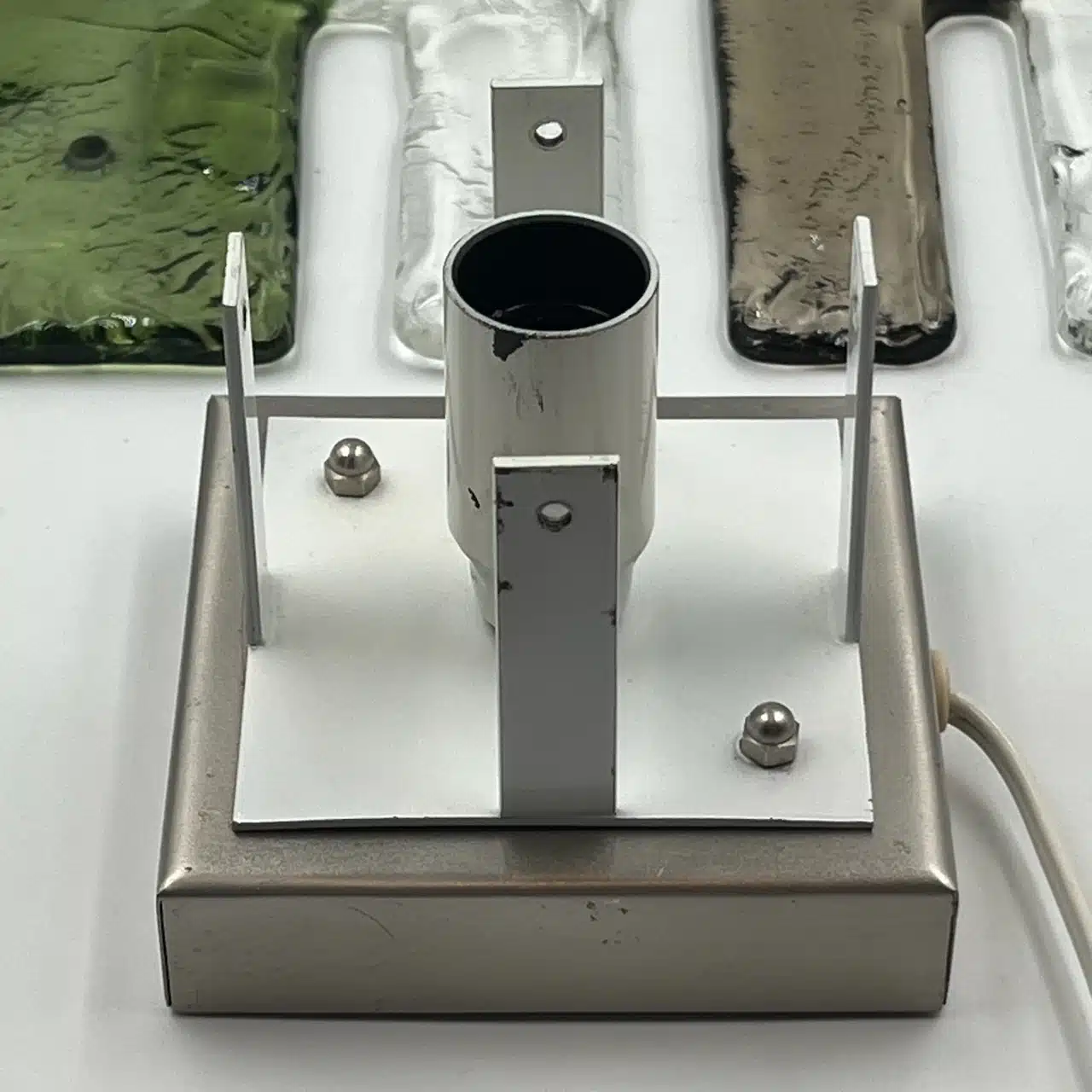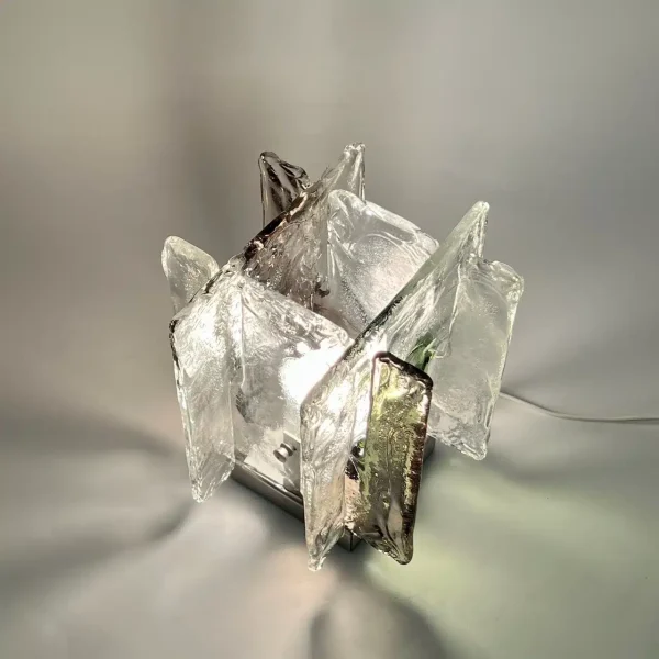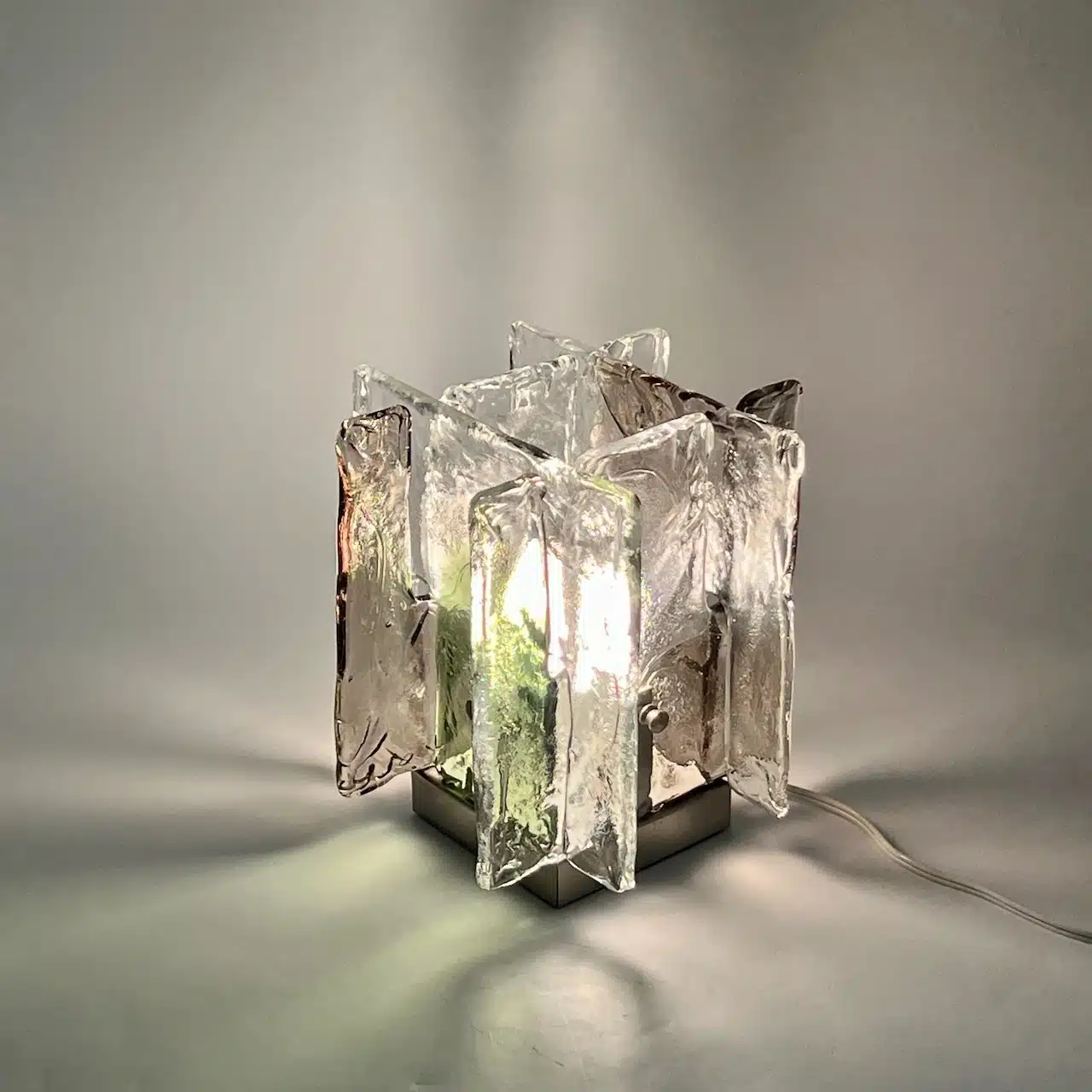 item. table lampmodel. LT 361designer. carlo nasonmaker. mazzegaperiod. 1970scountry. Italymaterial. ice-like murano glass, metalcolor. green / brown, clear, chrome silverdimensions (cm). 17.5 x 17.5 x 20 Hcondition. new old stock, never used. excellent vintage conditions, with healthy glass and minor traces of oxidation of the metallic base.art. no. 1544