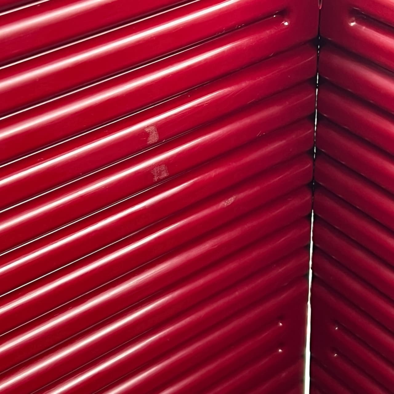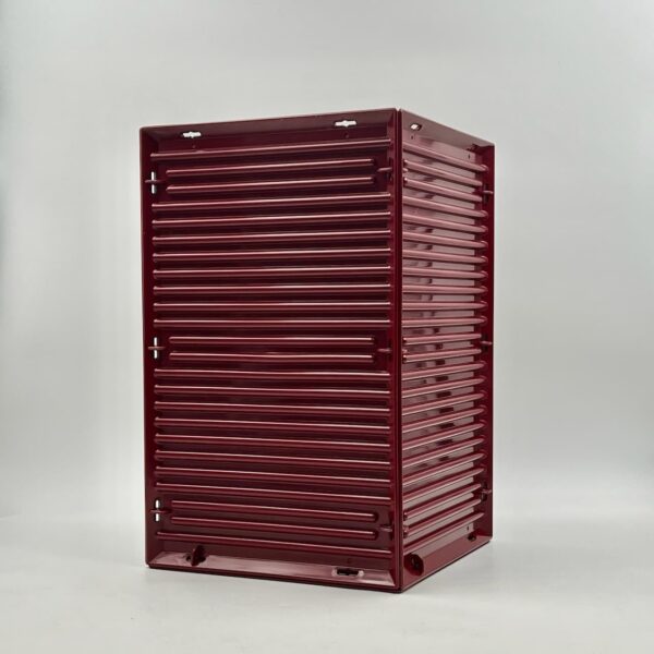 In excellent condition, this Olivetti Synthesis paper basket maintains its glossy bordeaux hue, with only light traces of wear inside the basket. While three of the 16 small hooks are missing, this does not affect the overall stability or functionality of the item.