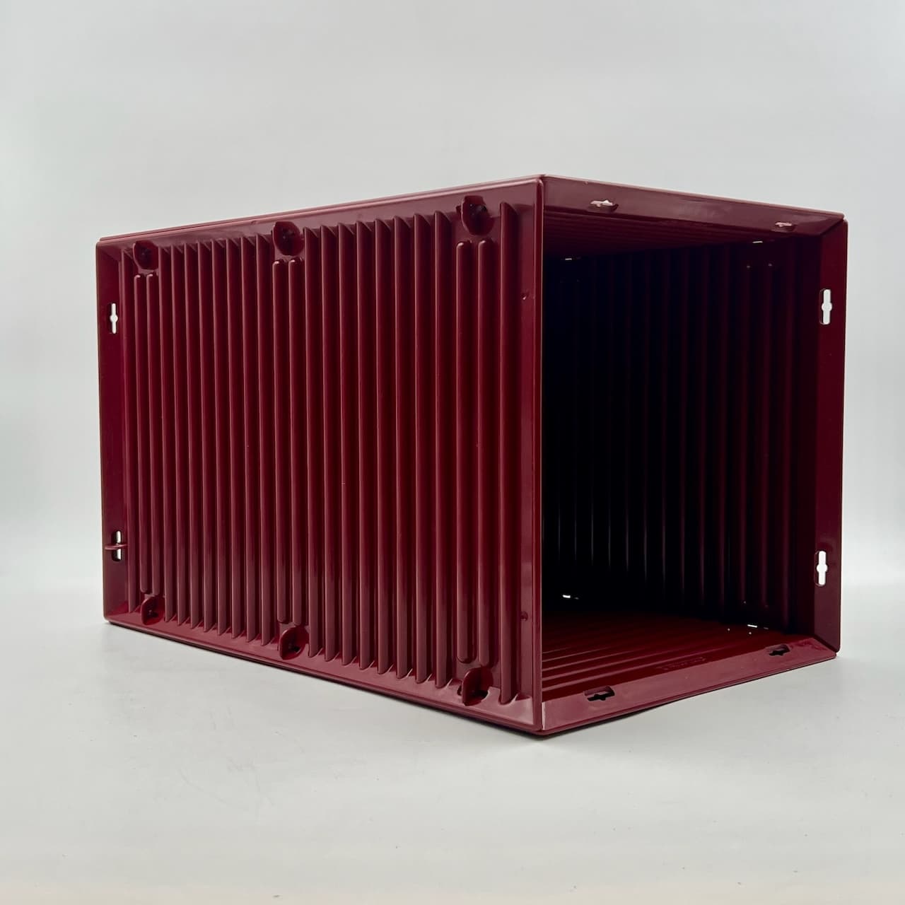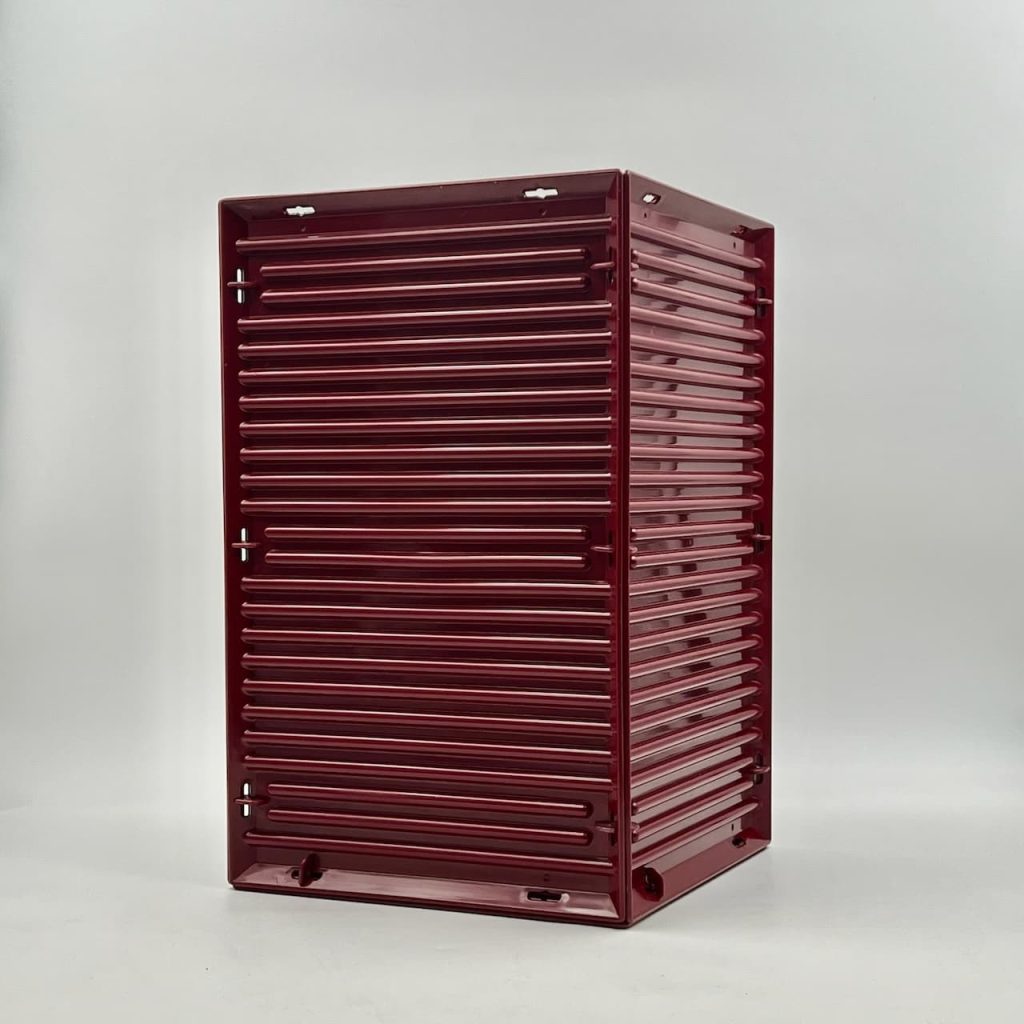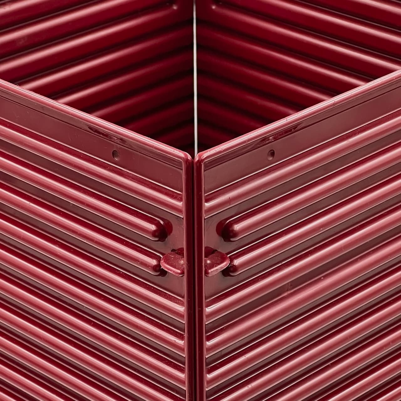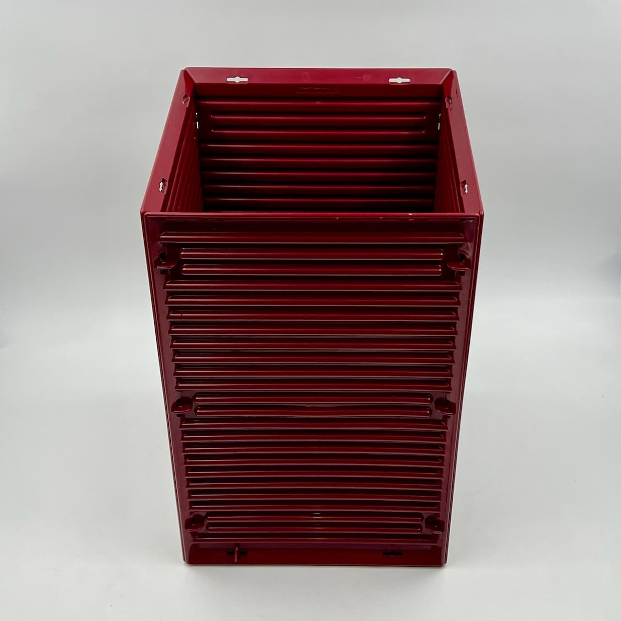 item. paper basketmodel. synthesisdesigner. ettore sottsassmaker. olivettiperiod. 1970scountry. italymaterial. melaminecolor. burgundydimensions (cm). 25x 25 x 40 Hcondition. excellent conditions, with glossy bordeaux hue and light traces of wear inside the basket. Three little hooks out of 16 are not present – however this does not impact the stability of the item.