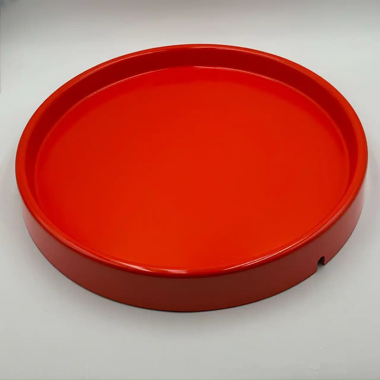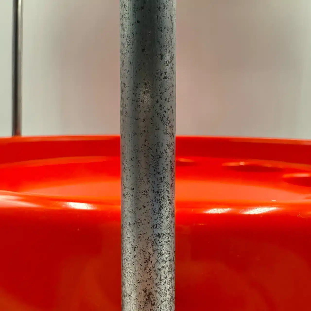 Add a bold pop of 70s flair to your space with this stunning vintage orange bar cart by Dal Vera, a distinctive name in Italian design and manufacturing. This serving trolley captures the essence of the decade with its vibrant orange plastic trays and sleek, functional metal structure.
