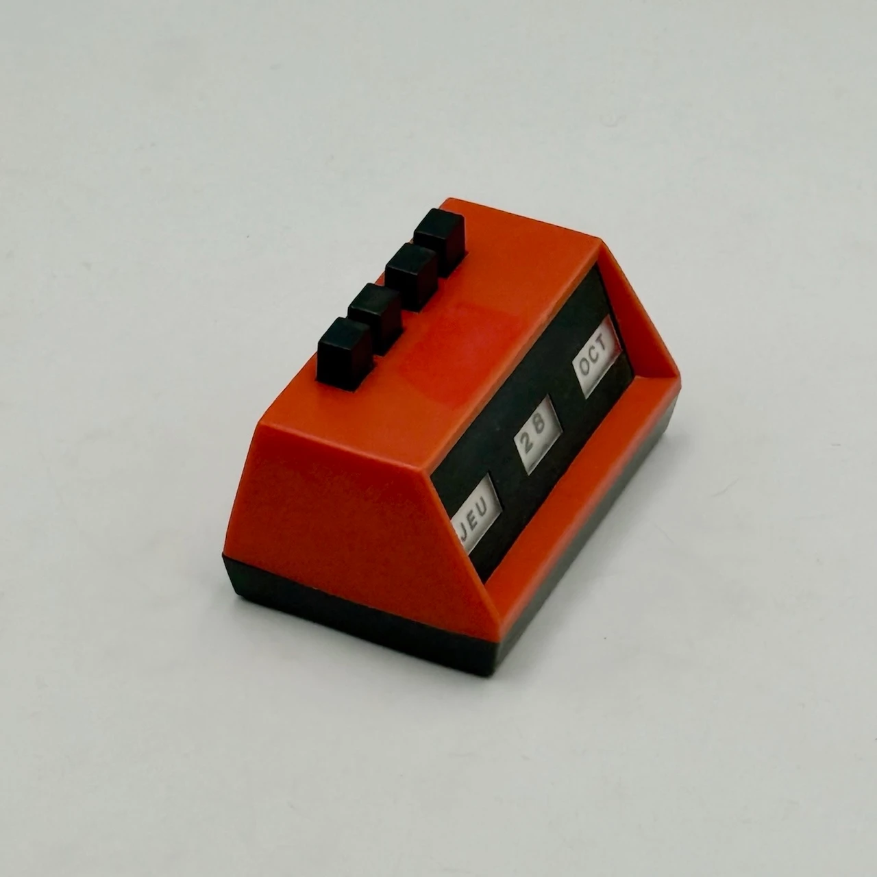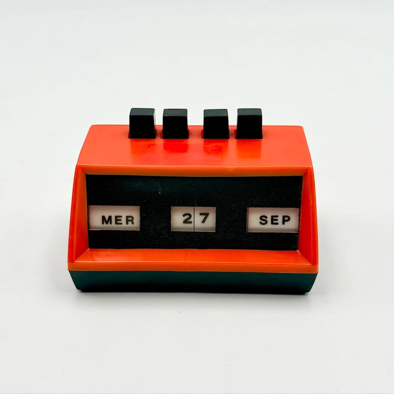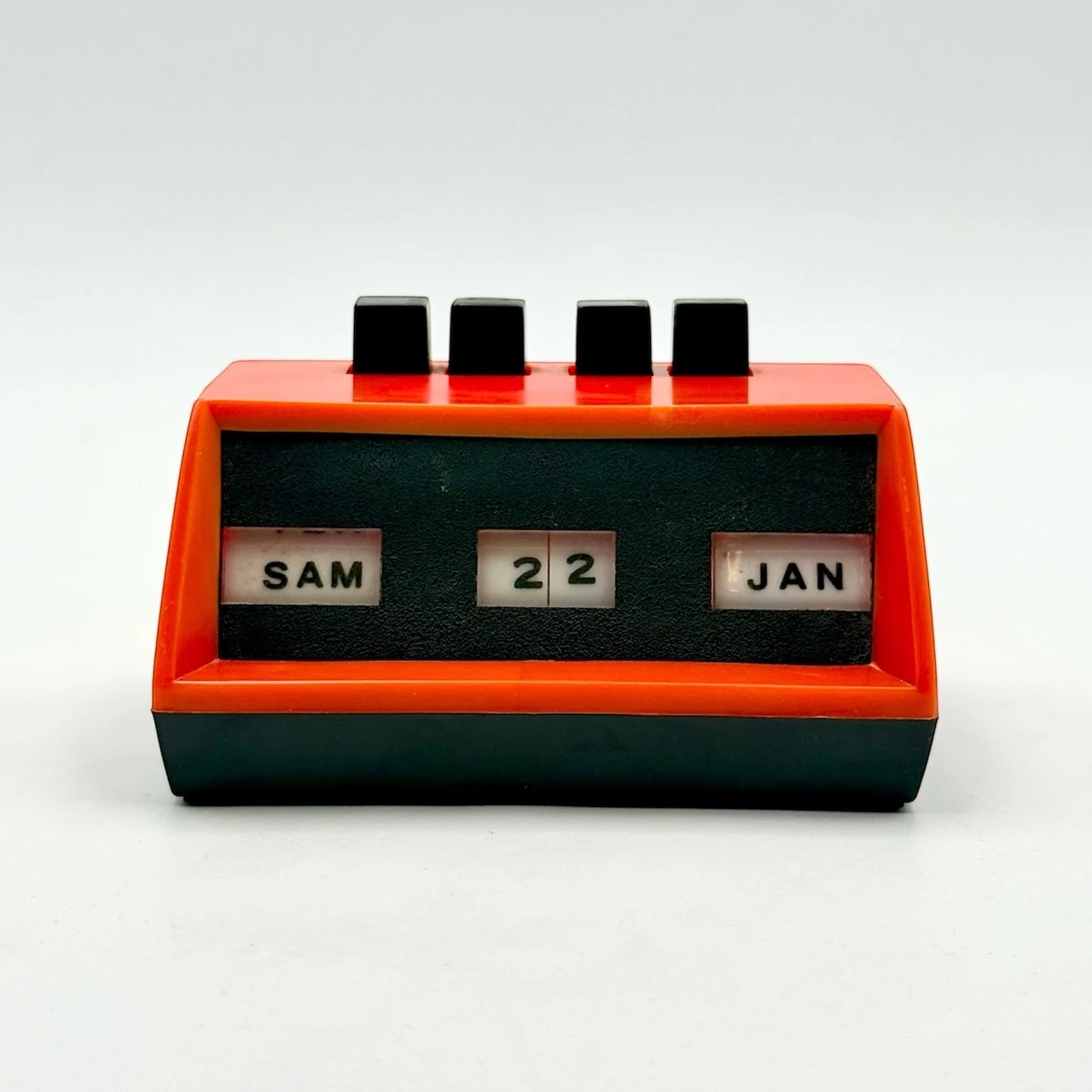 Designed as a practical desk accessory, this calendar reflects the era’s fascination with modular objects and expressive plastics. Its strong visual presence makes it ideal for a workspace, bookshelf or bedside table, where it adds a subtle retro accent without overwhelming the space.