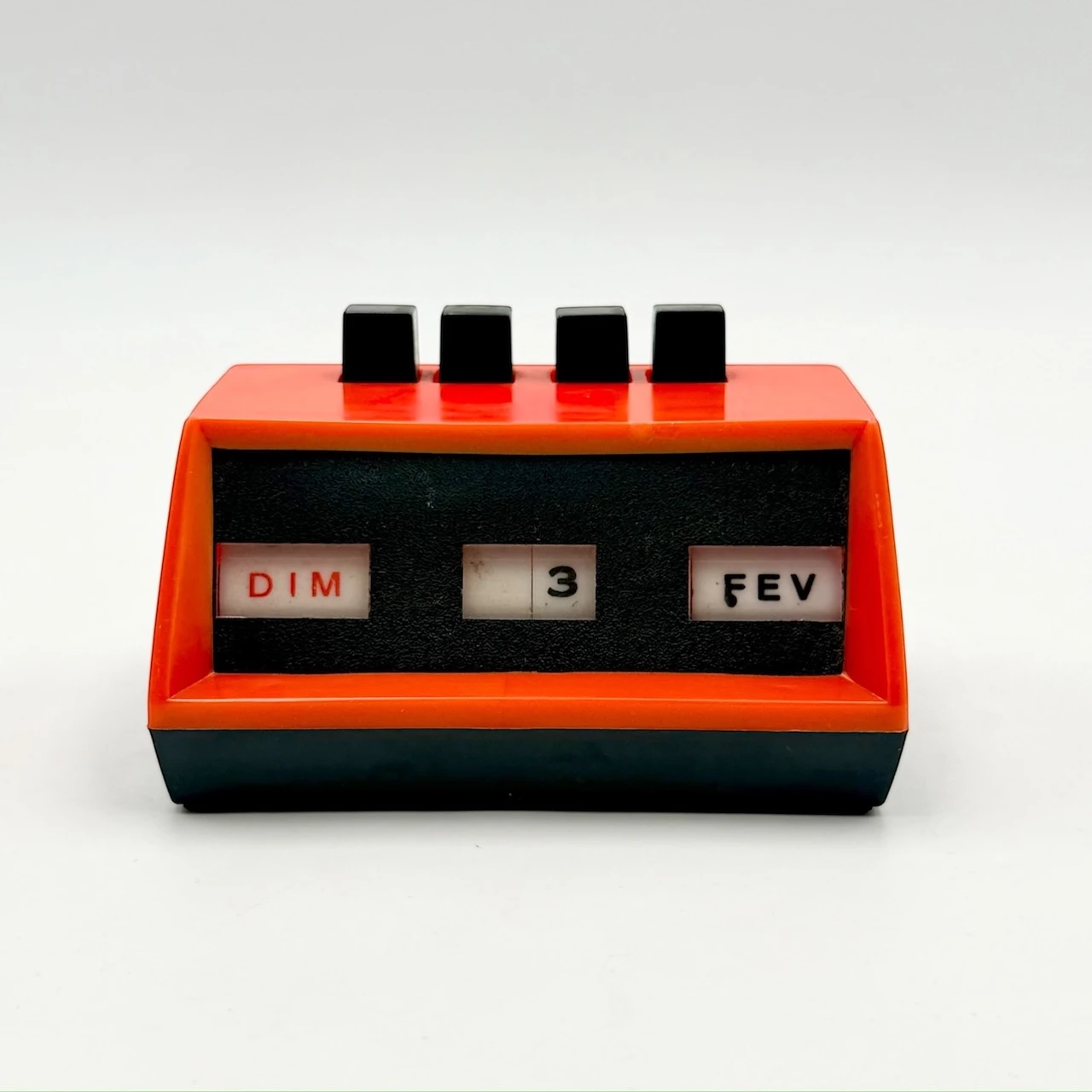This vintage perpetual calendar from the 1970s captures the joyful spirit of Pop design through bold colour, compact proportions and everyday functionality. Produced in vibrant red plastic with black details, it features French days and months arranged in a clean, graphic layout that feels both playful and timeless.