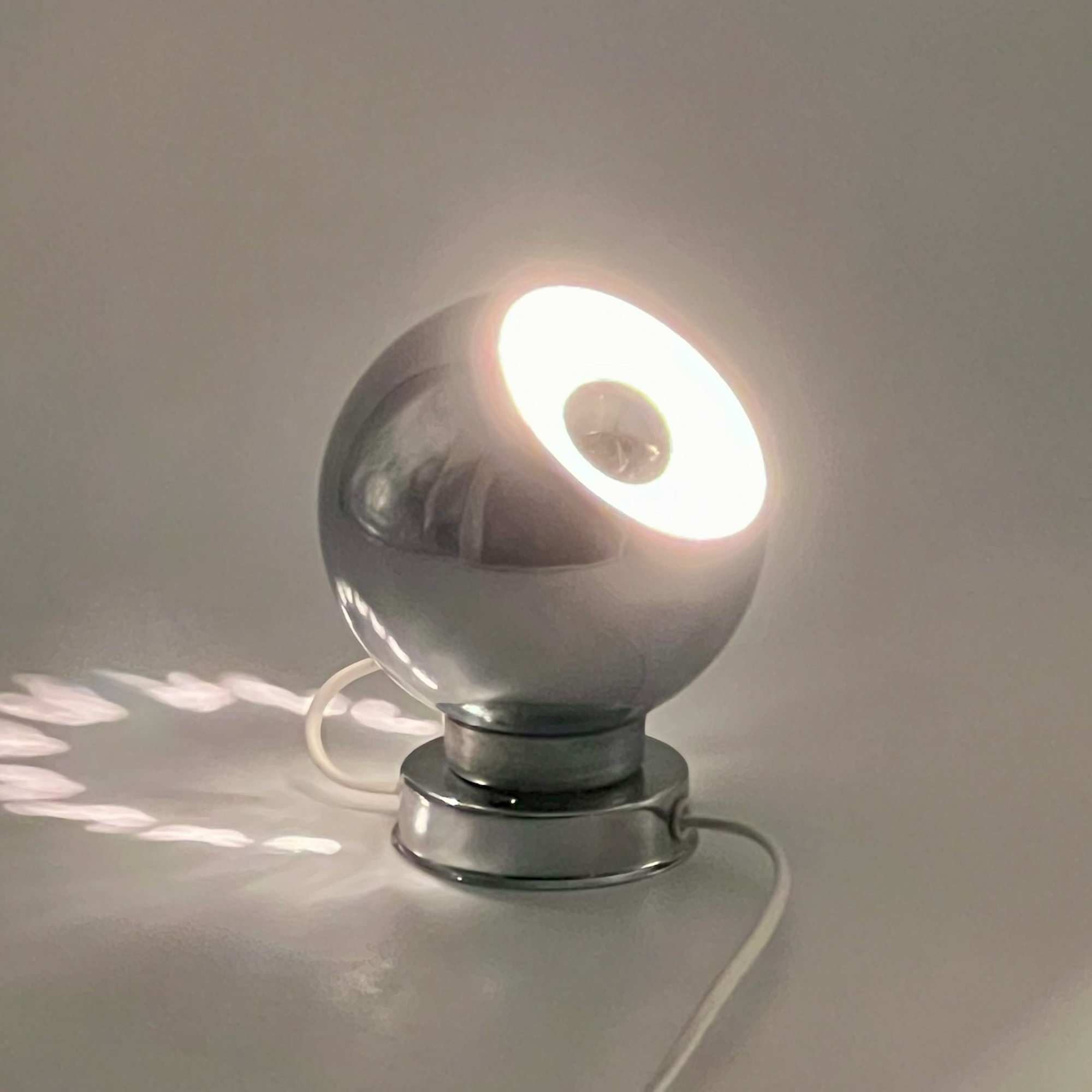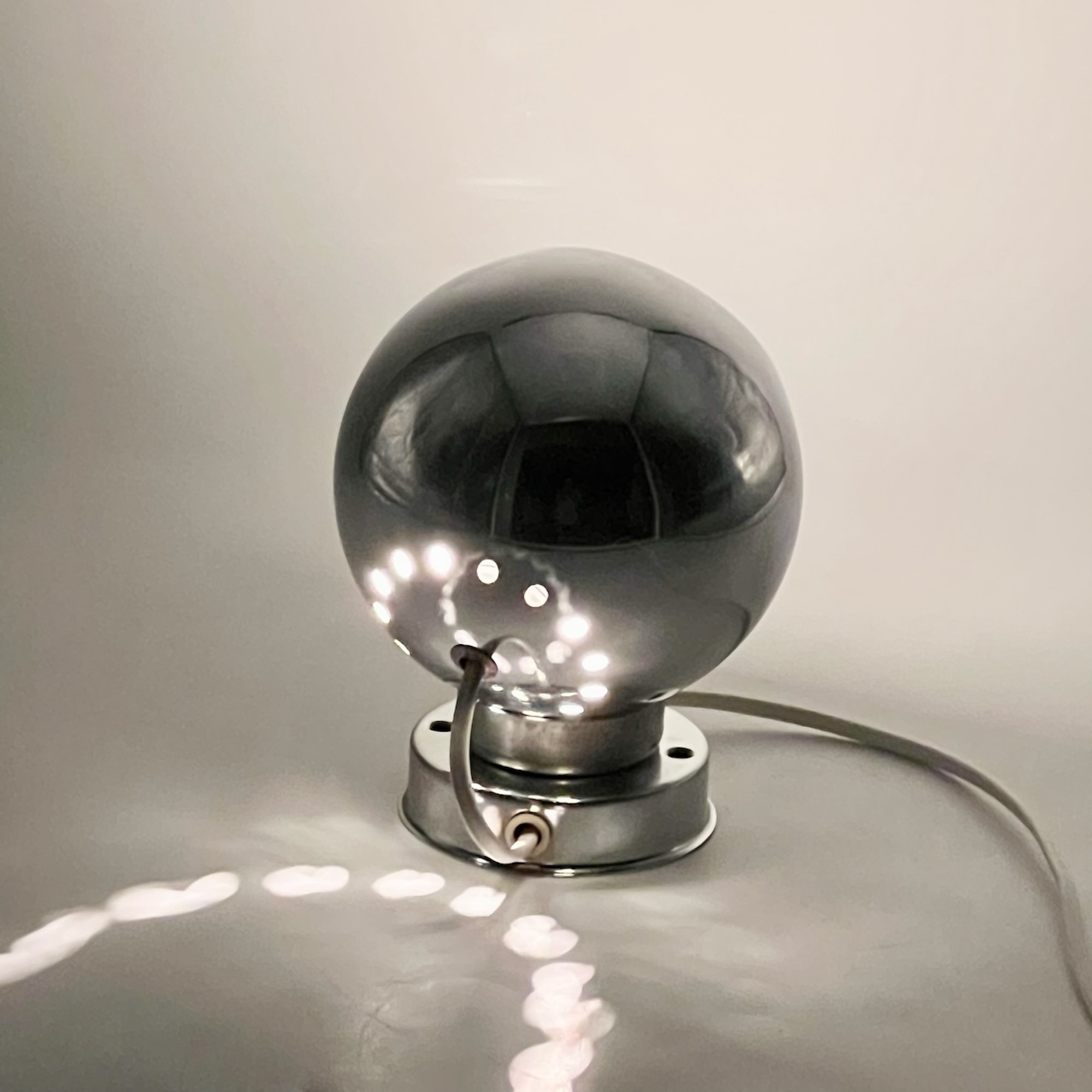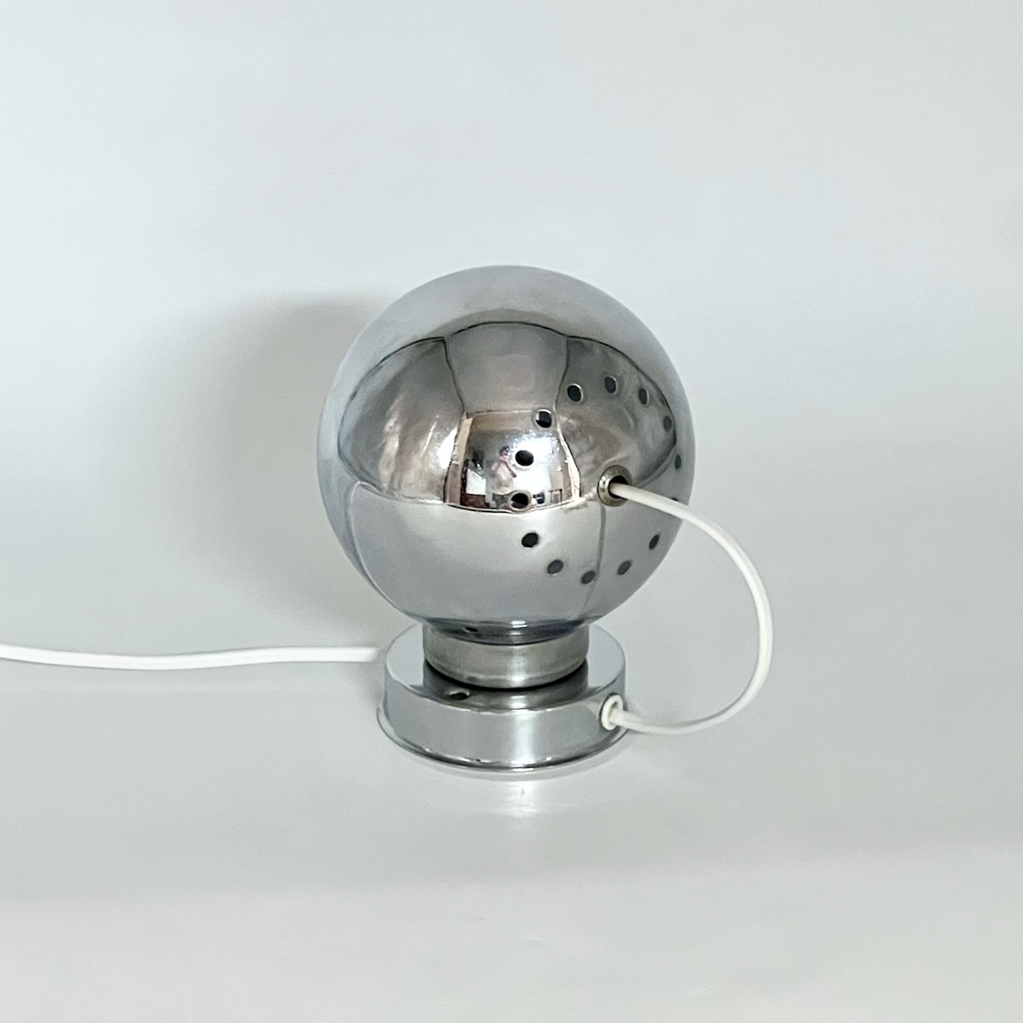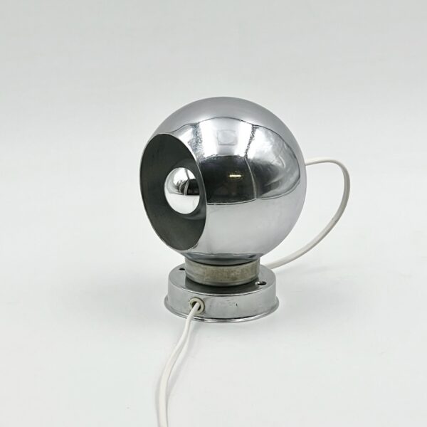 item. wall lamps, table lampsmodel. eyeballdesigner. goffredo reggianimaker. reggianiperiod. 1960scountry. Italymaterial. Chrome Metal, Bakelite Socketcolor. Chrome, Black, Whitedimensions (cm). 11 x 11 x 15 Hcondition. good vintage condition. signs of oxidation are most noticeable on the iron ring surrounding the support. rippled texture of the chrome finishand some wear on the interior of the sphere, consistent with its age and history.art. no. 1502