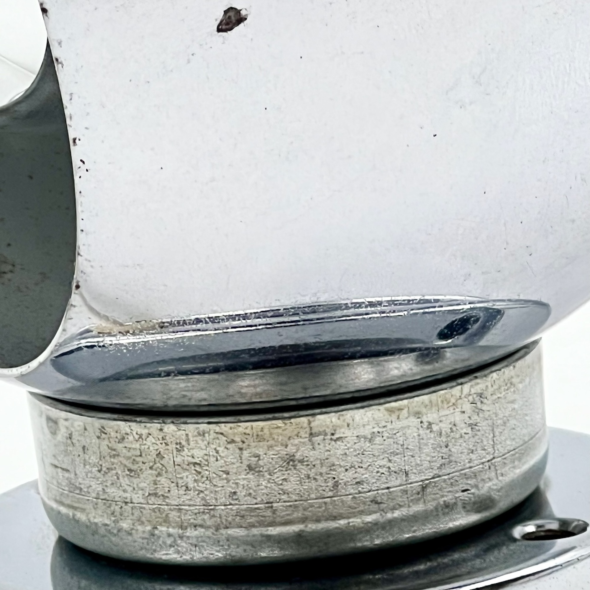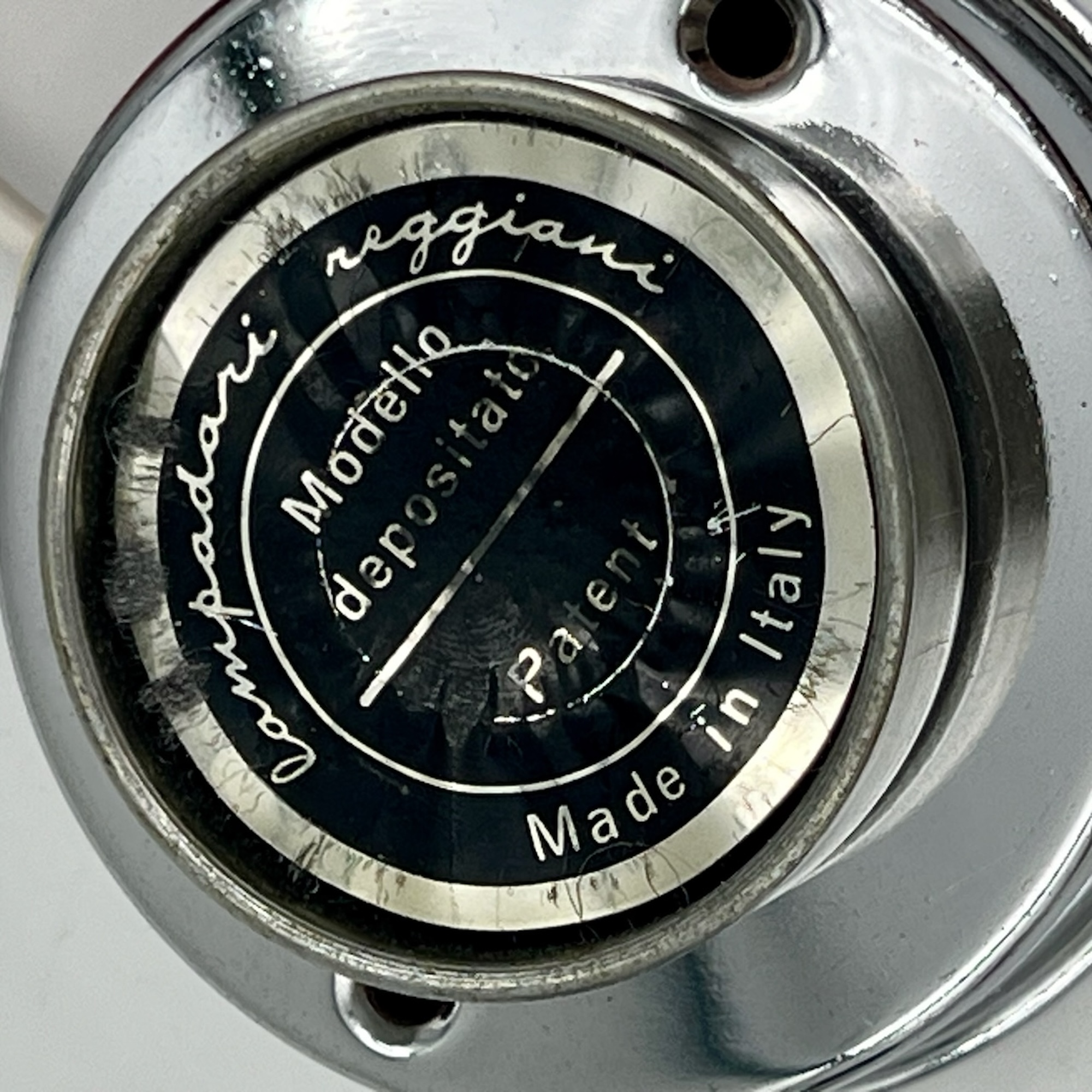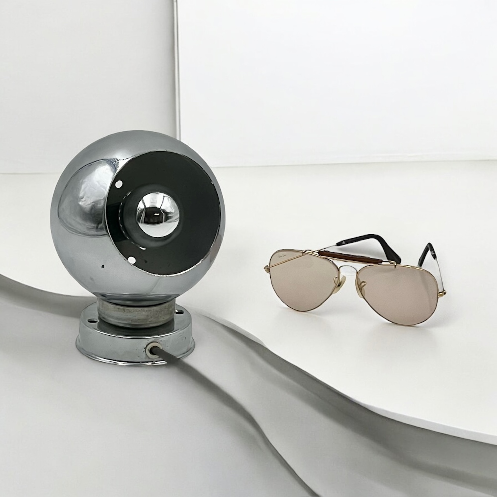 item. wall lamps, table lampsmodel. eyeballdesigner. goffredo reggianimaker. reggianiperiod. 1960scountry. Italymaterial. Chrome Metal, Bakelite Socketcolor. Chrome, Black, Whitedimensions (cm). 11 x 11 x 15 Hcondition. good vintage condition. signs of oxidation are most noticeable on the iron ring surrounding the support. rippled texture of the chrome finishand some wear on the interior of the sphere, consistent with its age and history.art. no. 1502
