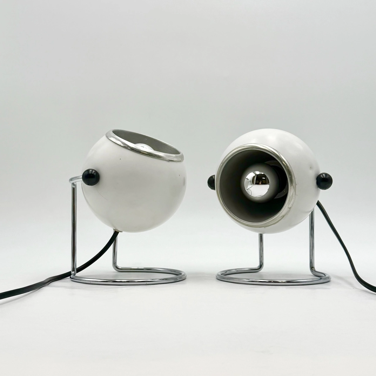 The adjustable eyeball spotlight heads allow you to direct light with precision, making them perfect as bedside lamps, desk accents or moody ambient lighting. Their minimalist white finish, combined with black knobs and polished chrome, evokes a futuristic, yet timeless charm.