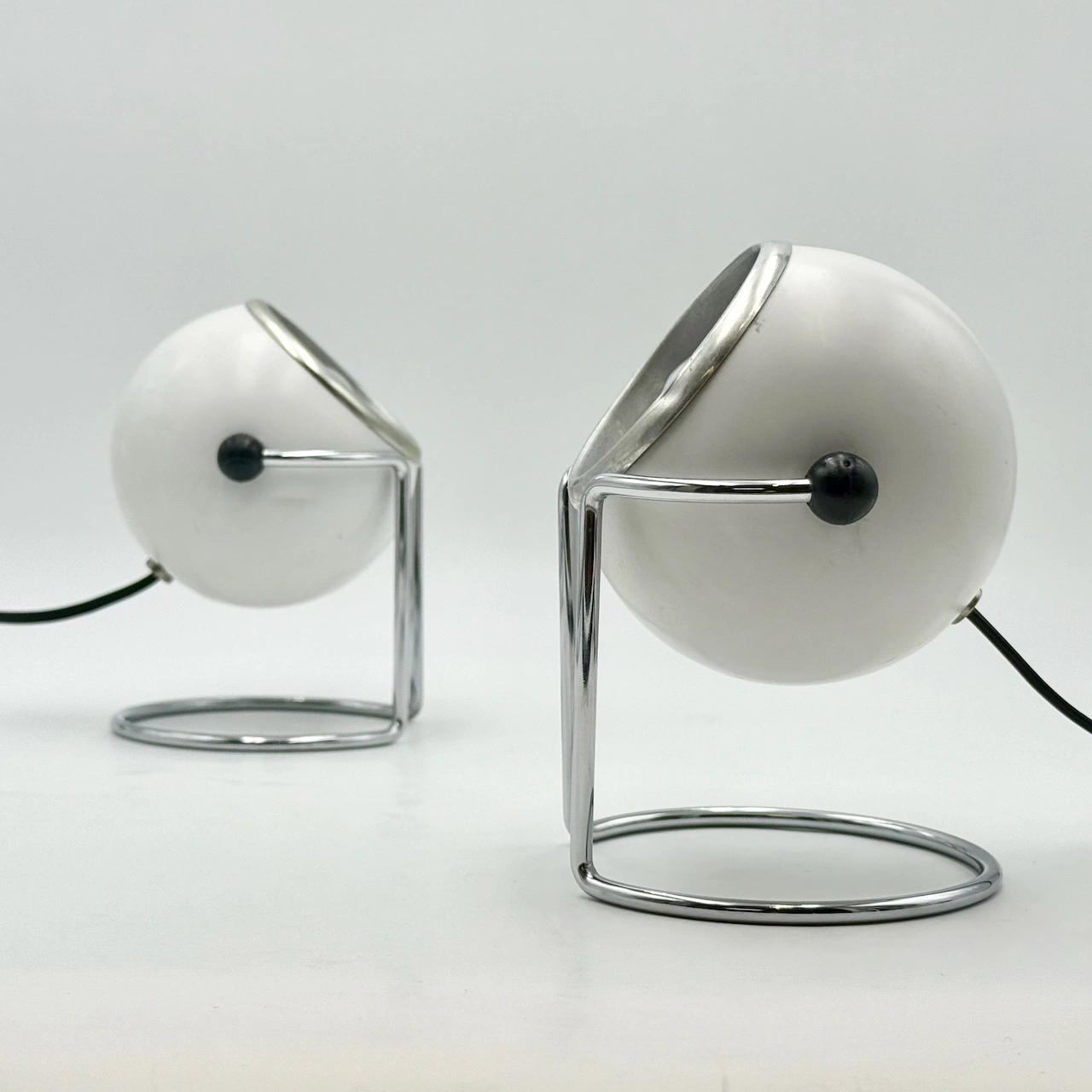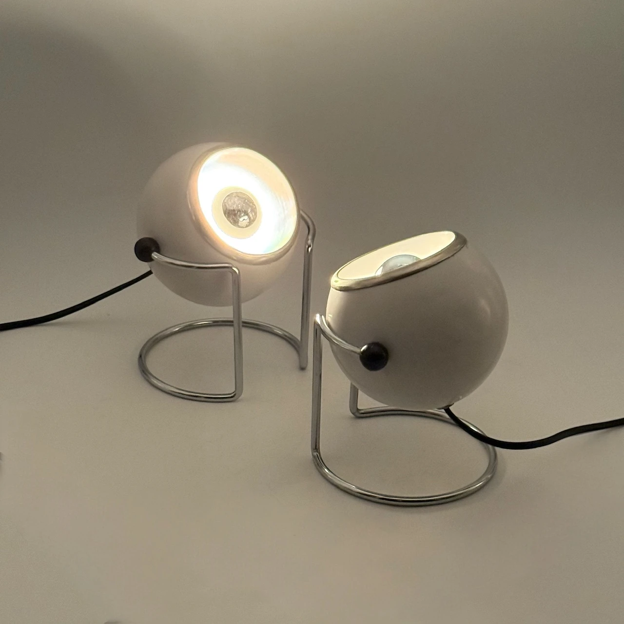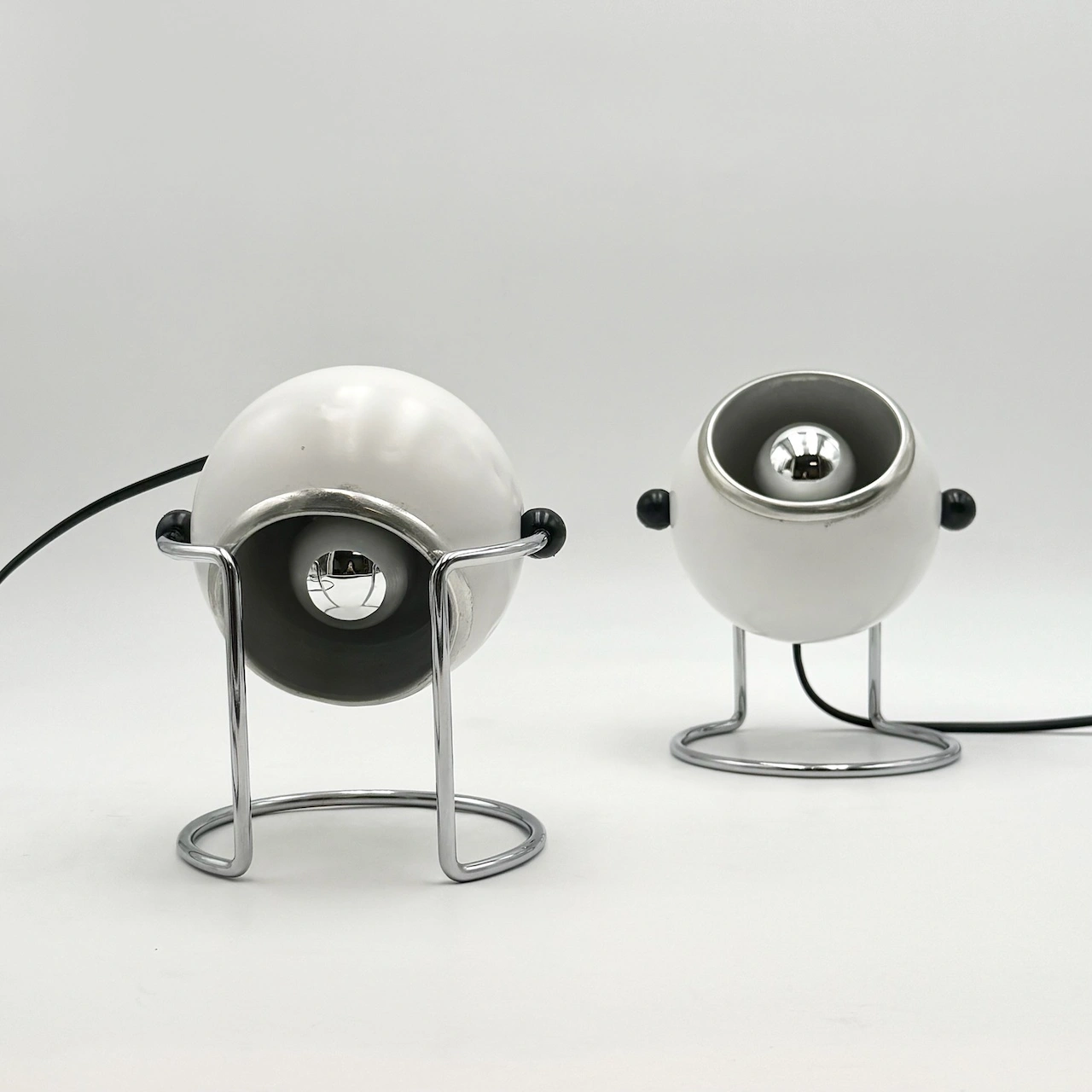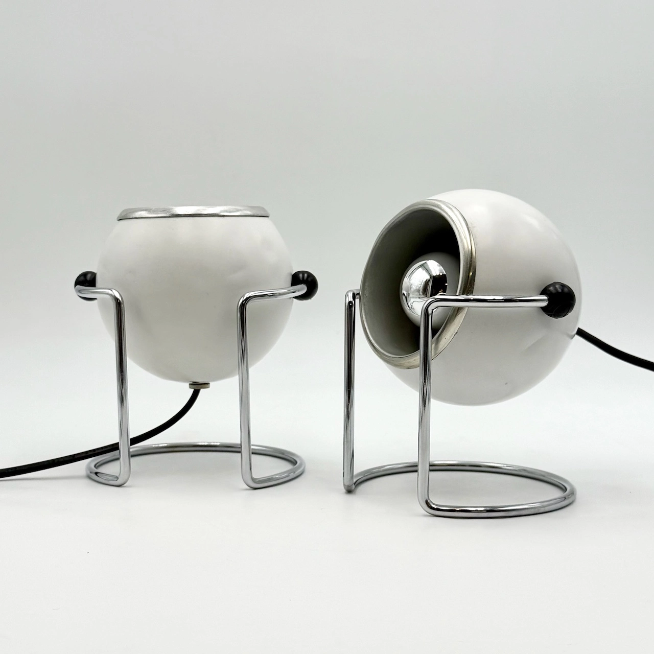 Step into the golden age of Italian Space Age design with this rare and iconic pair of Targetti eyeball lamps from the 1970s. Featuring distinctive spherical heads, elegant chrome bases and sculptural U-shaped supports, these lamps are a brilliant fusion of industrial function and bold aesthetic.