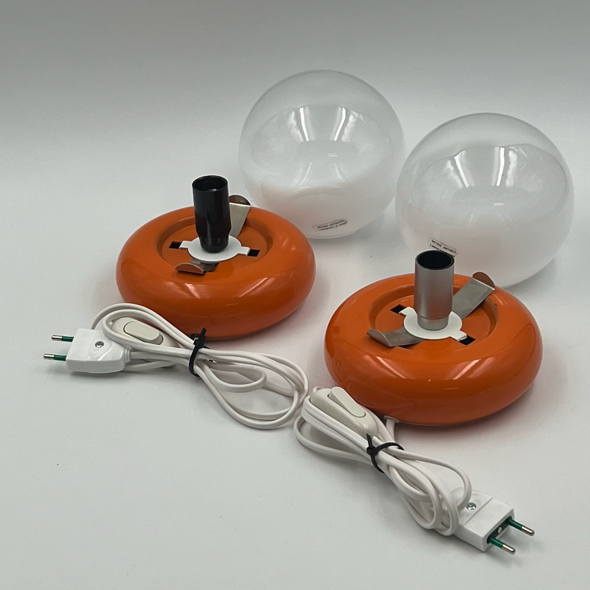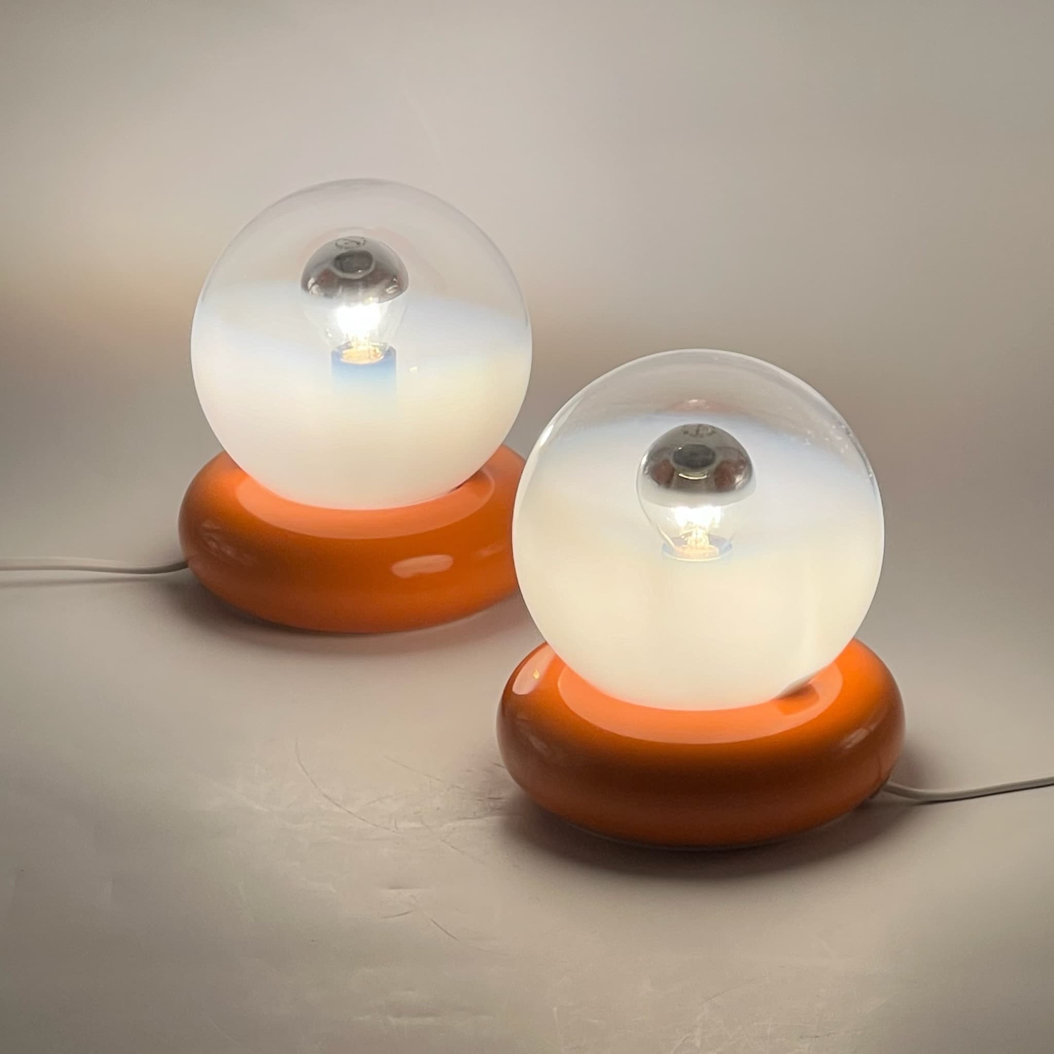 Exquisite pair of vintage Targetti Sankey table lamps, showcasing a unique blend of vibrant orange metal bases and handcrafted artistic glass spheres.