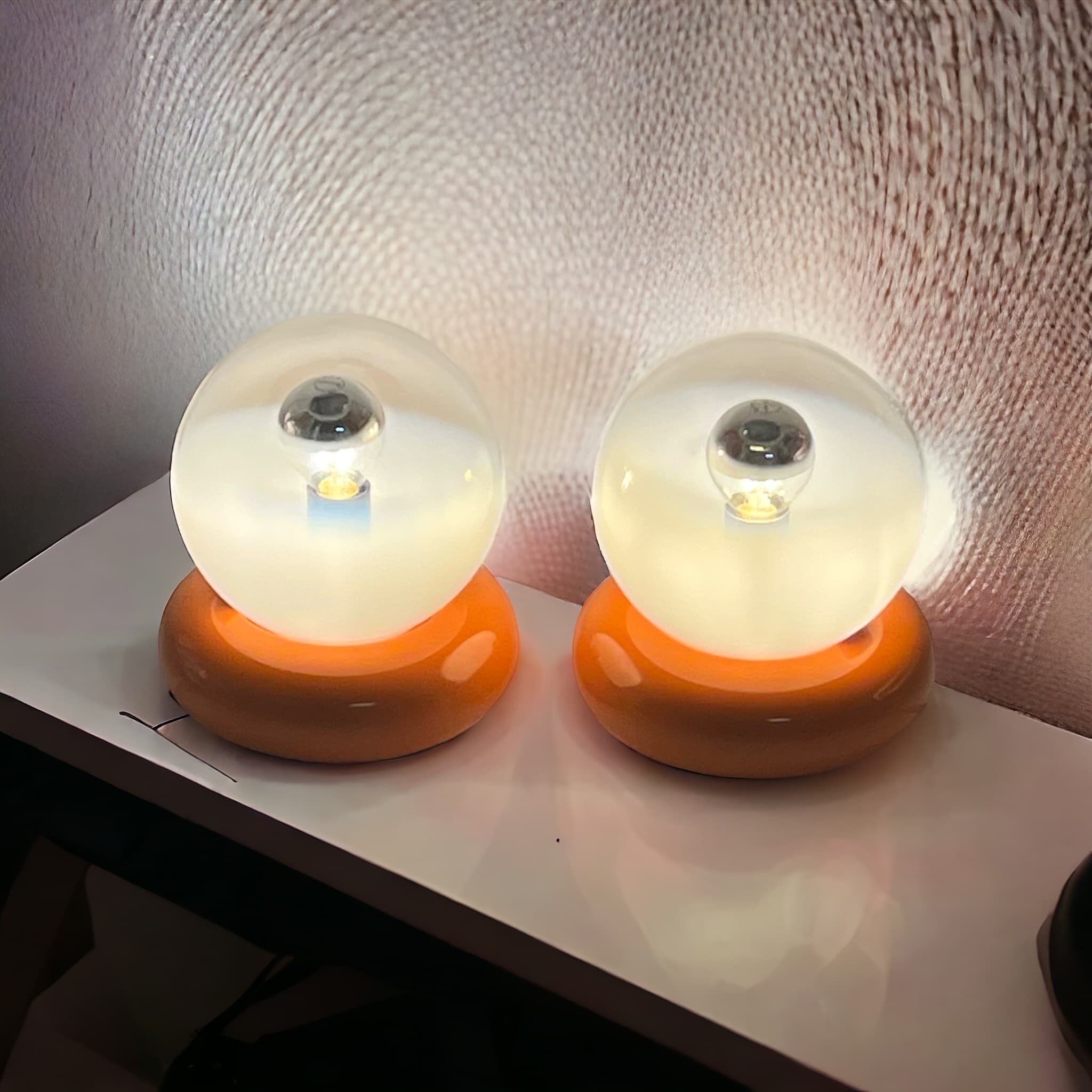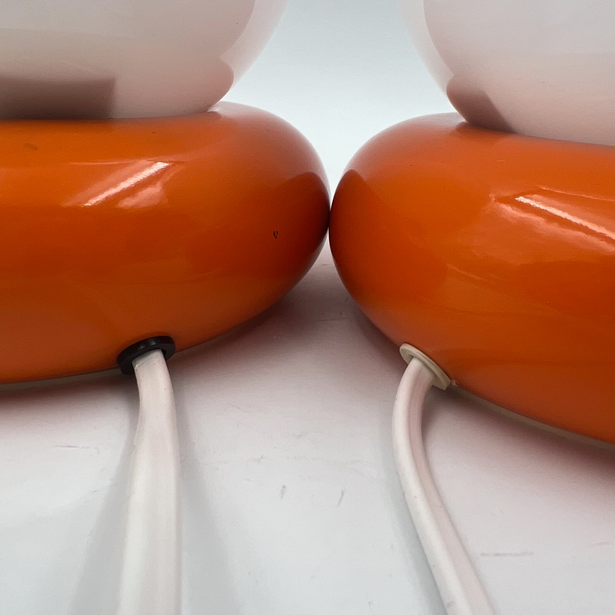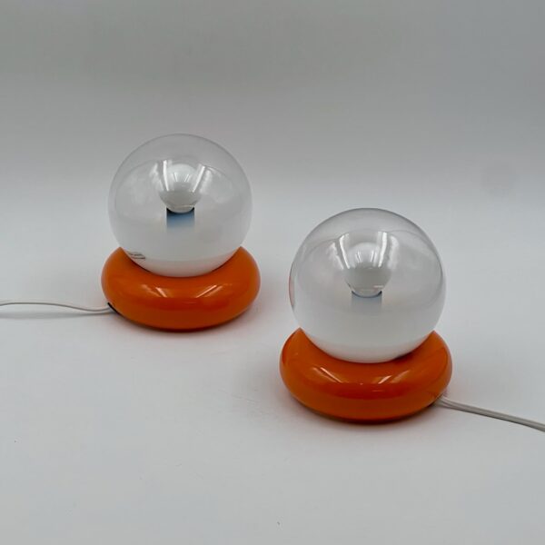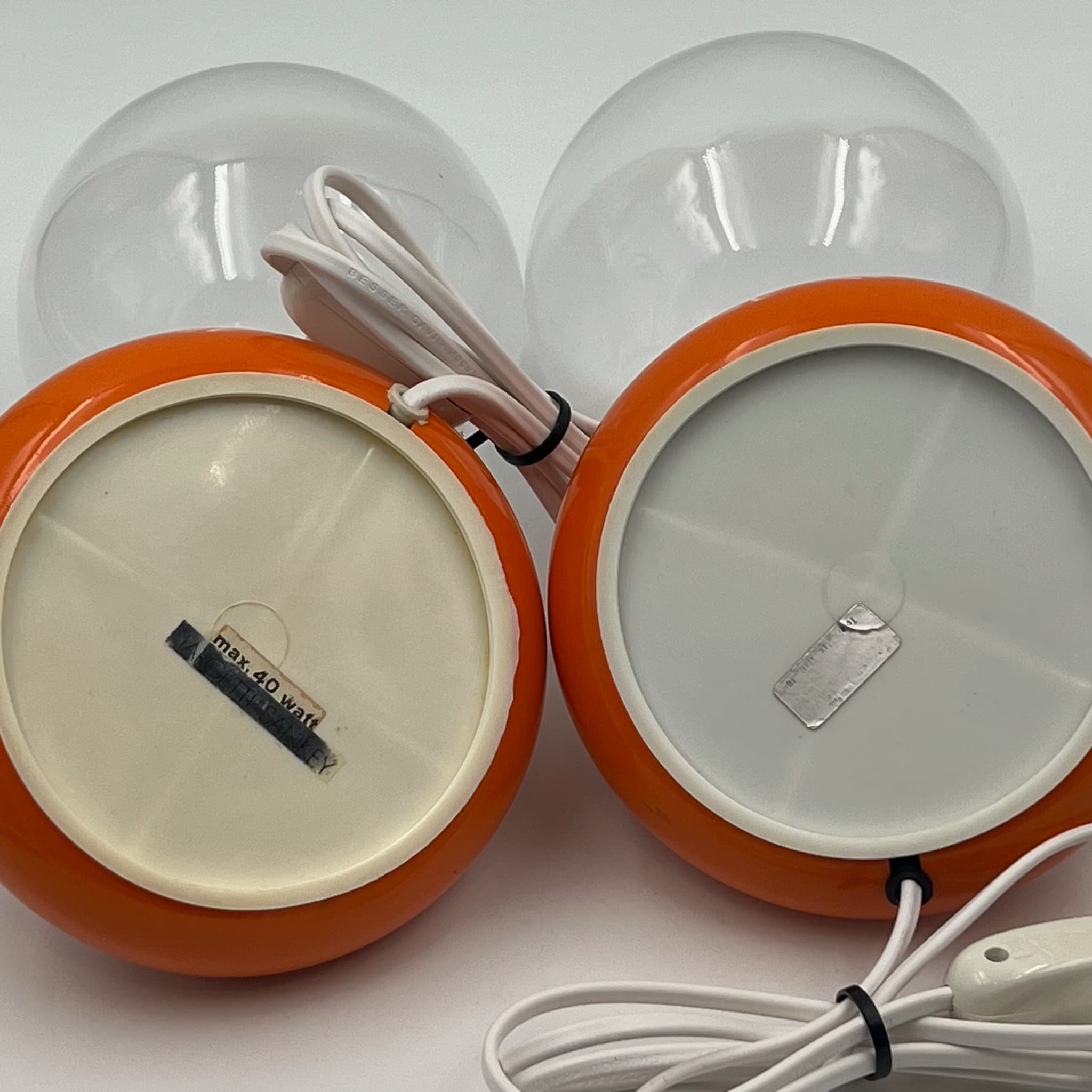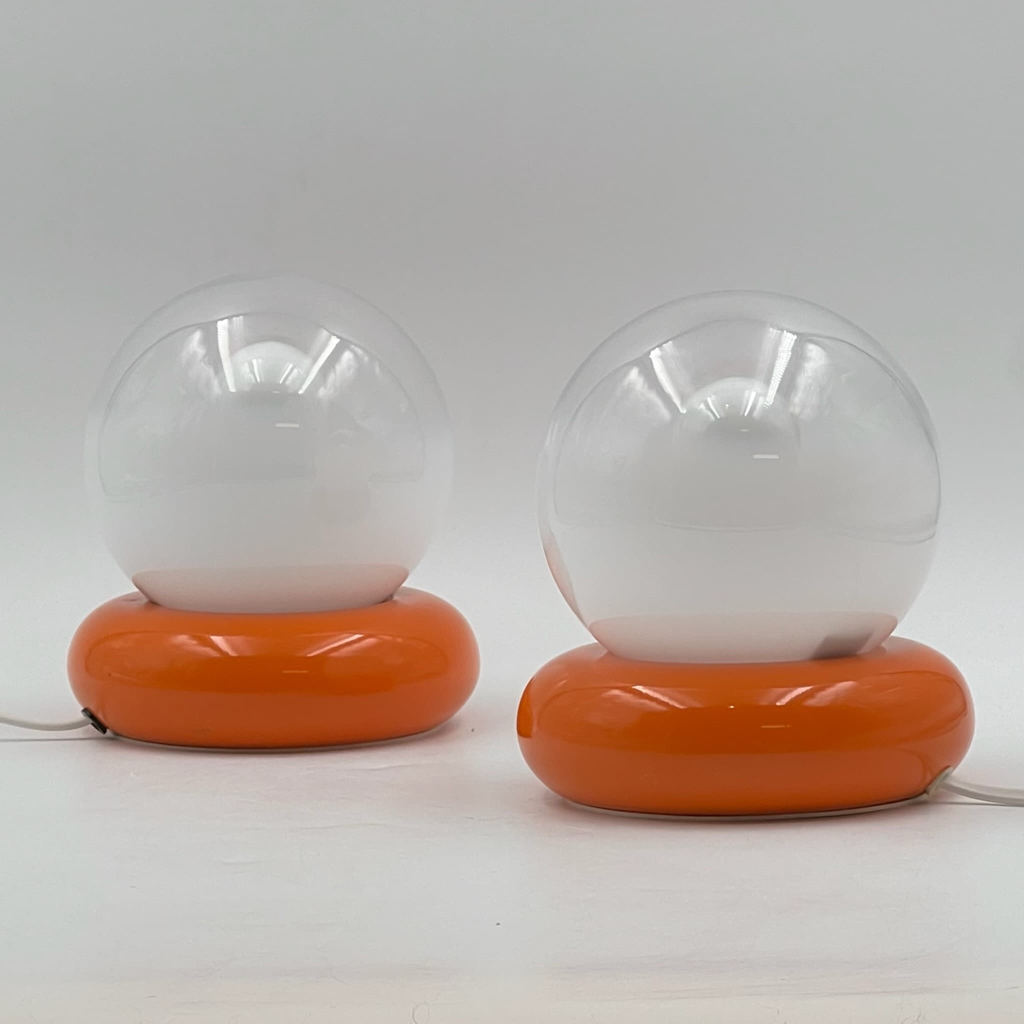 Spruce up your space with this exquisite pair of vintage Targetti Sankey table lamps, showcasing a unique blend of vibrant orange metal bases and handcrafted artistic glass spheres. The glass globes are transparent with subtle white shading, creating a captivating visual effect when illuminated.