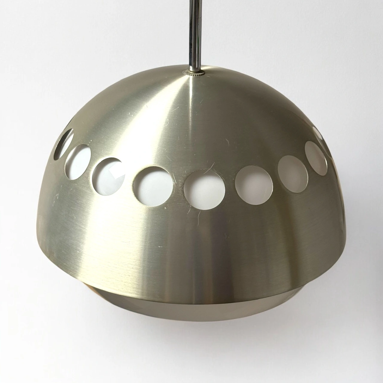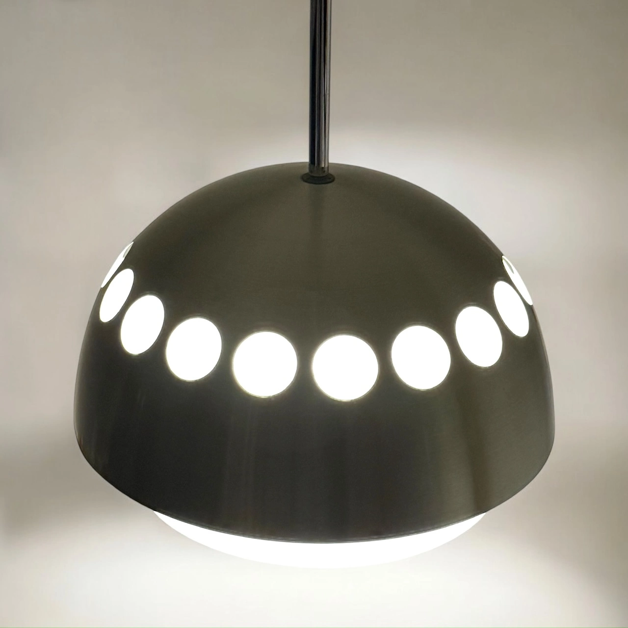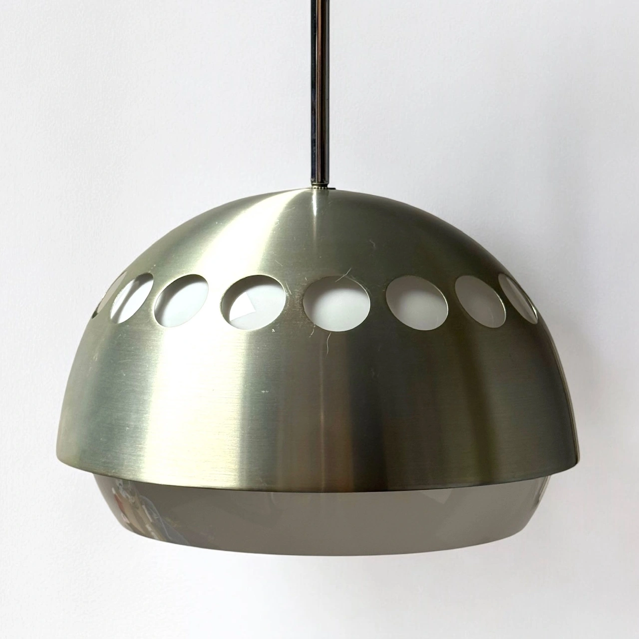 Amazing 70s UFO lamp from Italy. Space Age design hanging light in brushed metal and ABS, perfect for vintage or Mid-Century interiors. A true retro-futuristic statement.