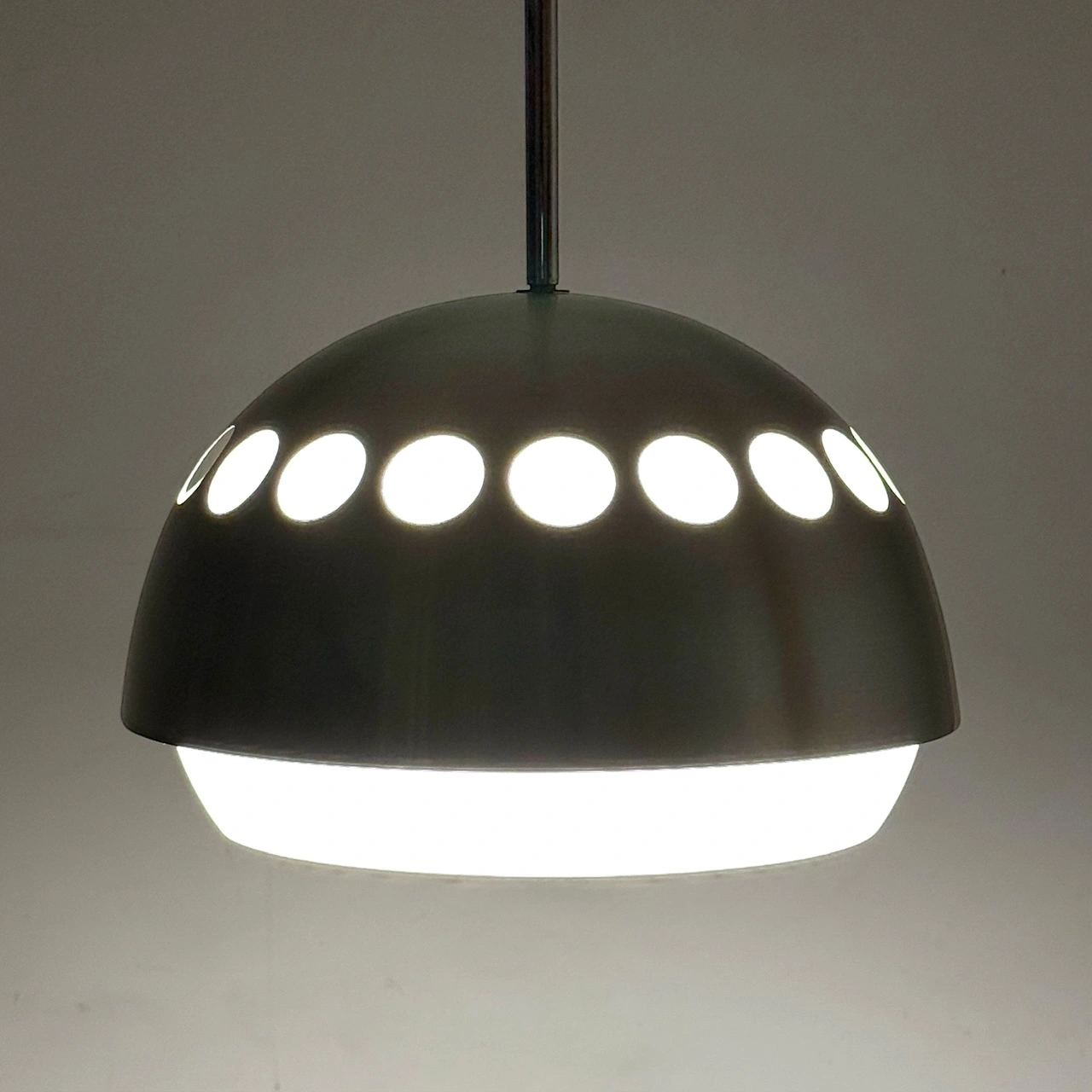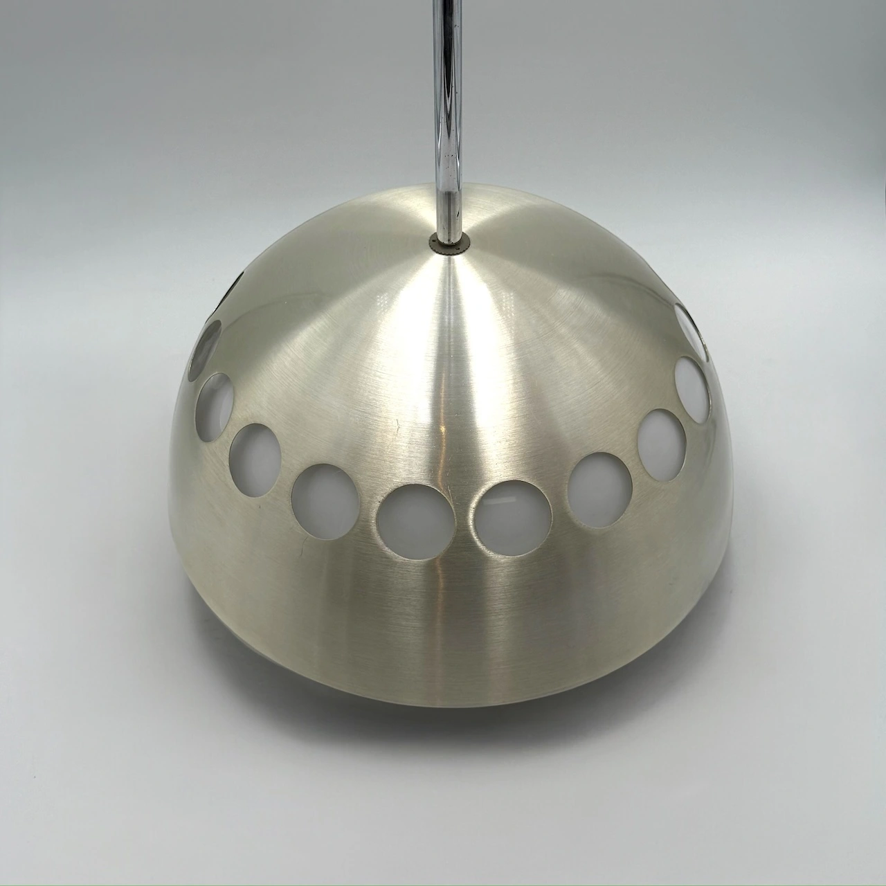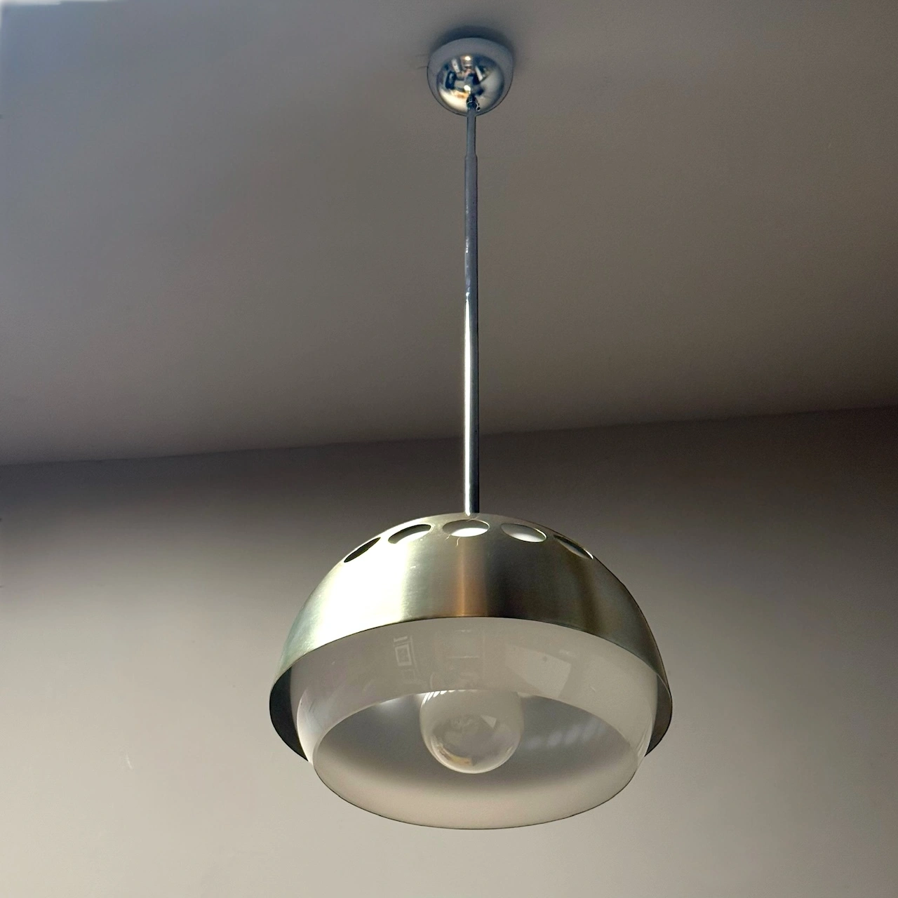 Amazing 70s UFO lamp from Italy. Space Age design hanging light in brushed metal and ABS, perfect for vintage or Mid-Century interiors. A true retro-futuristic statement.