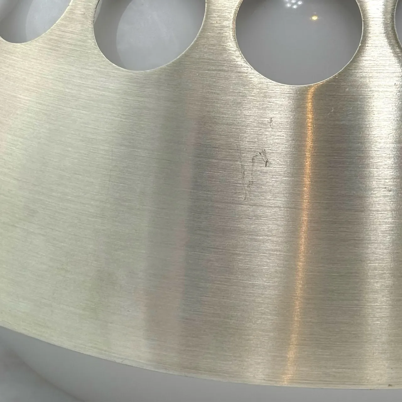 Crafted from brushed metal and ABS, its domed silver shade features circular cutouts that cast a unique light pattern, evoking the retro-futuristic aesthetic of a flying saucer. The white diffuser below softens the illumination, creating a warm yet modern ambiance.