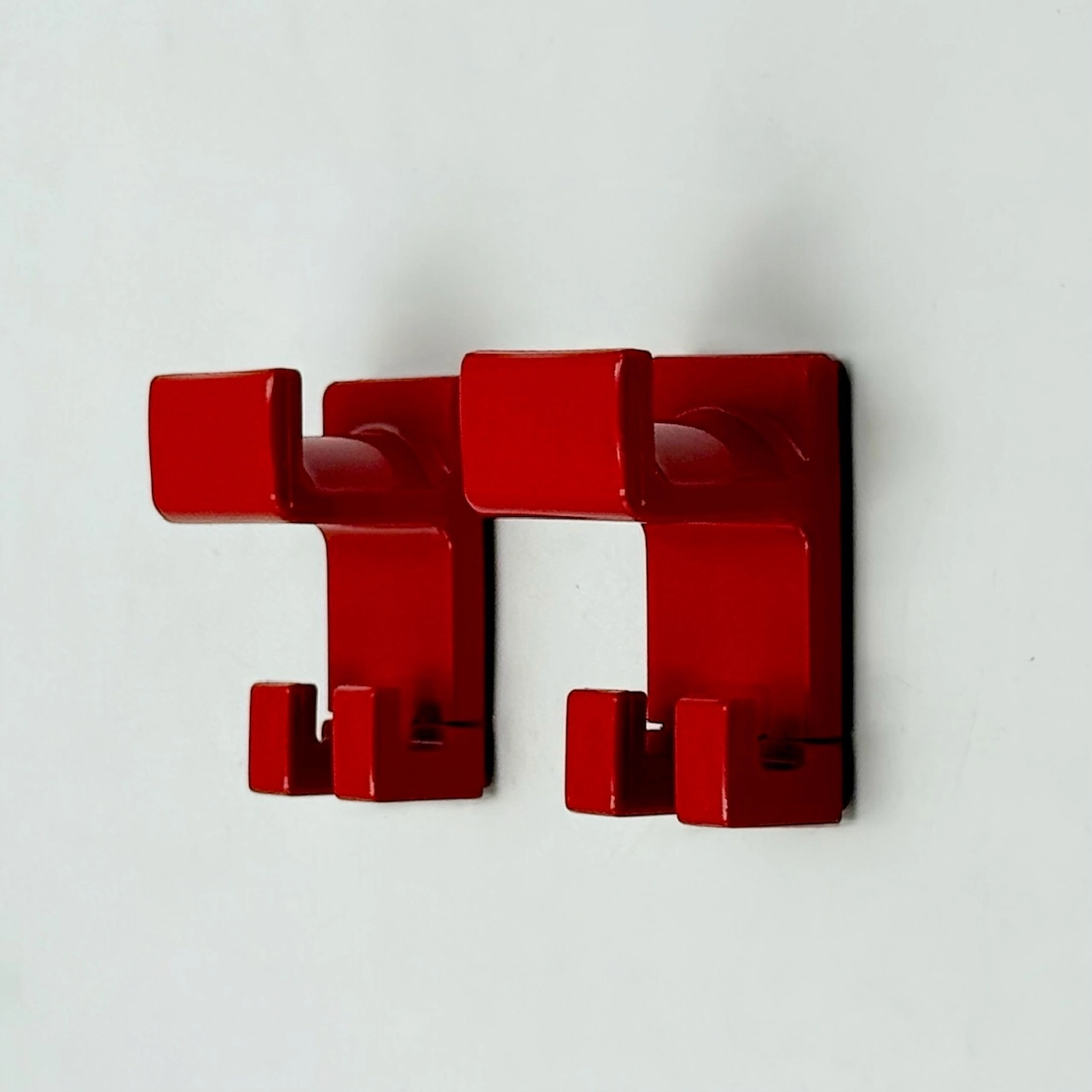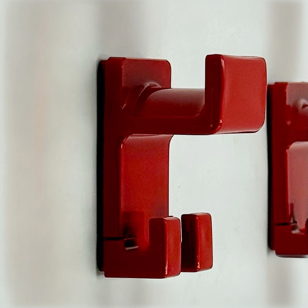 These vintage wall hooks were designed by Japanese designer Makio Hasuike for the Italian company Gedy in the late 1970s and early 1980s, a period that celebrated bold colors and functional plastic design. Their glossy red finish immediately recalls the vibrant energy of the Space Age era, while the compact form demonstrates Hasuike’s focus on essential utility paired with sculptural simplicity.