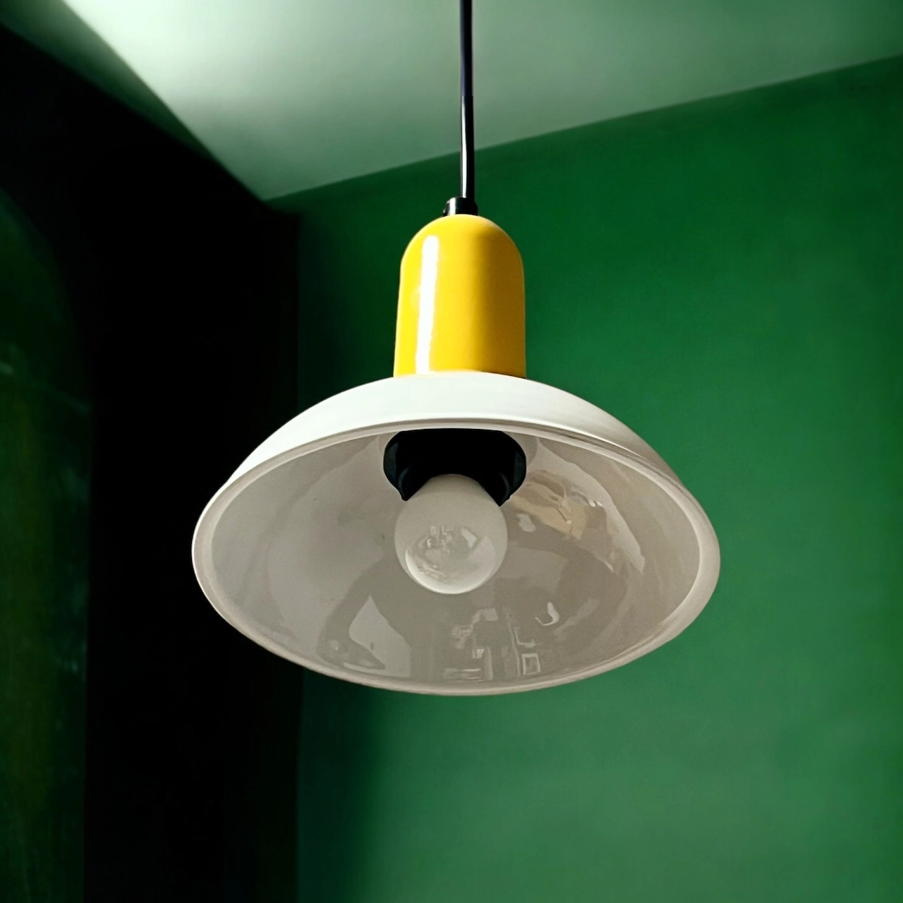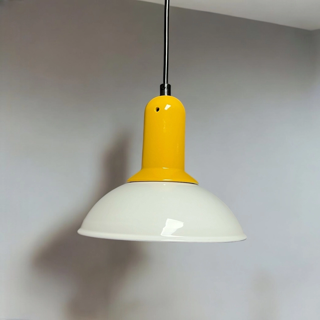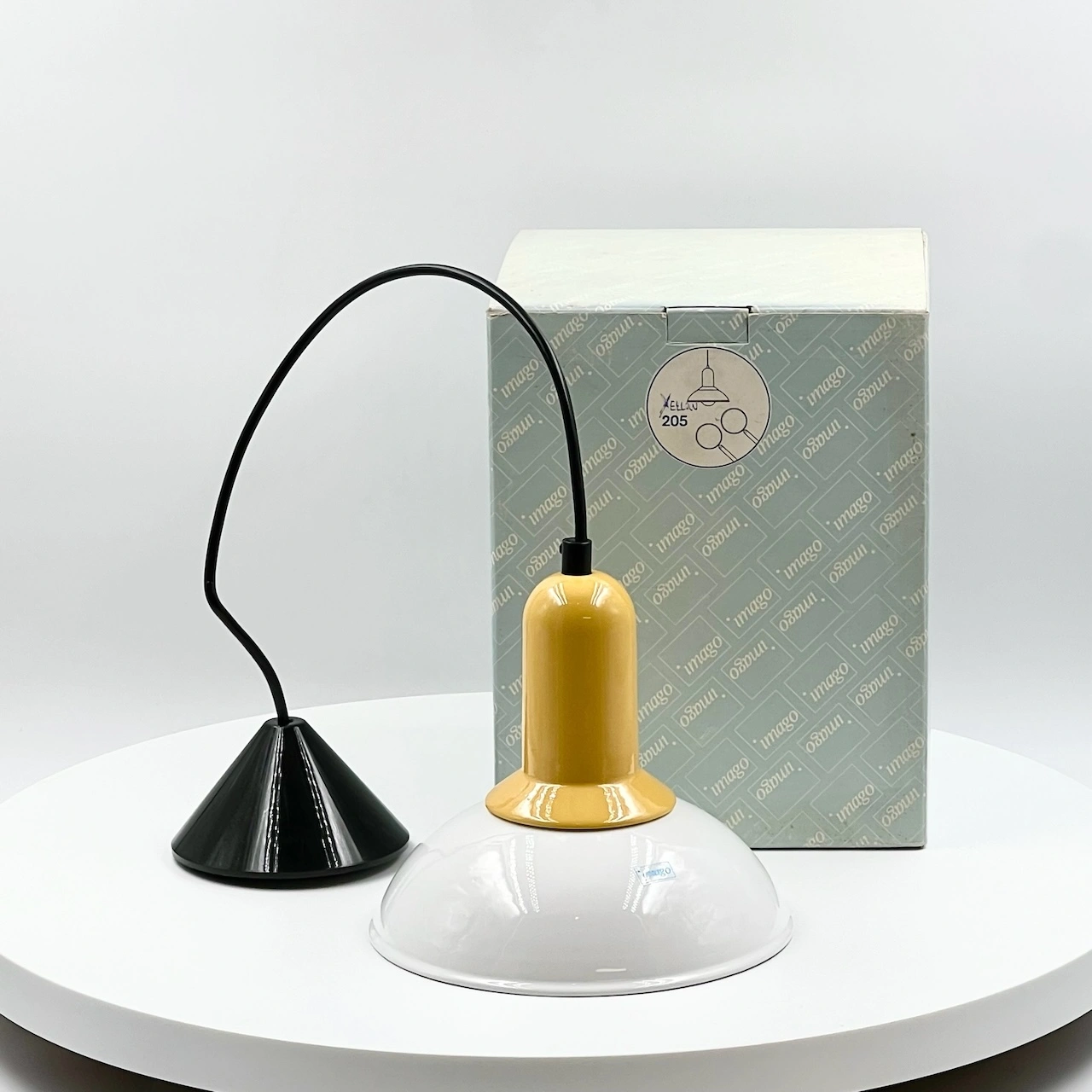 item. hanging lampmaker. Imagoperiod. 1980scountry. Italymaterial. ceramic, plasticcolor. white, yellowdimensions (cm). 20 x 20 x 20.5 H. total length with cable 110 cm.conditions. excellent. new old stock.art. no. 1514